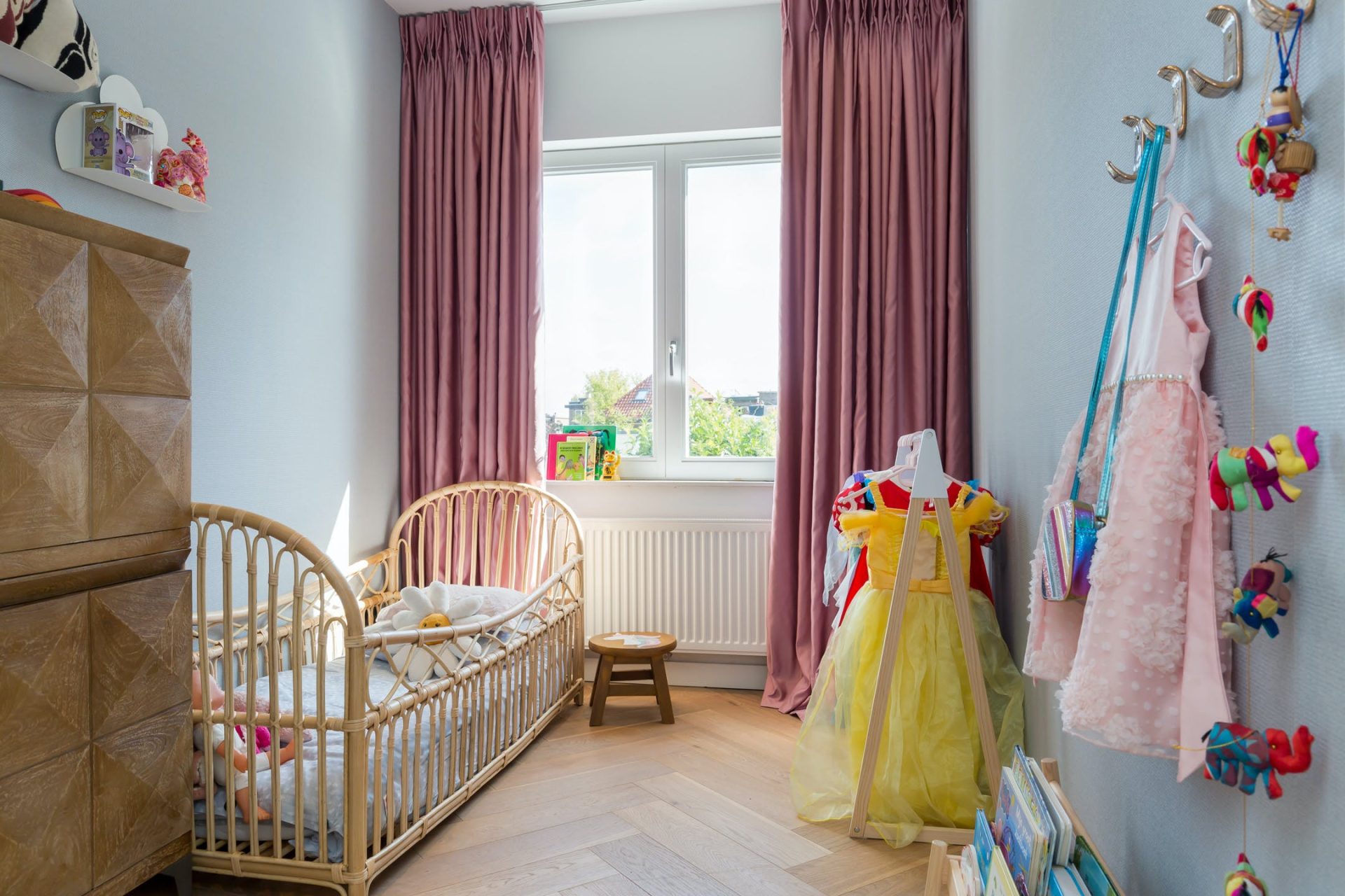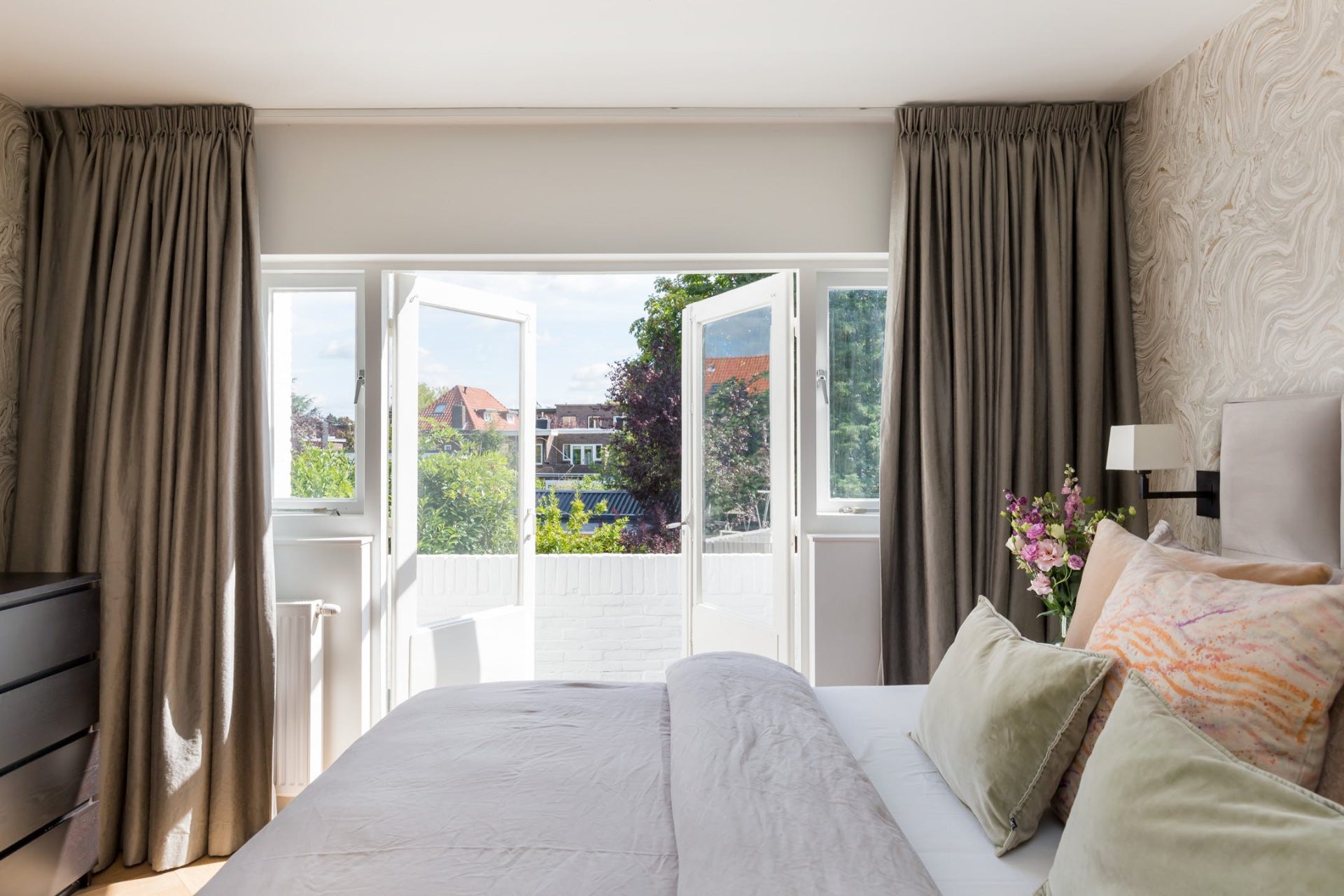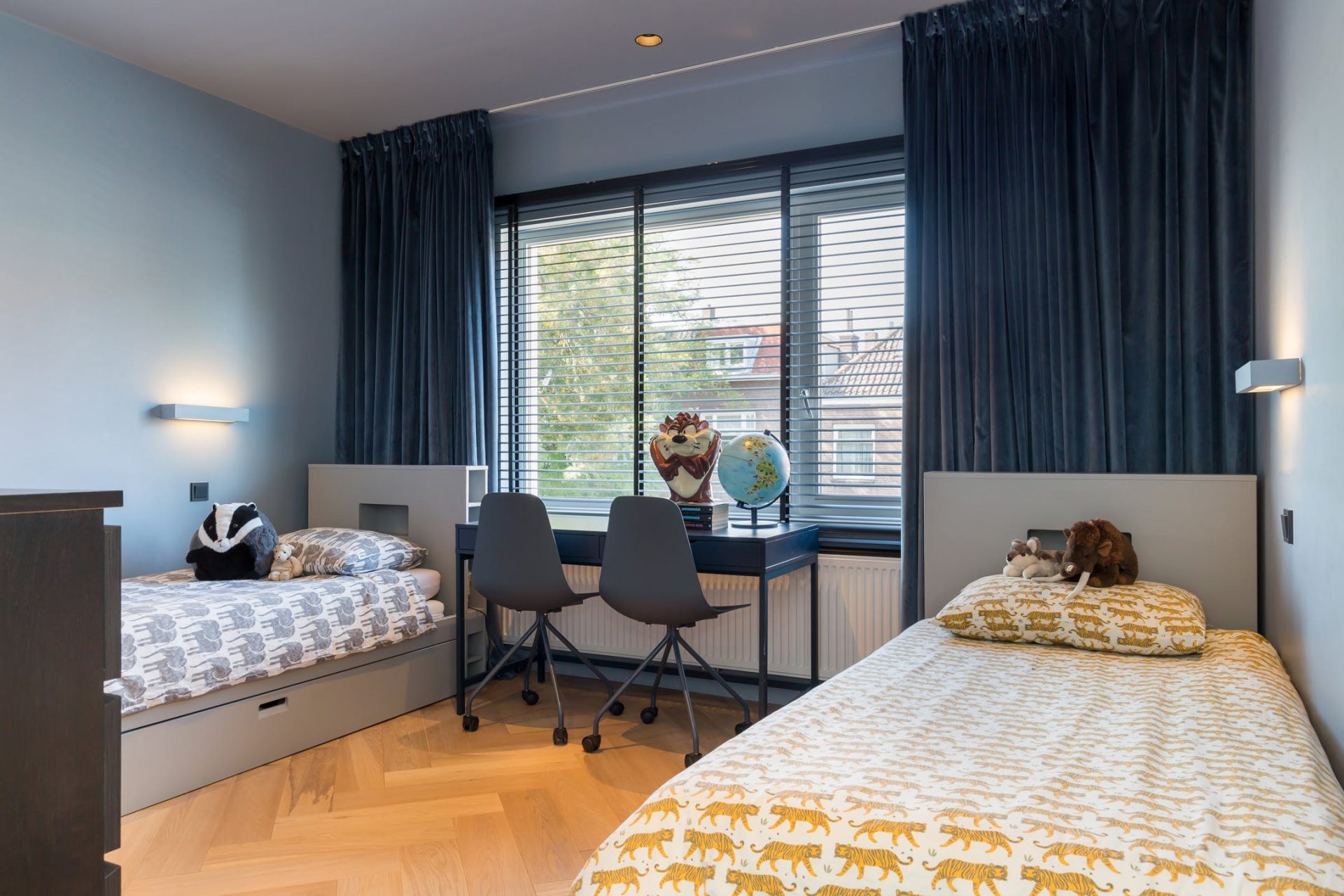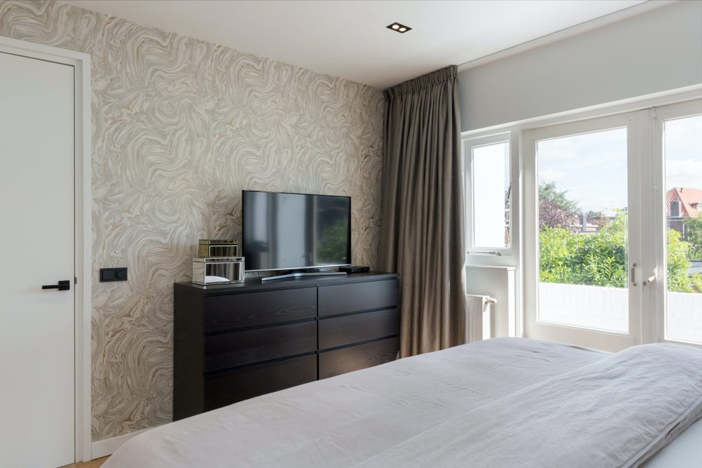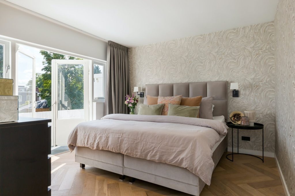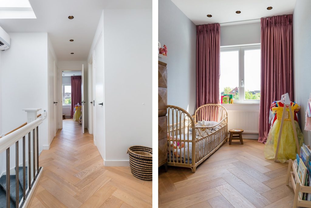 Aan de achterzijde is de stijlvolle hoofdslaapkamer met openslaande deuren naar het balkon en prachtig patroonbehang, gecombineerd met stucwerk. Aan de voorzijde is een zeer ruime tweepersoons kinderkamer en de andere kamers zijn ingericht als kinderkamer en kastenkamer. In alle slaapkamers ligt dezelfde visgraatvloer als in de hal en zorgen de mooie kleuren voor een aangename sfeer.