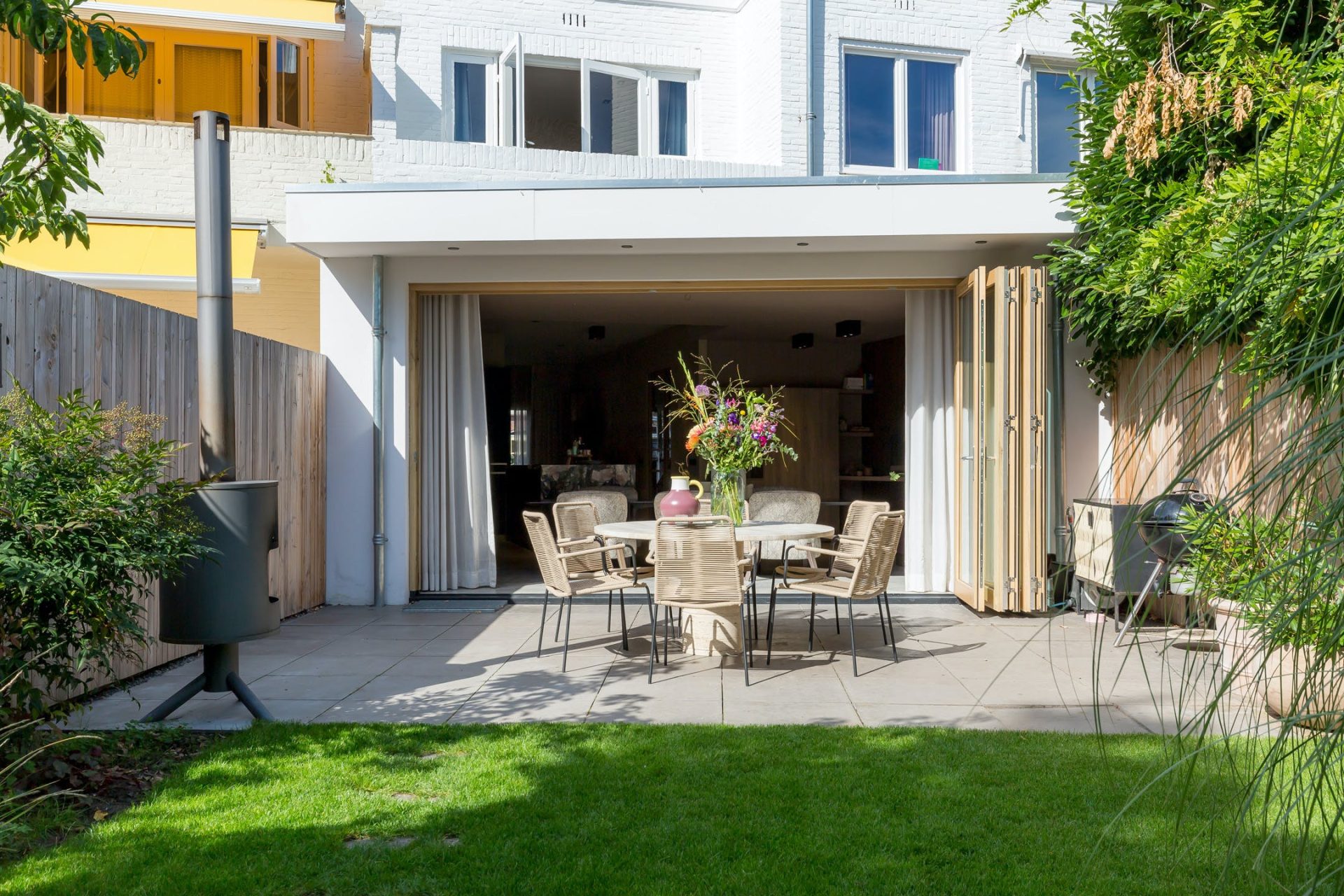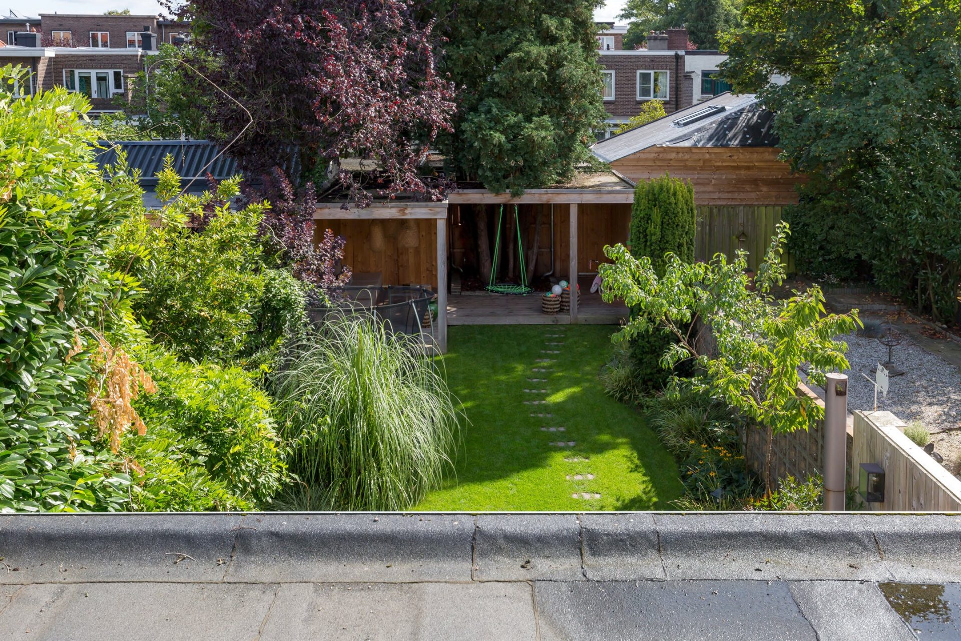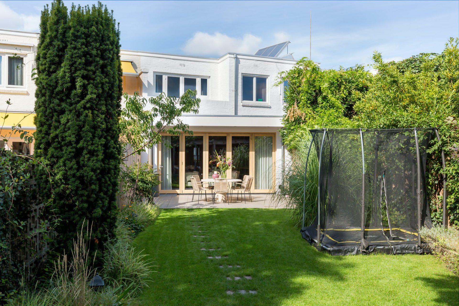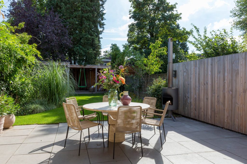 Ondanks de uitbouw heeft de woning een diepe tuin, gesitueerd op het zuidoosten. Via de harmonicapui in de woonkamer stap je het terras op, voorzien van een brede dakoverstek. Stapstenen in het gras brengen je naar het overdekte terras aan de achterzijde waar je tot in de avonduren van de zon kunt genieten. De mooie boom is behouden waardoor het overdekte terras om de boom heen is gebouwd en er is een poort naar de steeg. In het middelste deel van de tuin zie je een mooi grasveld en brede borders, voorzien van een prachtige compositie aan planten en struiken.