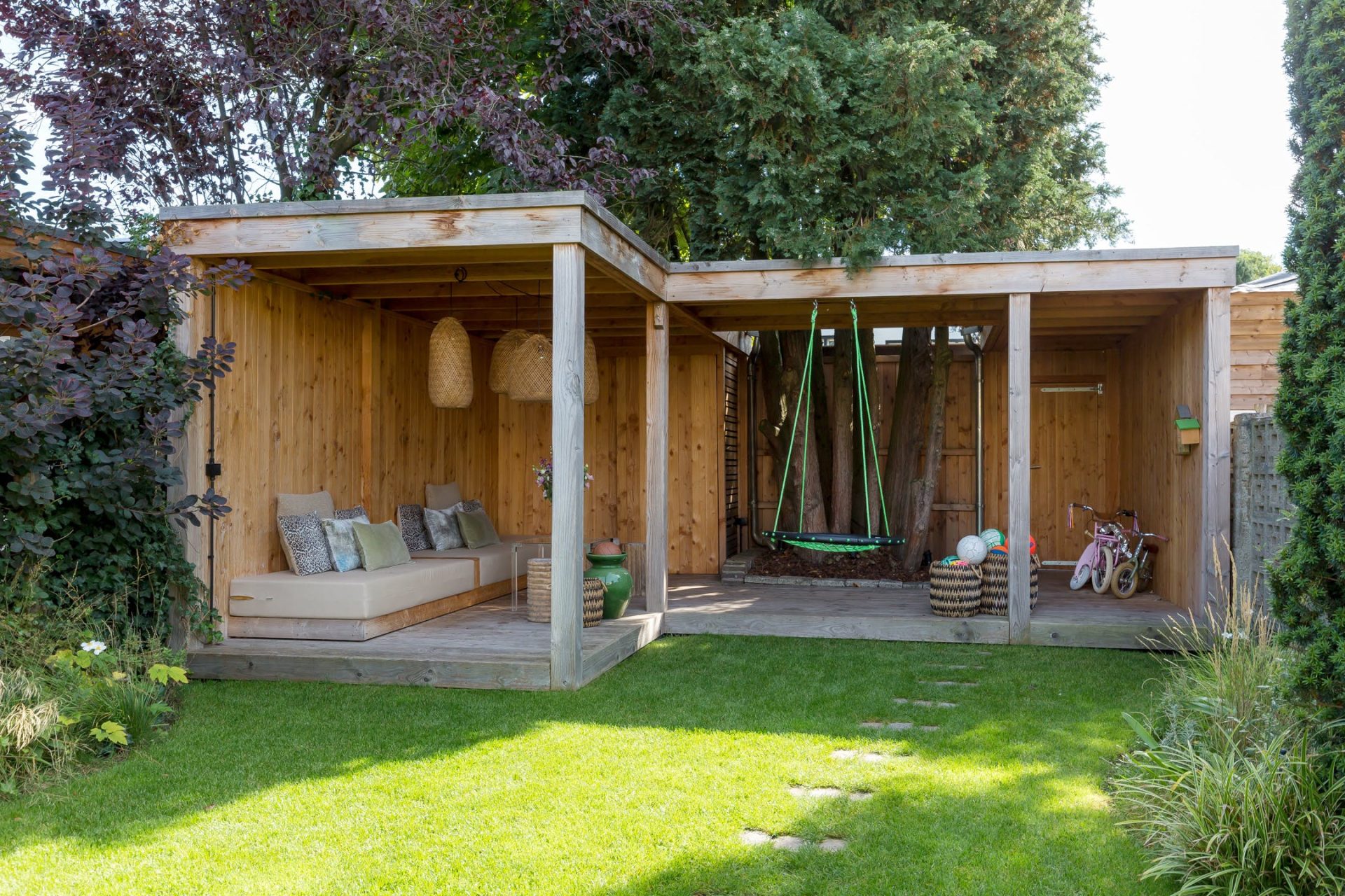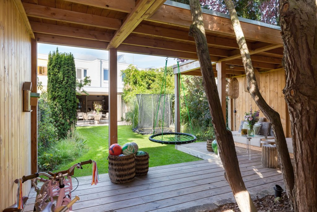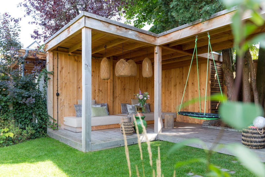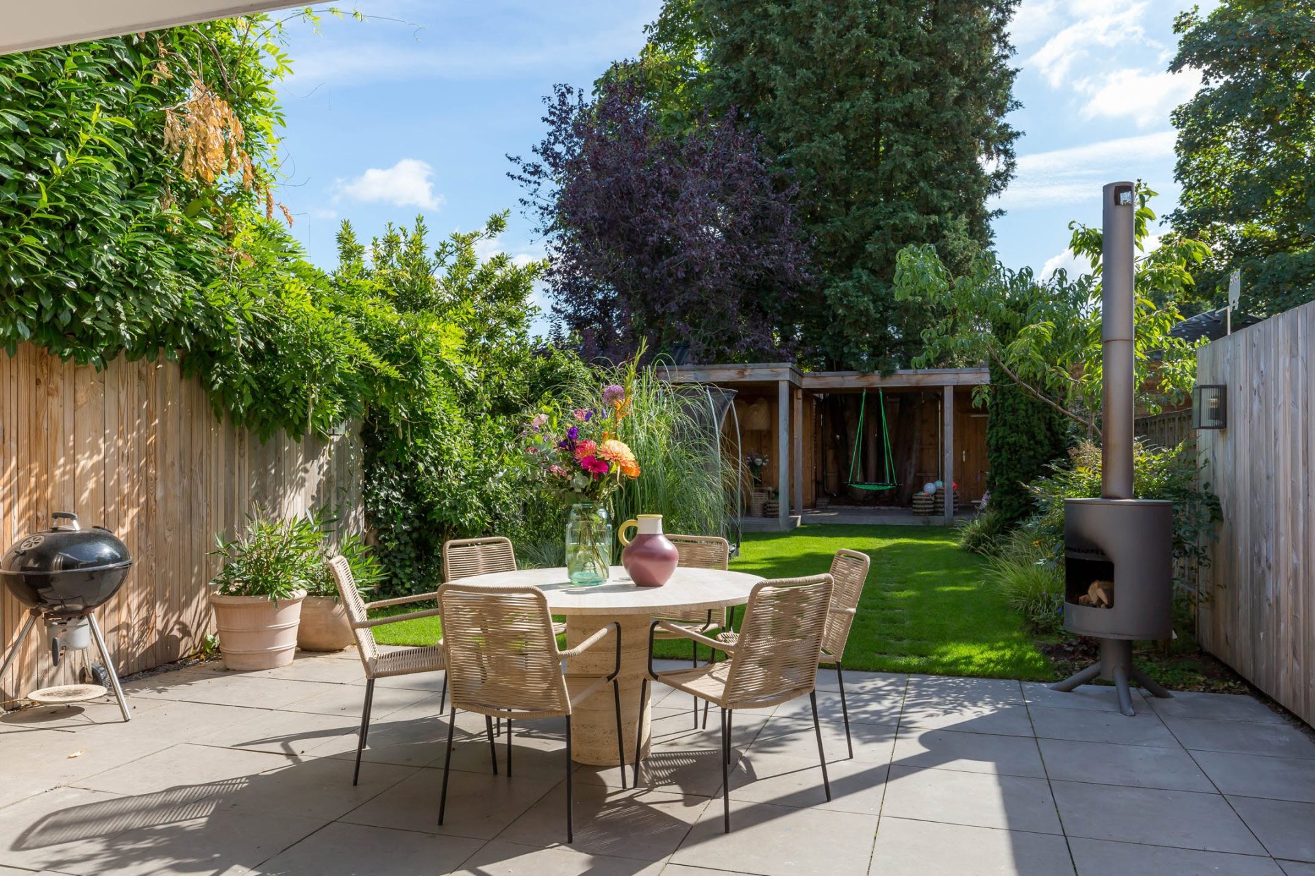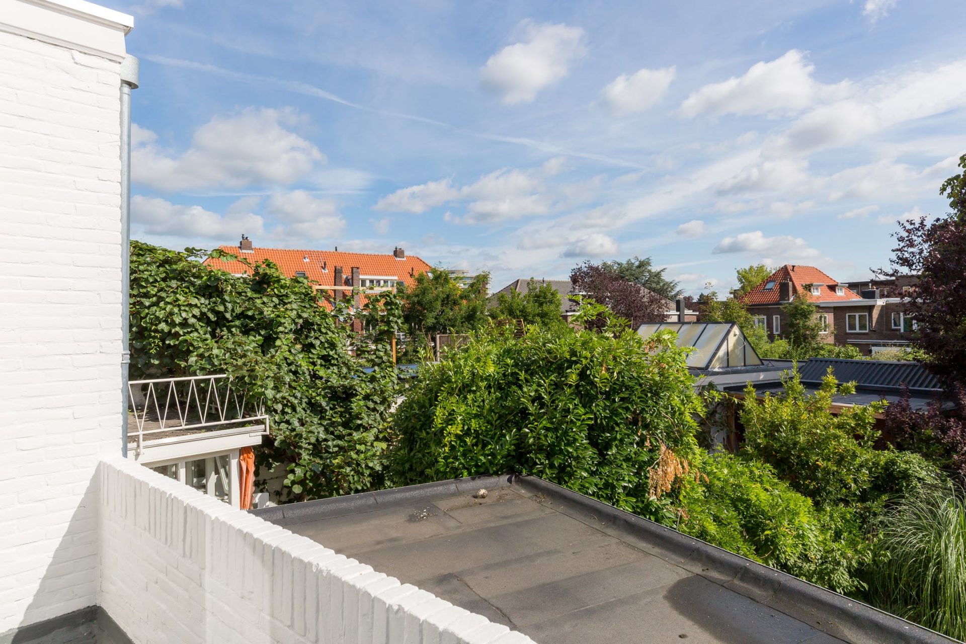 Ondanks de uitbouw heeft de woning een diepe tuin, gesitueerd op het zuidoosten. Via de harmonicapui in de woonkamer stap je het terras op, voorzien van een brede dakoverstek. Stapstenen in het gras brengen je naar het overdekte terras aan de achterzijde waar je tot in de avonduren van de zon kunt genieten. De mooie boom is behouden waardoor het overdekte terras om de boom heen is gebouwd en er is een poort naar de steeg. In het middelste deel van de tuin zie je een mooi grasveld en brede borders, voorzien van een prachtige compositie aan planten en struiken.