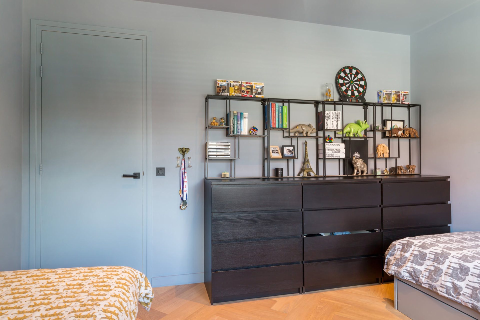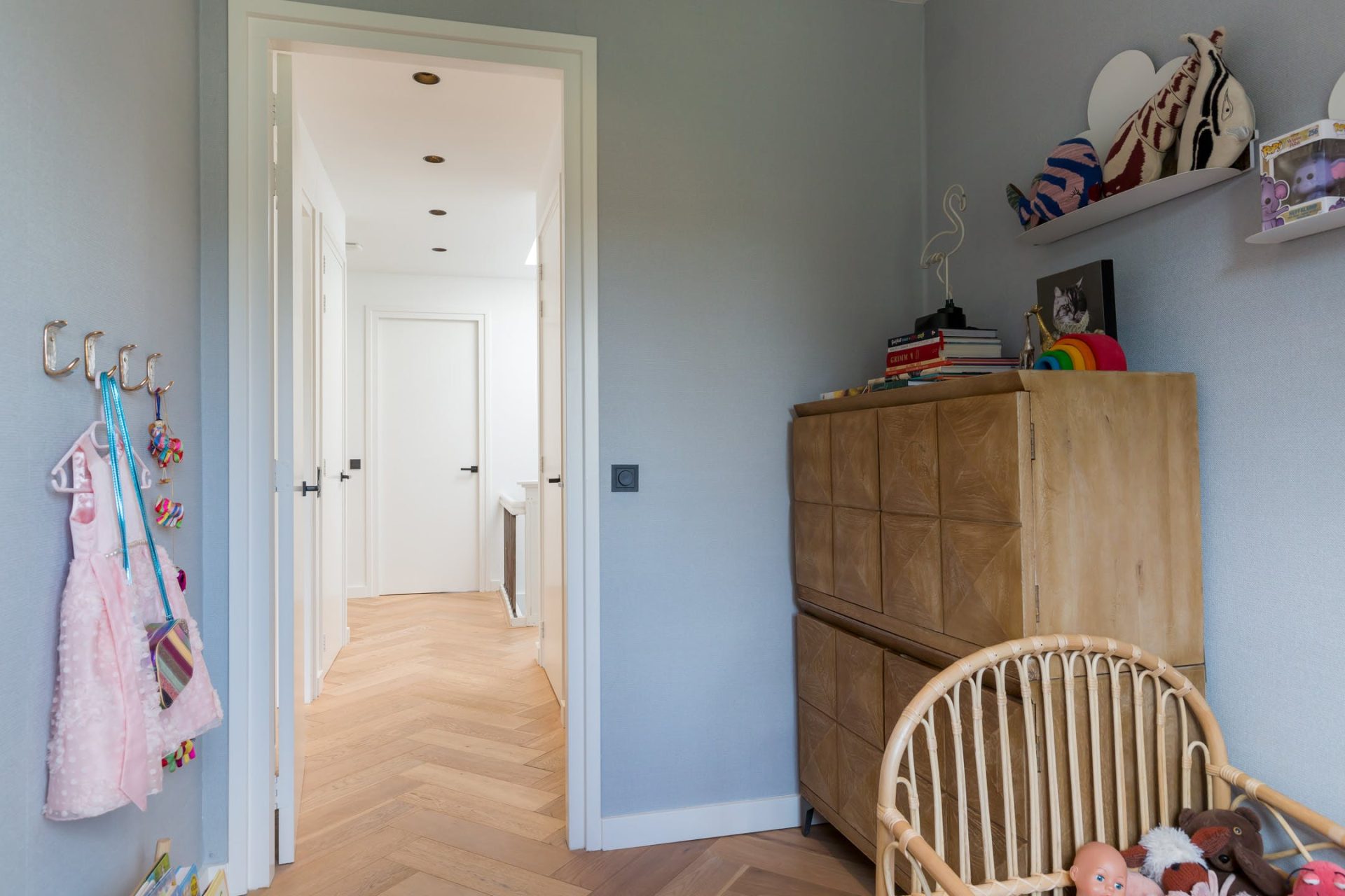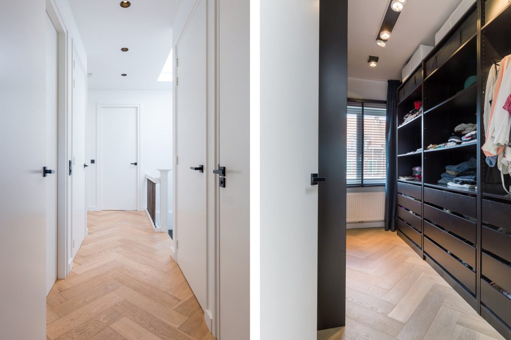 Achter de vernieuwde deuren met zwarte handgrepen gaan vier slaapkamers, de badkamer, cv-ruimte, wasruimte en het tweede toilet schuil.