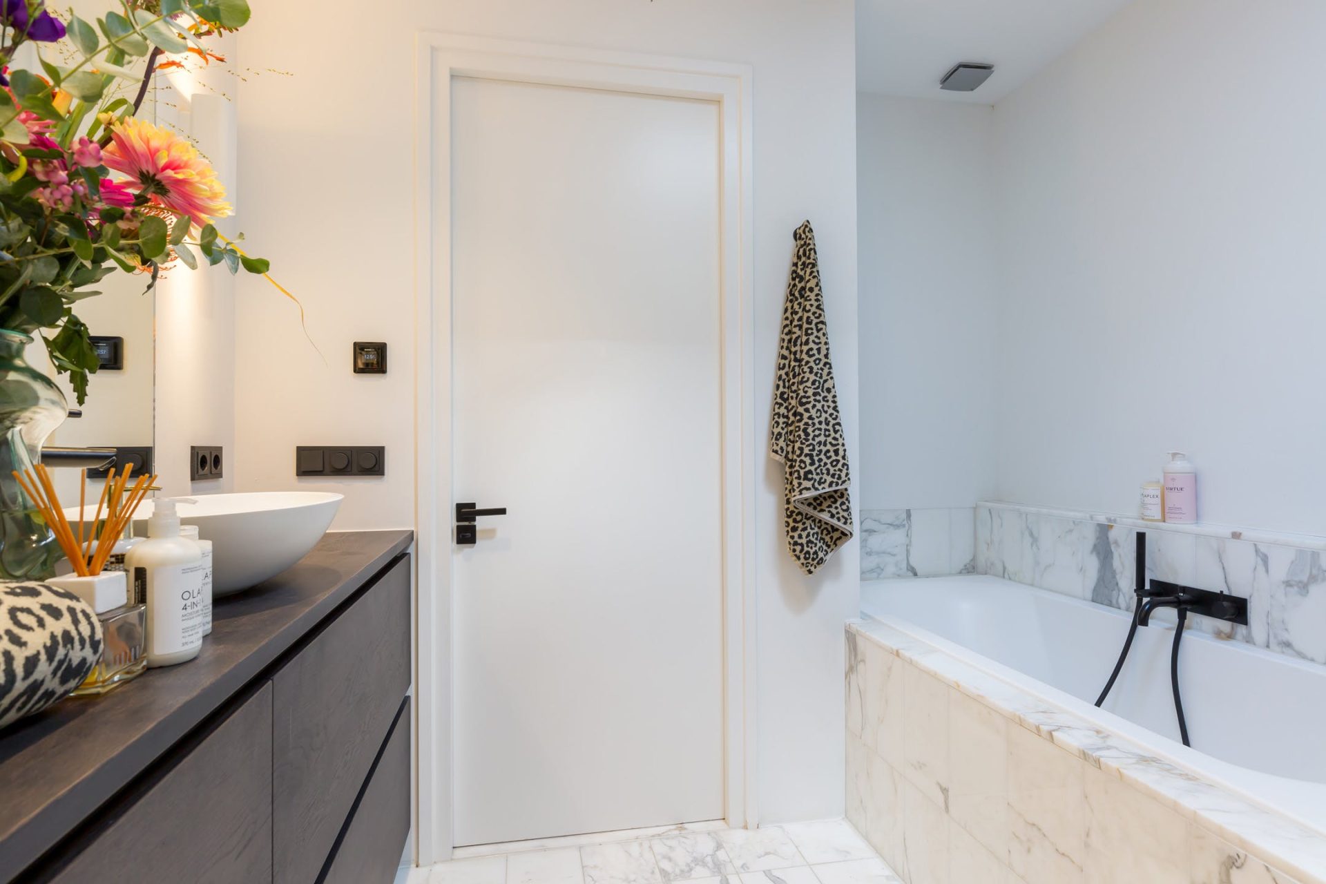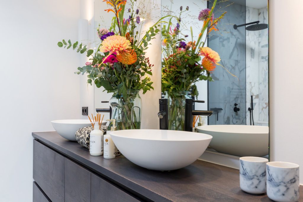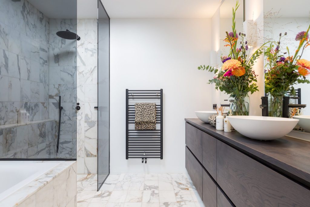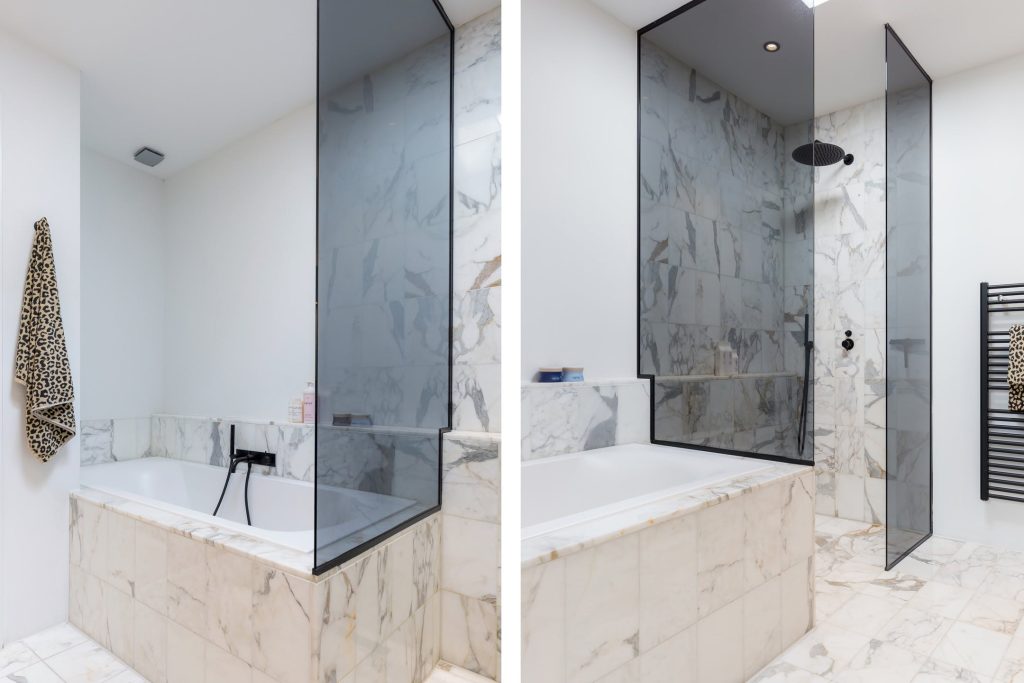 De badkamer lijkt zo uit een woonmagazine te komen. Door de lichtkoepel valt veel licht naar binnen en de ruimte is ingedeeld met een ligbad, inloopdouche, handdoekradiator en een op maat gemaakt wastafelmeubel waar twee waskommen op staan. Tot in detail klopt deze badkamer: een regendouche, zwarte kranen, glazen douchewand met zwart profiel en de hoge spiegels spreken tot de verbeelding. De tegelvloer is uitgerust met een elektrische vloerverwarming.