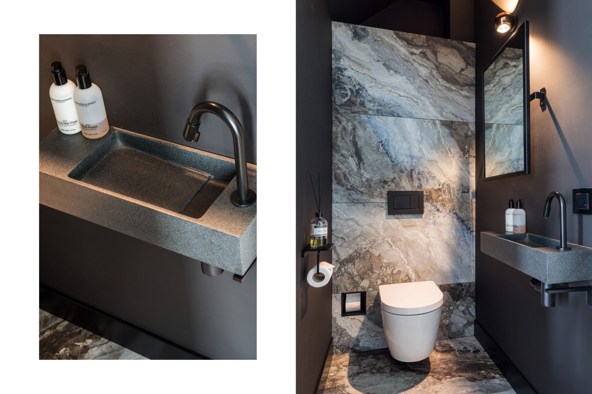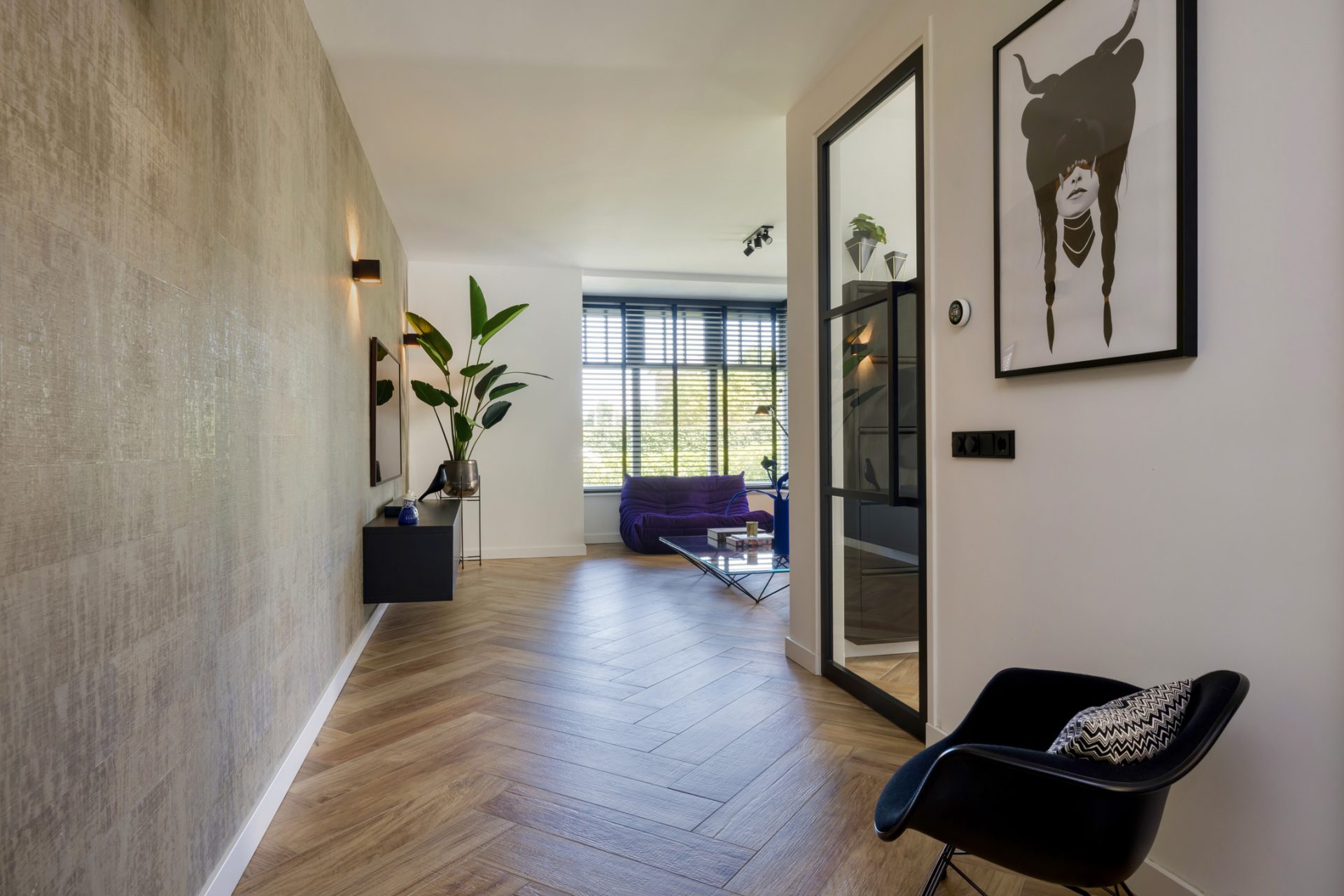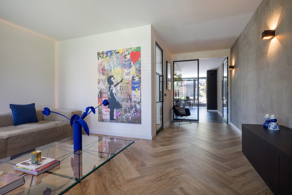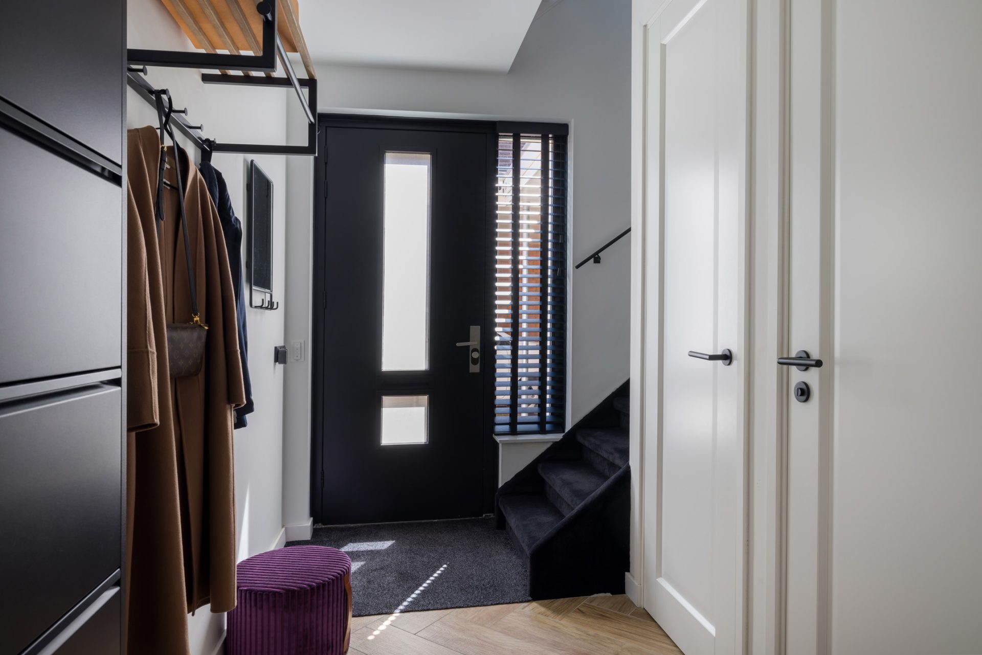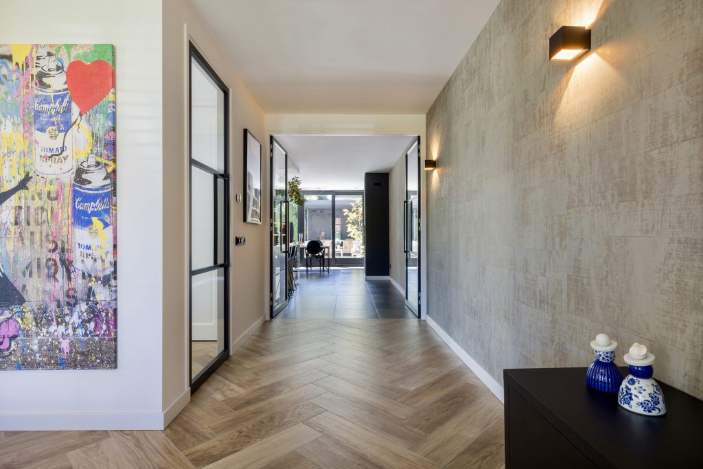 Aan de rechterzijde, bij de lange oprit, is de prachtige nieuwe entree van deze top woning. In de hal zijn de meterkast, trapopgang en de nieuwe toiletruimte met fonteintje. Hier merk je direct dat deze woning smaakvol is verbouwd tot een exclusieve woning, met een trendy sfeer en een luxe uitstraling.
