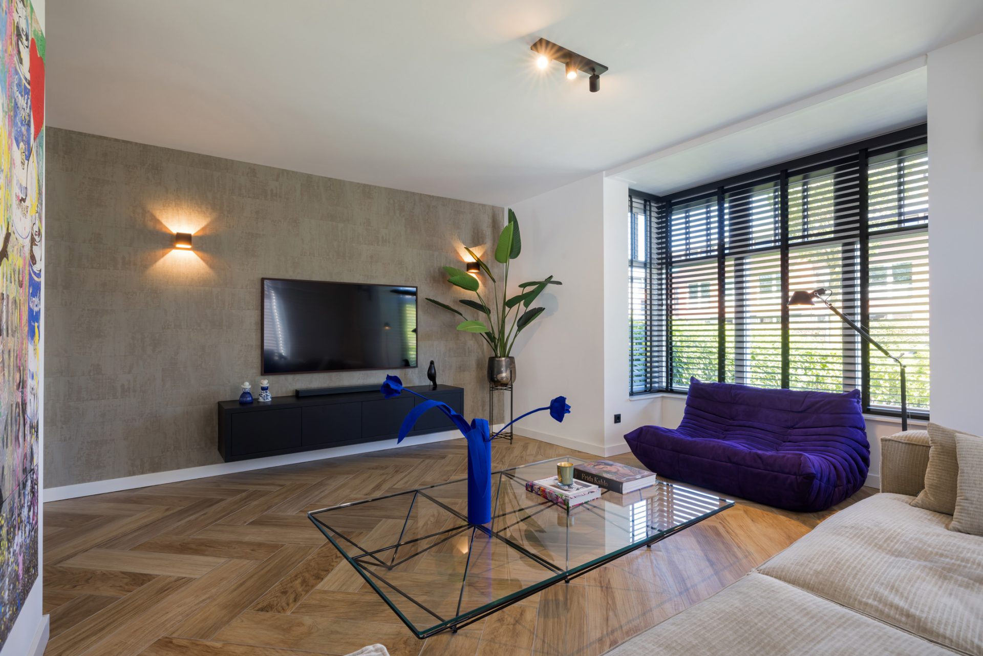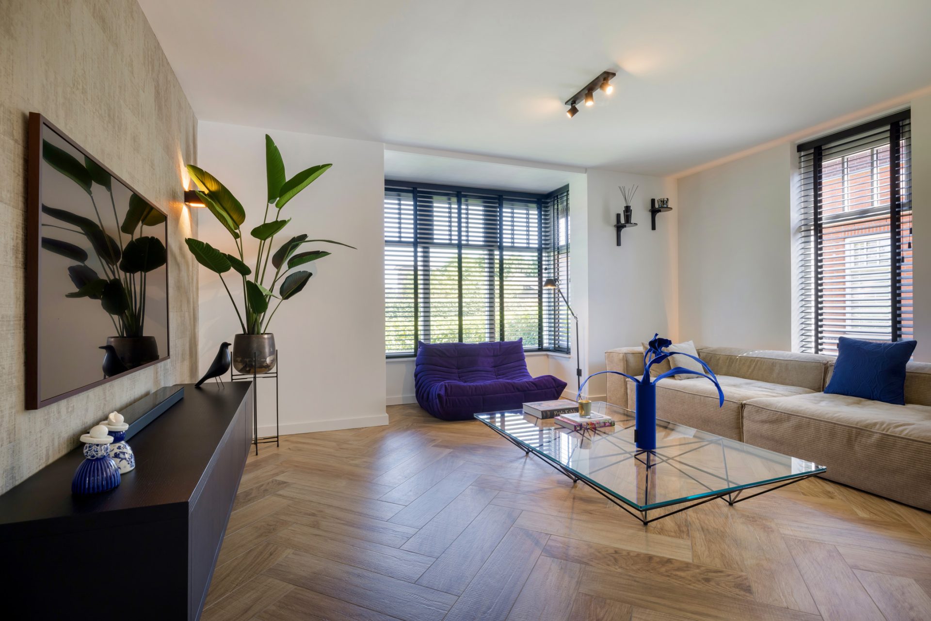 De woonkamer met erker bevindt zich aan de voorzijde, met een mooi uitzicht. Het plafond en de muren zijn gestuct en er ligt vloerverwarming (2020). Doordat de eettafel in de woonkeuken staat, kan deze ruimte geheel als zitkamer worden gebruikt.