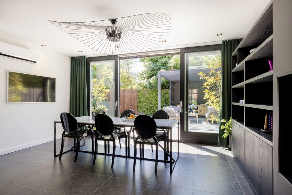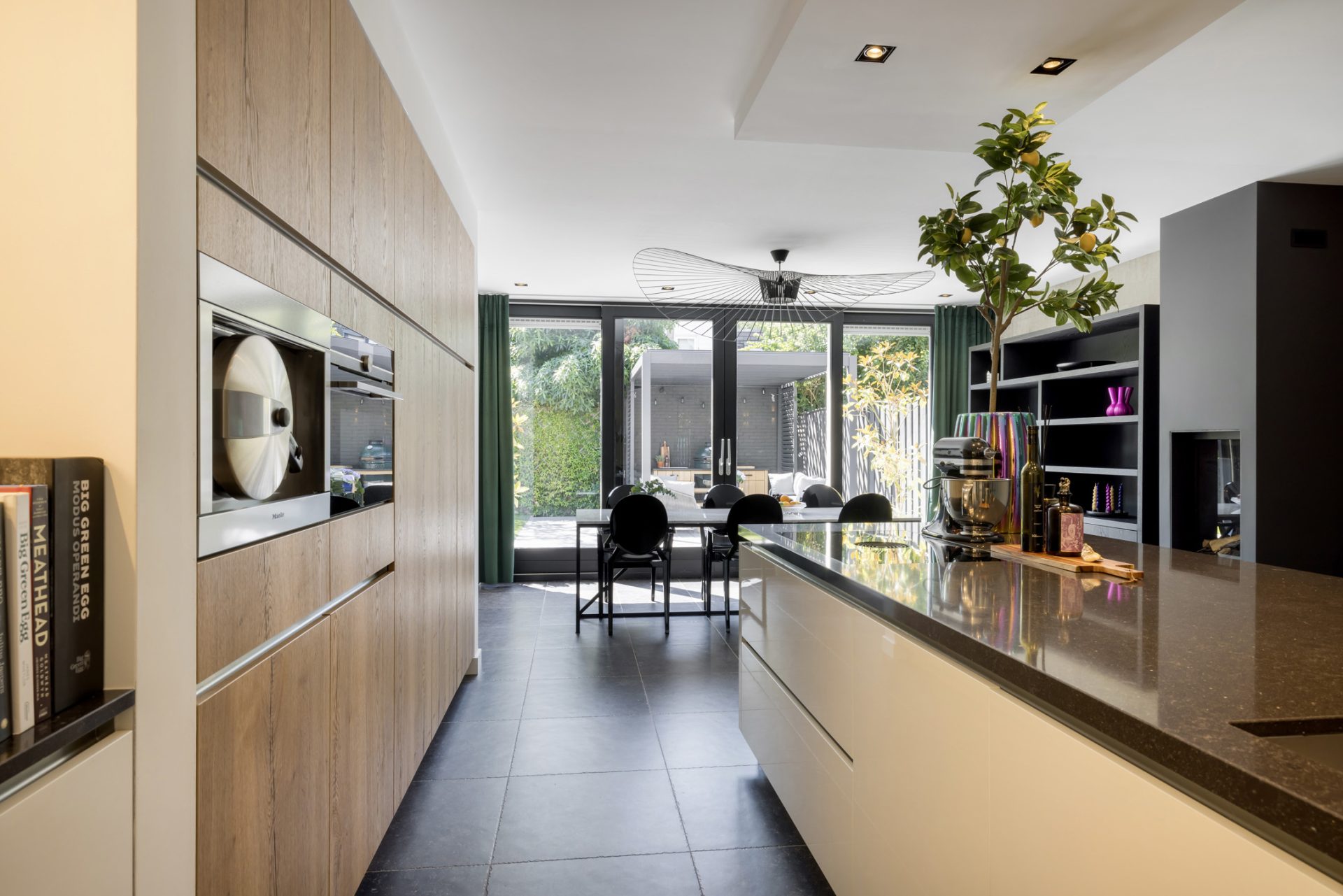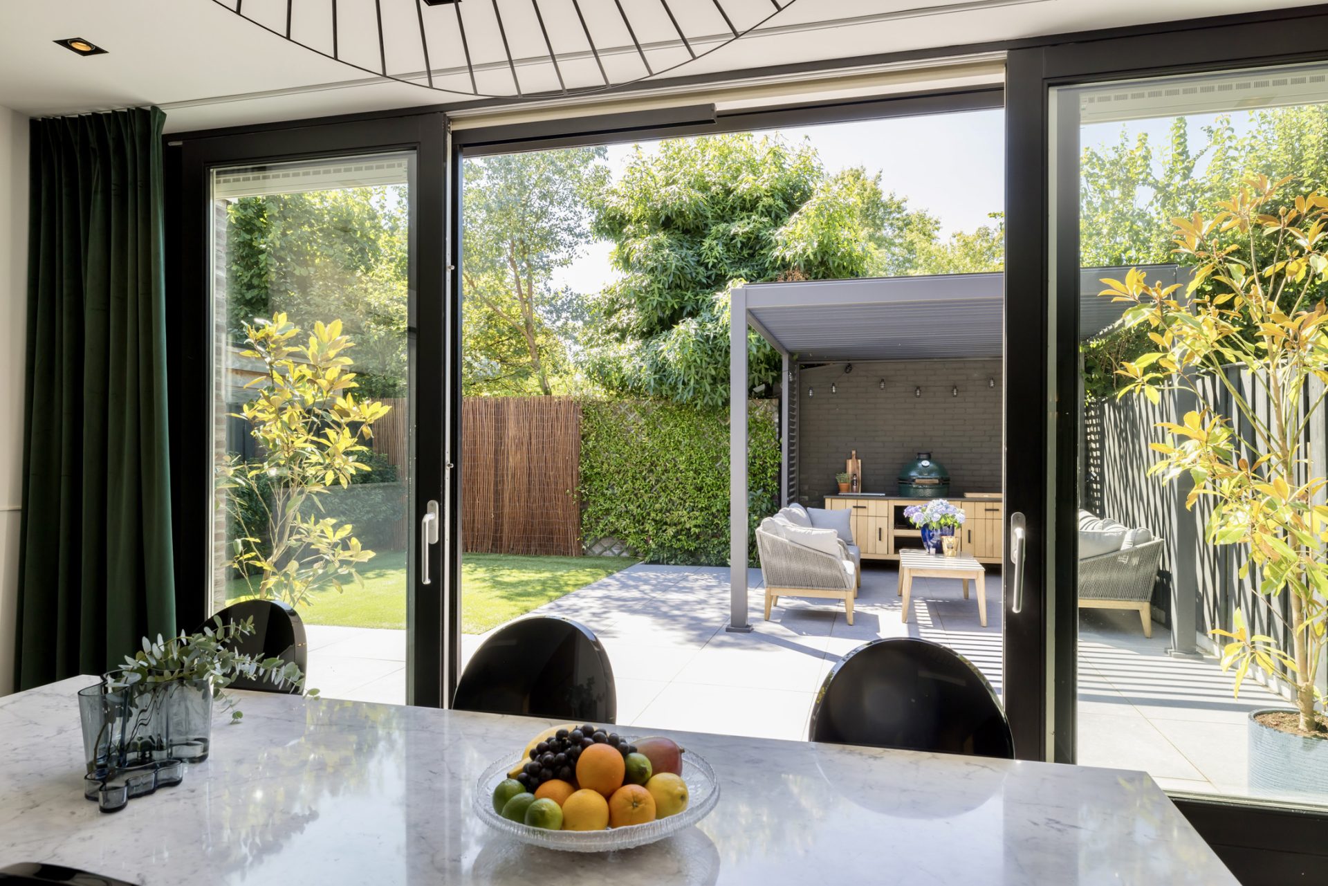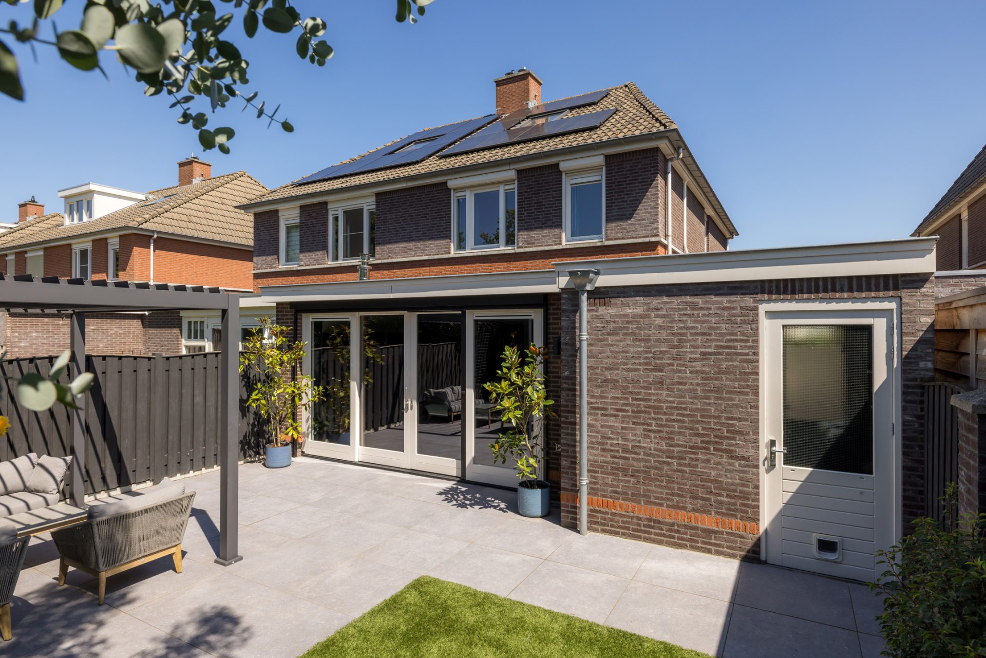 In de leefkeuken biedt een grote pui met schuifdeuren toegang tot de achtertuin, met een gunstige ligging op het zuidwesten en een overdekt terras.