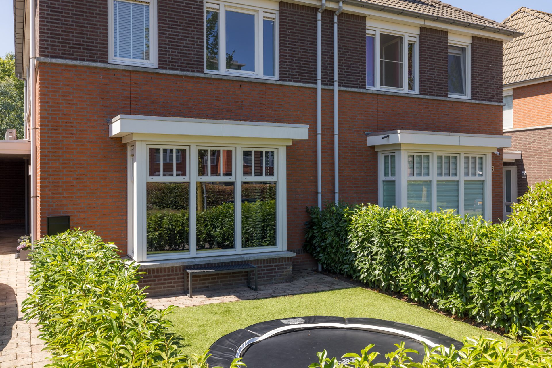 De voortuin is fraai aangelegd met een groenblijvende, halfhoge haag aan drie zijden die de ingebouwde trampoline aan het zicht onttrekt. Verder zie je hier een fijne plek om een bankje neer te zetten, waar je kunt zitten terwijl de kinderen hun springkunsten vertonen. Op de lange oprit is parkeergelegenheid voor drie auto’s en de ruime carport geeft de mogelijkheid voor extra bergruimte. Achter de carport bevindt zich een ruime schuur voor fietsen en nog veel meer.