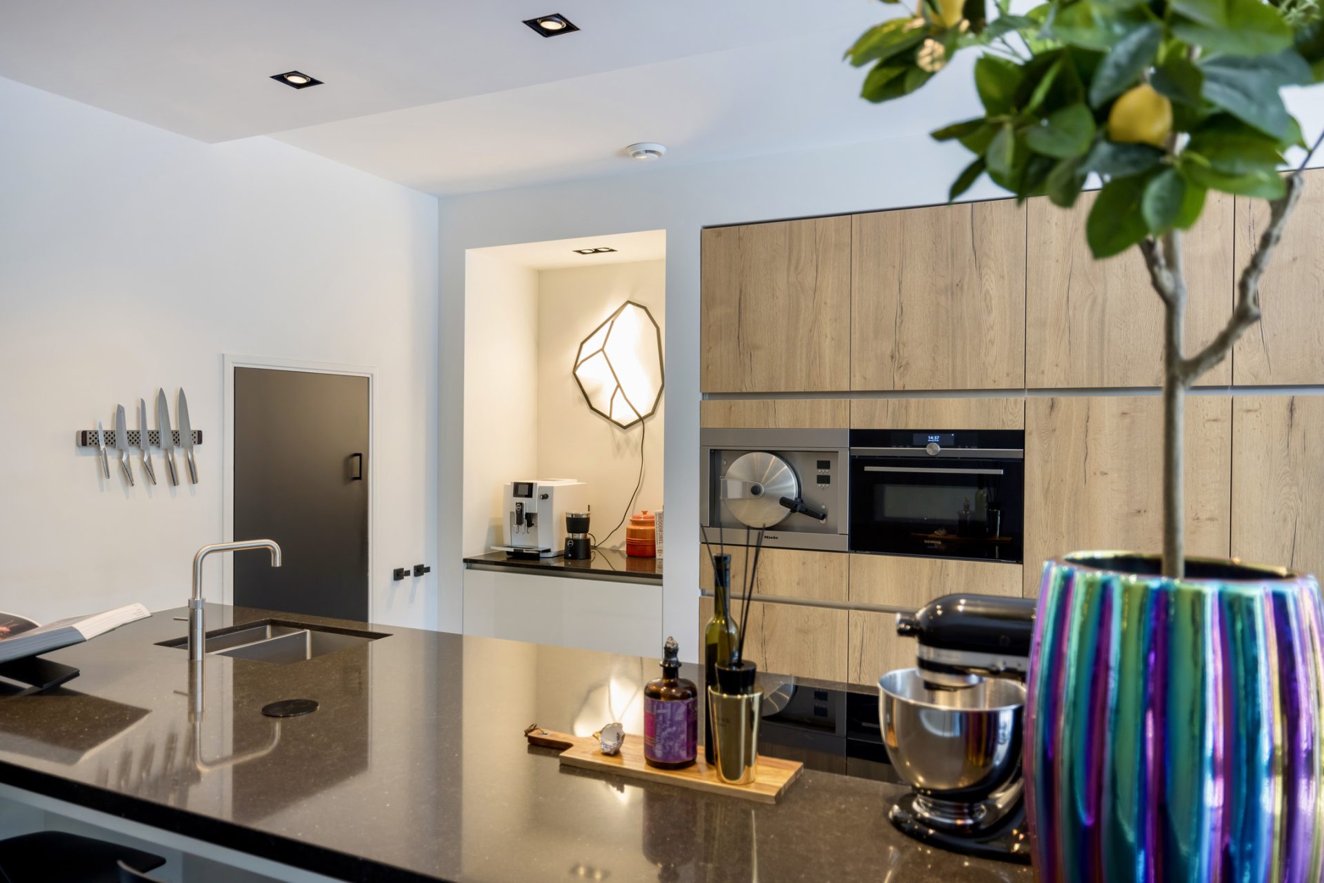 Achter de twee grote openslaande deuren met glas die het zitgedeelte met de woonkeuken van elkaar kunnen scheiden bevindt zich de woonkeuken. De woonkeuken met gashaard en vloerverwarming en airconditioning is meer dan een keuken om in te koken en te eten. Bezoek schuift aan voor een kop koffie en de bewoners zitten hier vaak, samen en als gezin om de dag door te nemen. De exclusieve keukenopstelling met een kook-/spoeleiland, koffiecorner en kastenwand is van topkwaliteit en voorzien van alle denkbare inbouwapparatuur, inclusief een wijnklimaatkast.