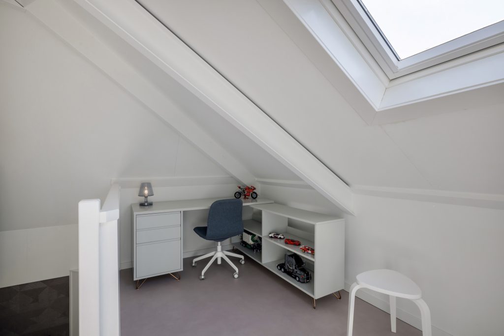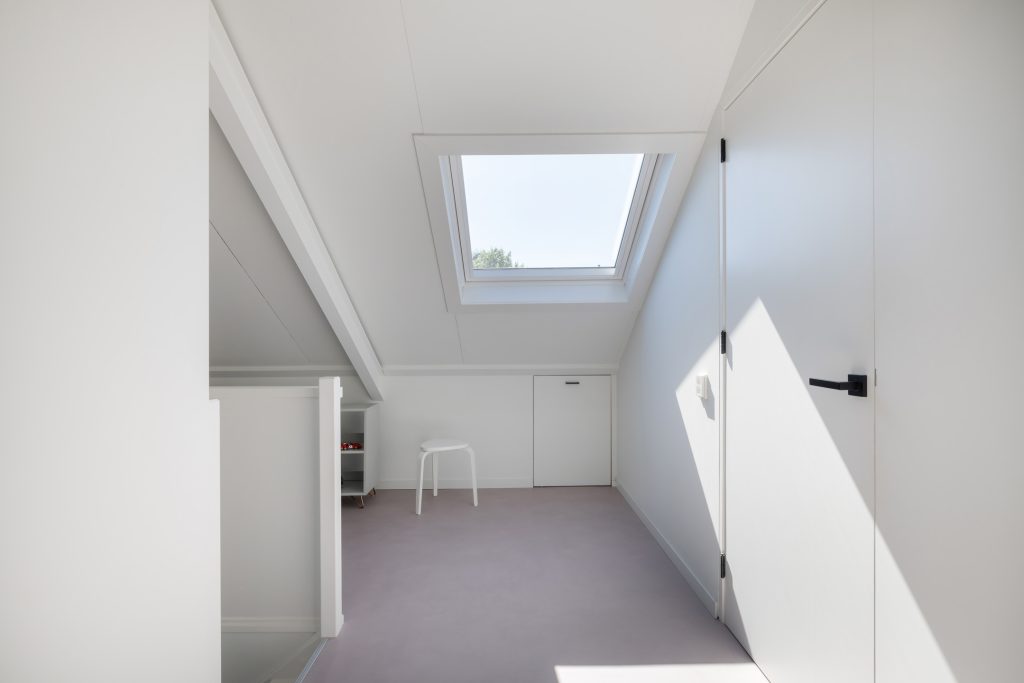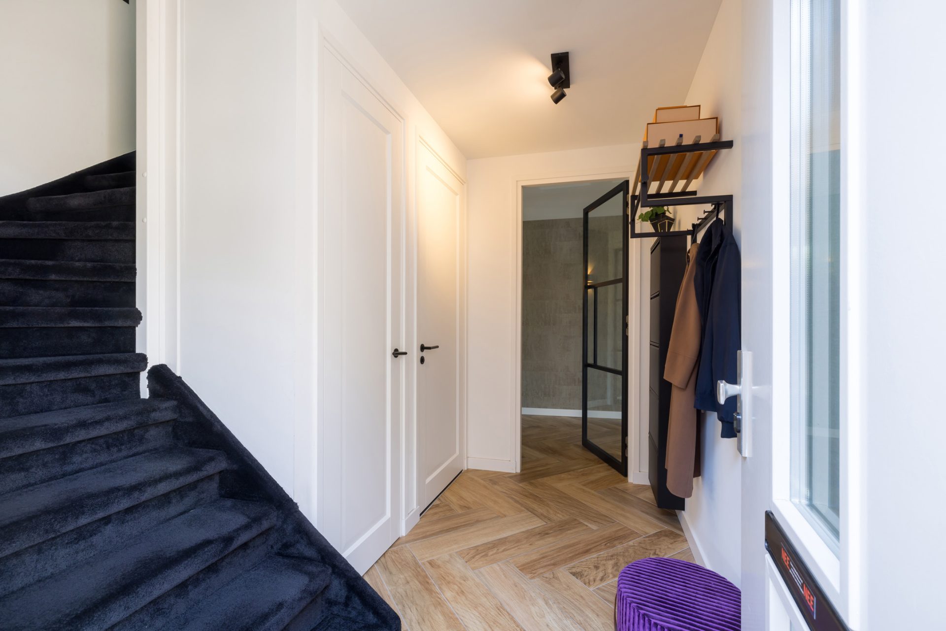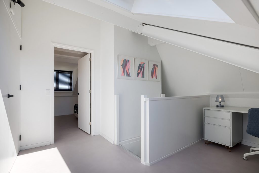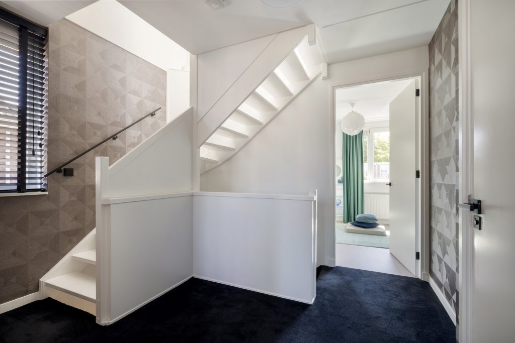 Via de trap, bekleed met zacht tapijt en zwart stalen op maat gemaakte trapleuningen loop je naar de eerste verdieping. Dankzij het raam in de zijgevel zijn de trapopgang en overloop heel licht. Ook op deze verdieping is tot in detail verbouwd, inclusief elektra en met een afwerking van hoog niveau.