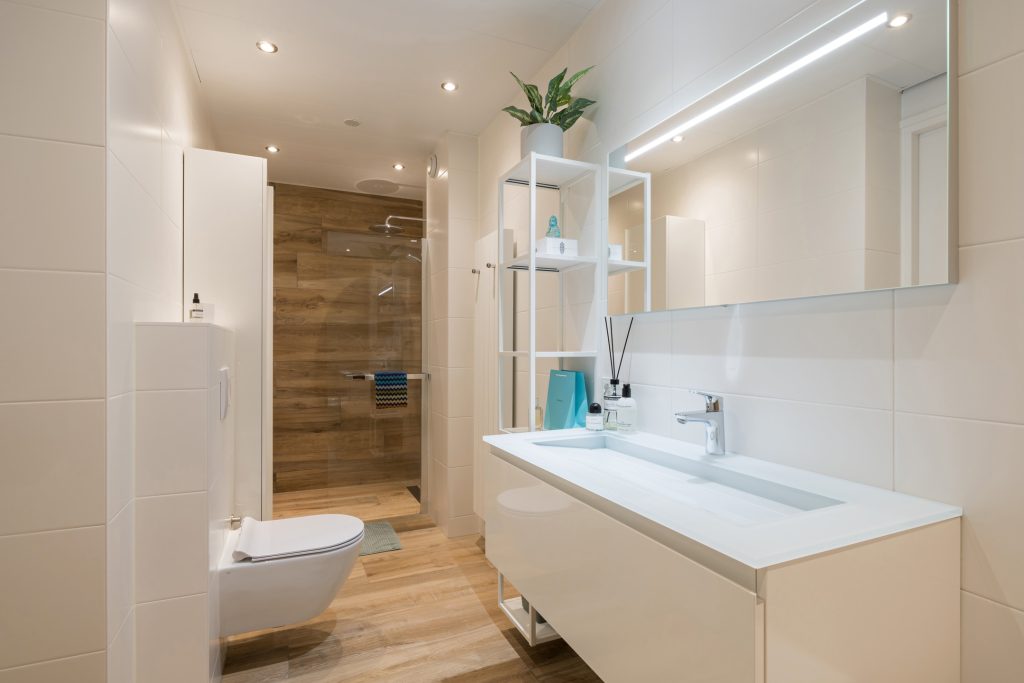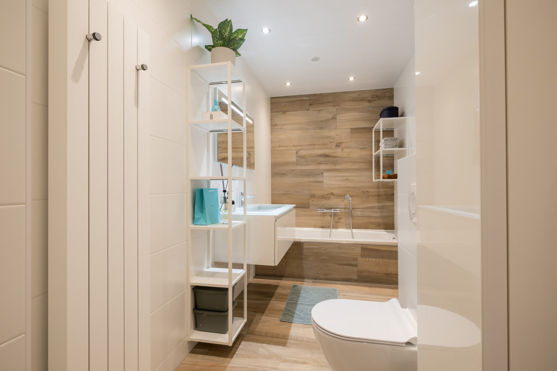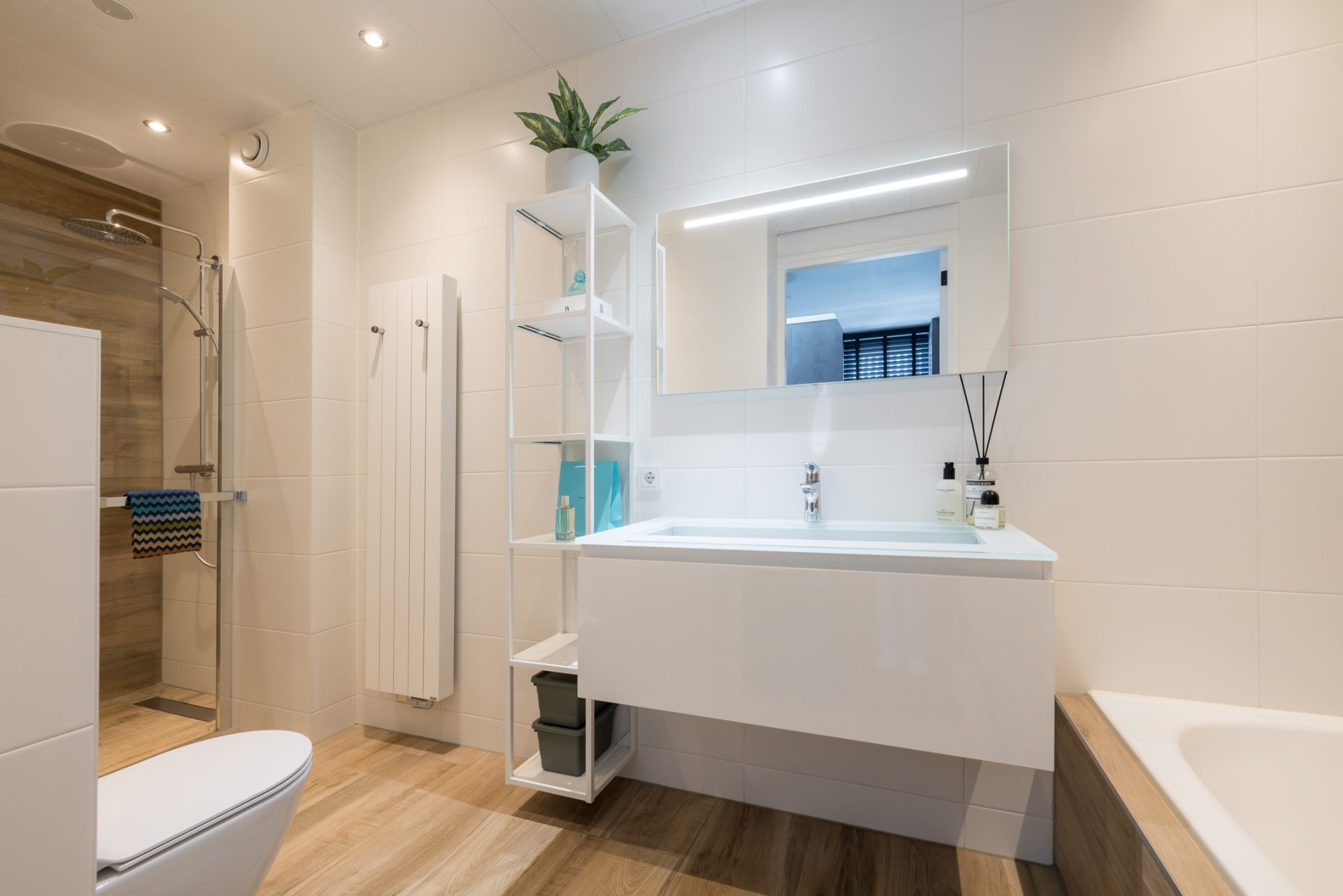 Achter een van de mooie deuren op de overloop is de badkamer, die in 2023 een facelift heeft gekregen. Deze prachtige ruimte is ingedeeld met een ligbad, breed wastafelmeubel, een wandcloset en een xl-inloopdouche. Dit is een ruime badkamer, uitgevoerd in een fraaie kleurencompositie en alle comfort.