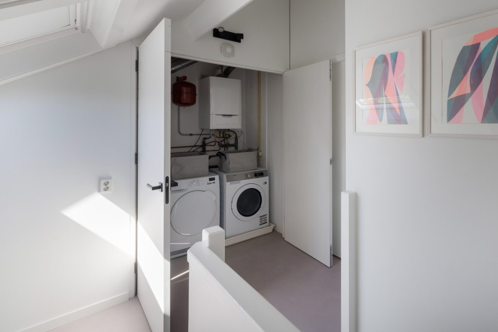 Volg de vaste trap naar de tweede verdieping, waar nu de master bedroom gesitueerd is. Deze kamer, met een dakkapel aan de voorzijde, heeft een breedte van ruim 5 meter en is voorzien van airconditioning en veel extra bergruimte. Achter dubbele deuren op de overloop is de opstelling van de HR-ketel, het ventilatiesysteem en de wasapparatuur.
