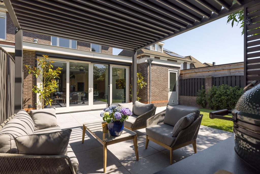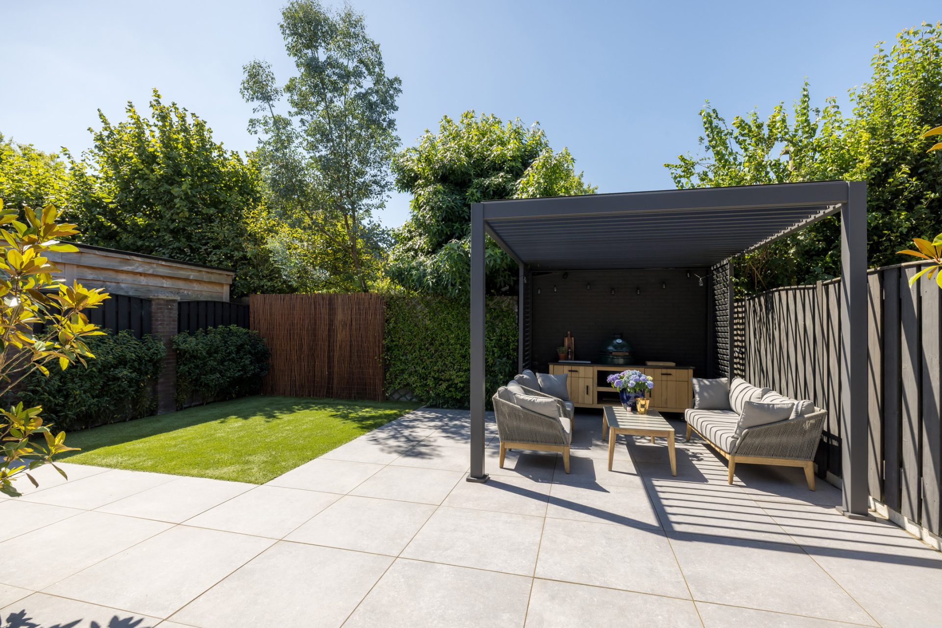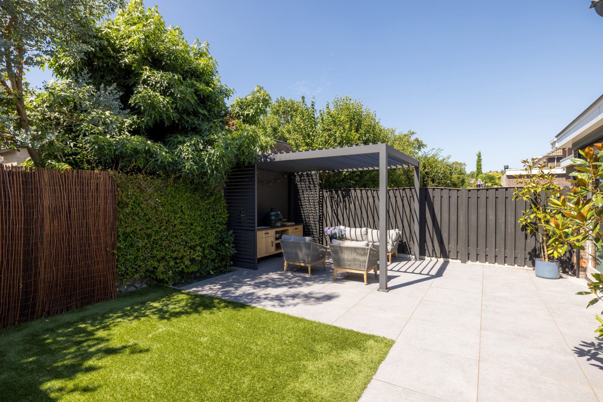 Grote tegels versterken het gevoel van ruimte en de wintergroene beplanting zorgen voor een fijne overzichtelijke tuin 365 dagen per jaar.