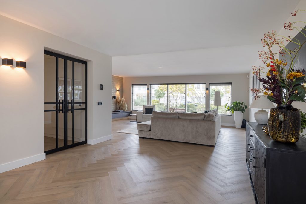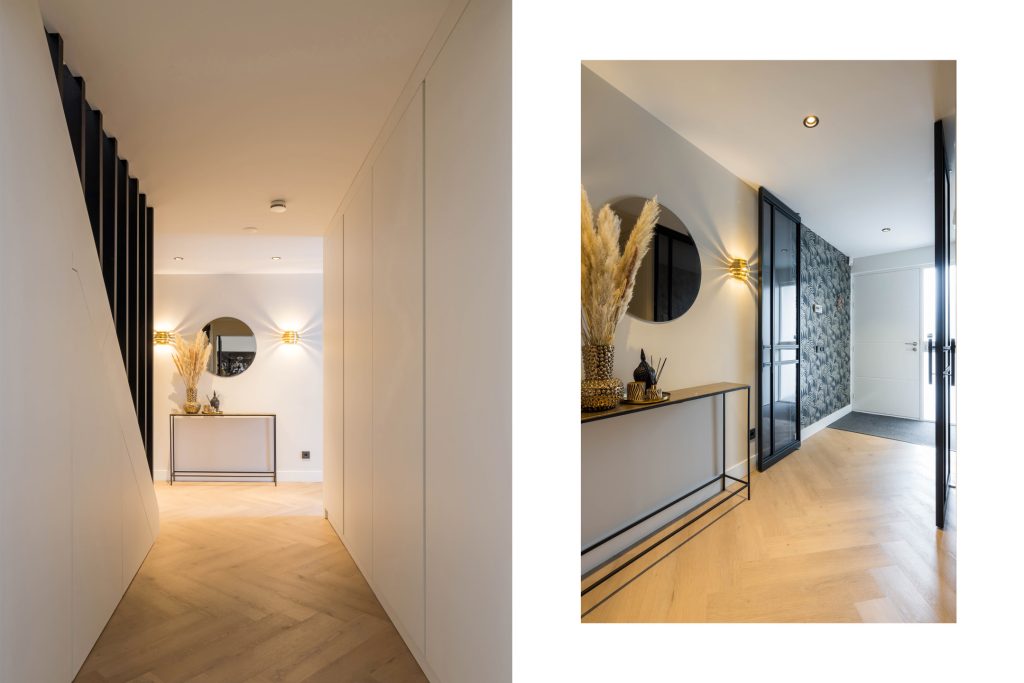 Open de voordeur naar de hal, die de pure klasse en luxe van deze villa weerspiegelt. De visgraatvloer met vloerverwarming vormt een fraaie combinatie met het fijne stucwerk, de zwarte stalen deuren en het patroonbehang. Op maat gemaakte kasten bieden niet alleen veel bergruimte, maar zorgen ook voor een hal die heel clean en ruimtelijk oogt. De toiletruimte met luxe sanitair en mozaïektegels is een lust voor het oog.