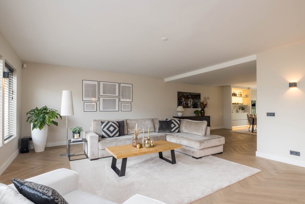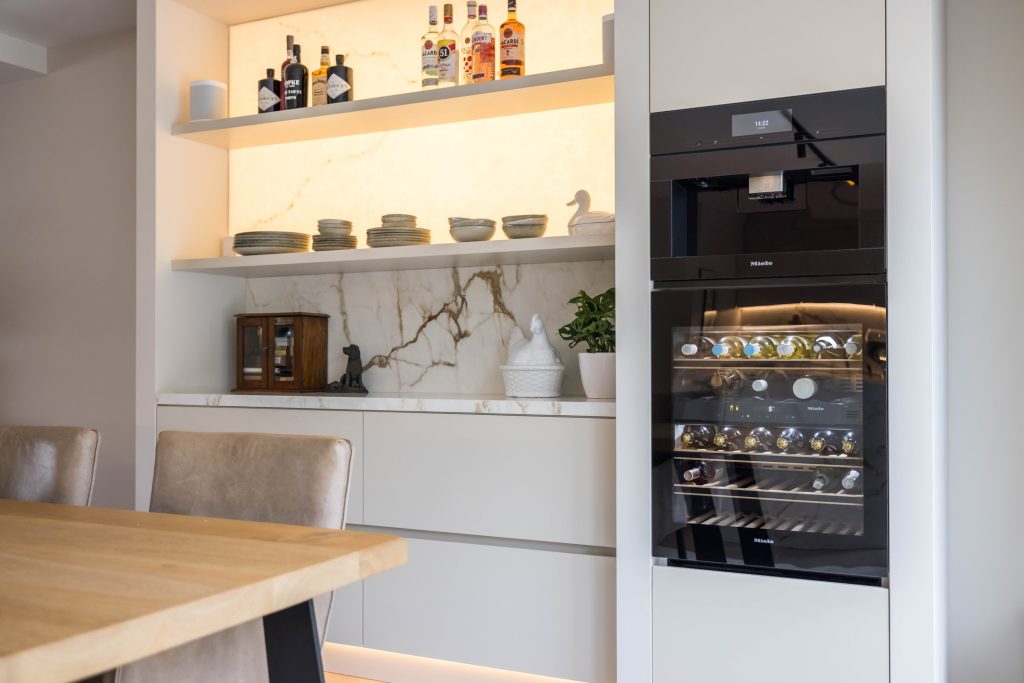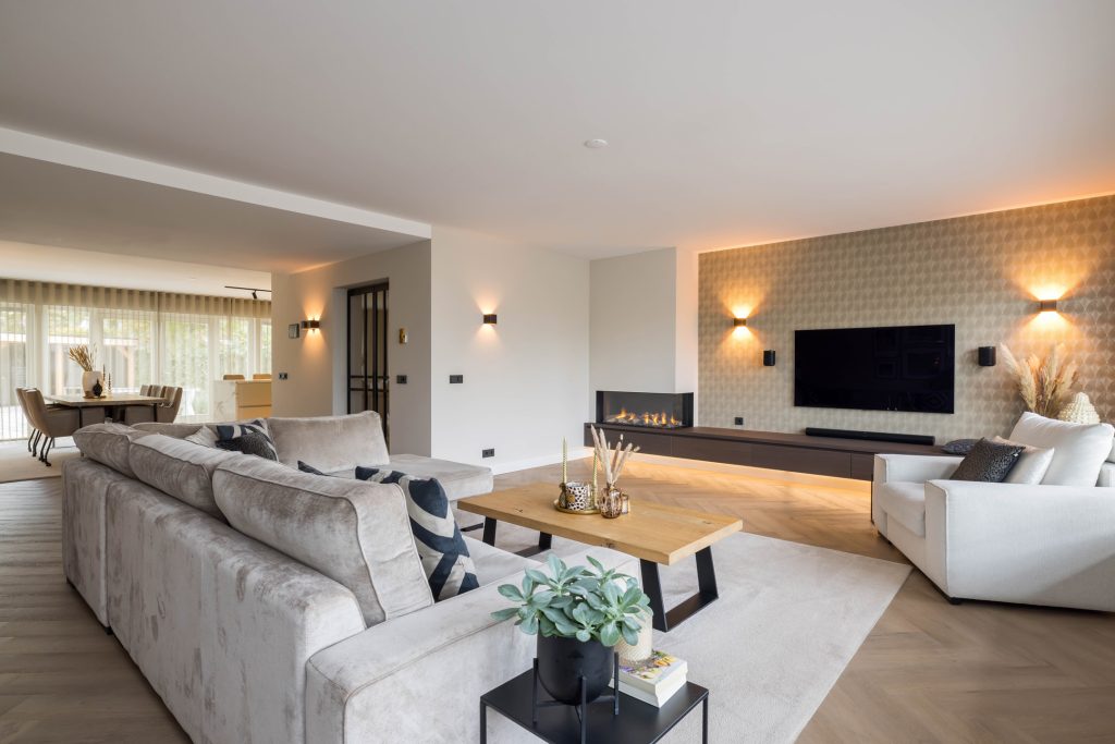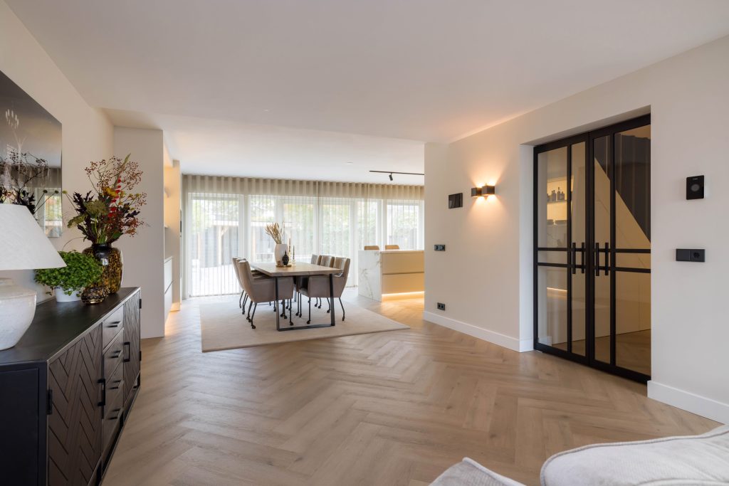 De L-vormige woonkamer staat in open verbinding met de luxe keuken. Grote ramen aan de voor- en achterzijde zorgen, net als de openslaande deuren, voor veel lichtinval en optimaal tuincontact. De op maat gemaakte schouw met gashaard en laag wandmeubel bij het zitgedeelte trekt direct de aandacht, net als de op maat gemaakte kasten met de koffiemachine en wijnkoelkast bij het eetgedeelte.
