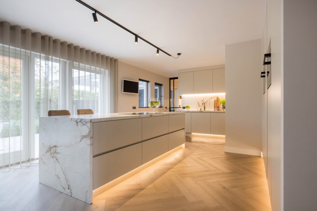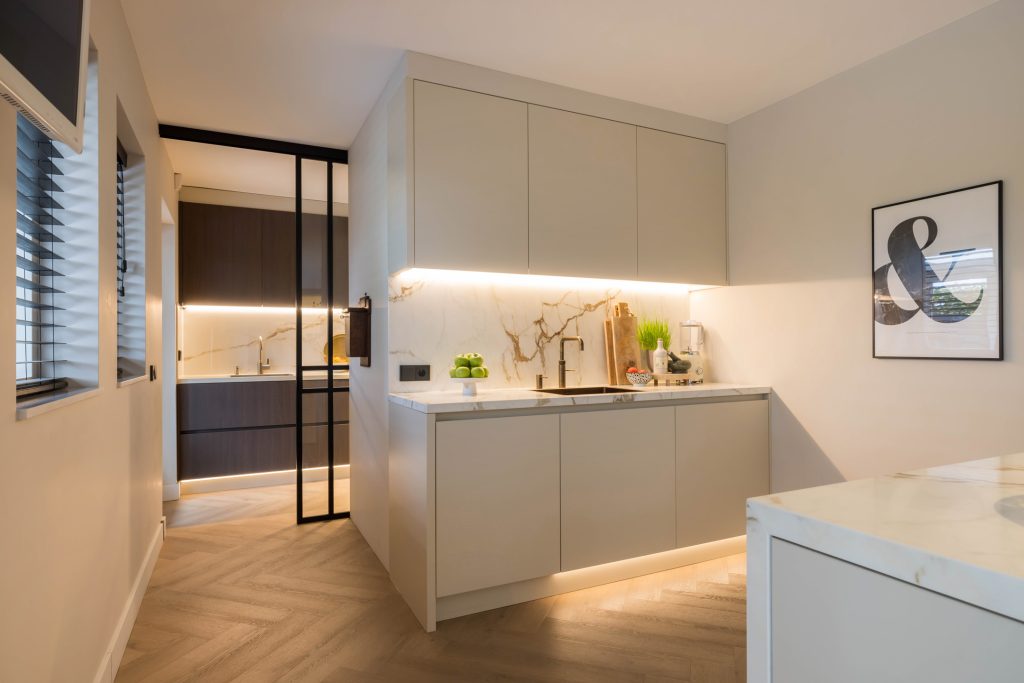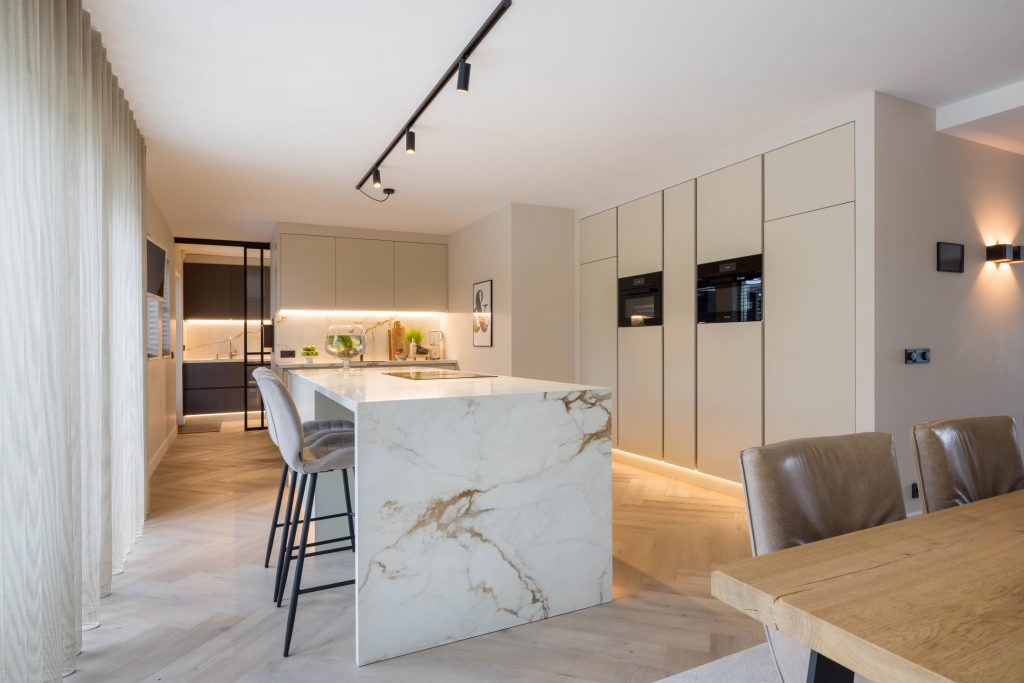 Een designkeuken verdient een prominente plek, zo ook de keuken in deze villa. Het grote kook-/ziteiland is gemaakt van marmer, net als het blad en achterwand van het spoelgedeelte. De grote lades en kasten bieden volop bergruimte, net als het tweede keukenblok in de aangrenzende bijkeuken. Ook deze keuken is voorzien van inbouwapparatuur, waaronder een tweede inductie kookplaat.