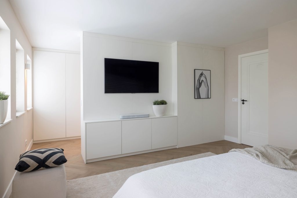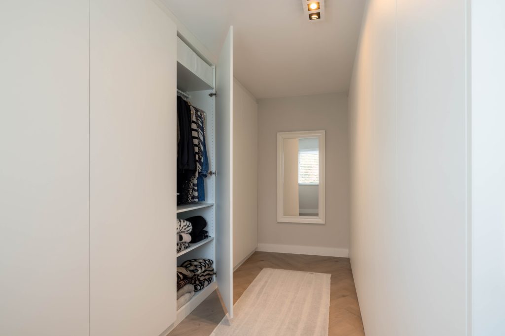 Aan de achterzijde is de 7 meter brede masterbedroom, verdeeld in een sfeervol slaapgedeelte en een walk-in closet. Mooie elementen zijn het op maat gemaakte interieur, de visgraatvloer en de garderobekasten van vloer tot plafond. De slaapkamers aan de voorzijde, beiden met vaste kasten, zijn in gebruik als logeerkamer en werkkamer.