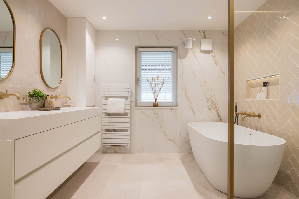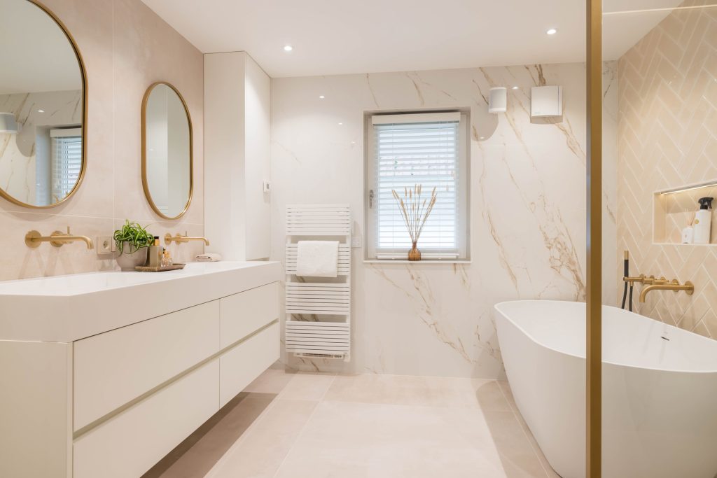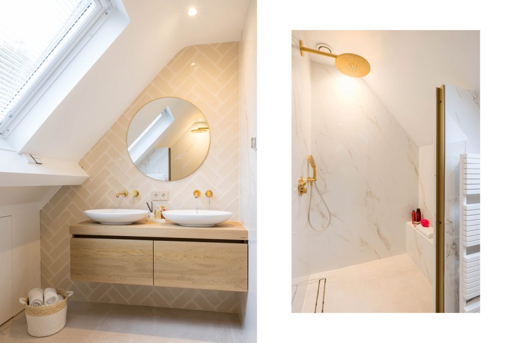 Adembenemend mooi en sfeervol zijn de termen die in de badkamer van toepassing zijn. Goudkleurige accenten, marmer, luxe sanitair en tegelwerk in visgraat patroon zorgen voor een badkamer van pure klasse. Of je nu van douchen of een warm bad houdt, dit is de perfecte badkamer. Het toilet zit in een aparte ruimte, te bereiken vanaf de overloop.