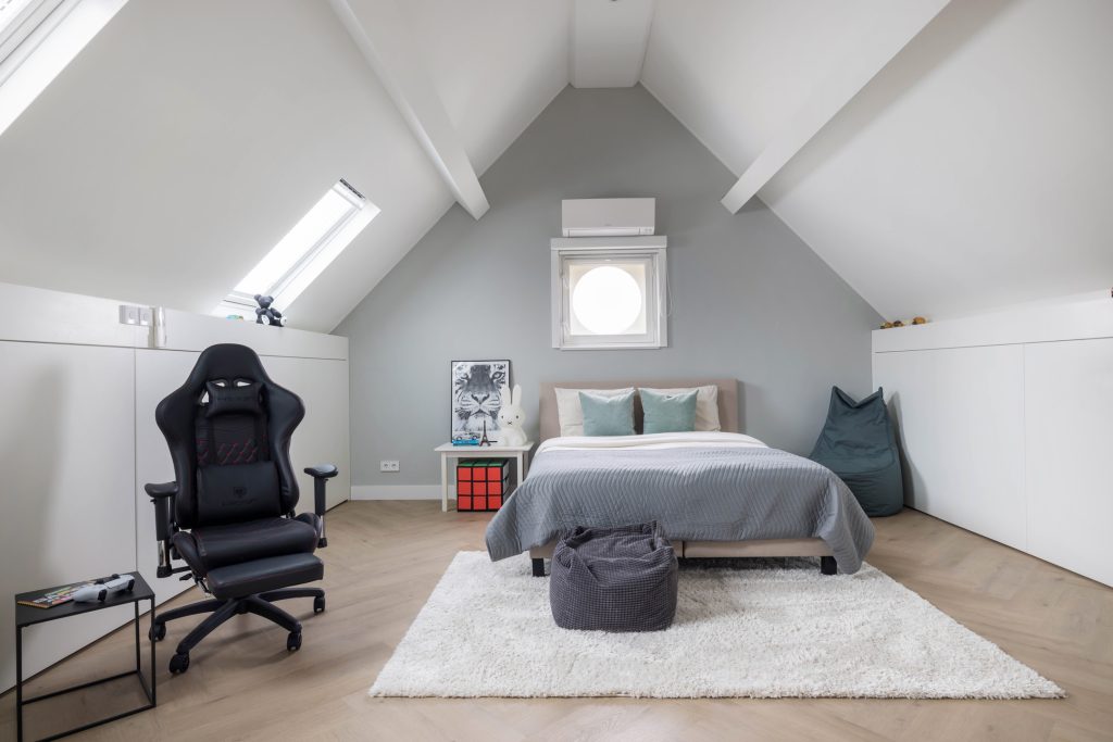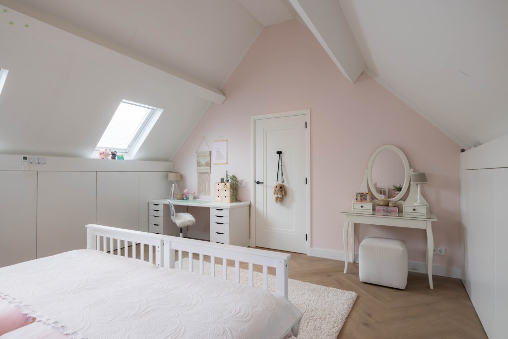 Onder het steile, schuine dak zijn nog twee ruime slaapkamers, een tweede badkamer en een berging. Beide slaapkamers hebben zicht tot in de nok, fraai lichtinval en op maat gemaakte kasten in de schuinten van het dak. Ingetogen roze en blauw geven aan dat dit mooie kinderkamers zijn, maar een andere functie is uiteraard ook mogelijk.