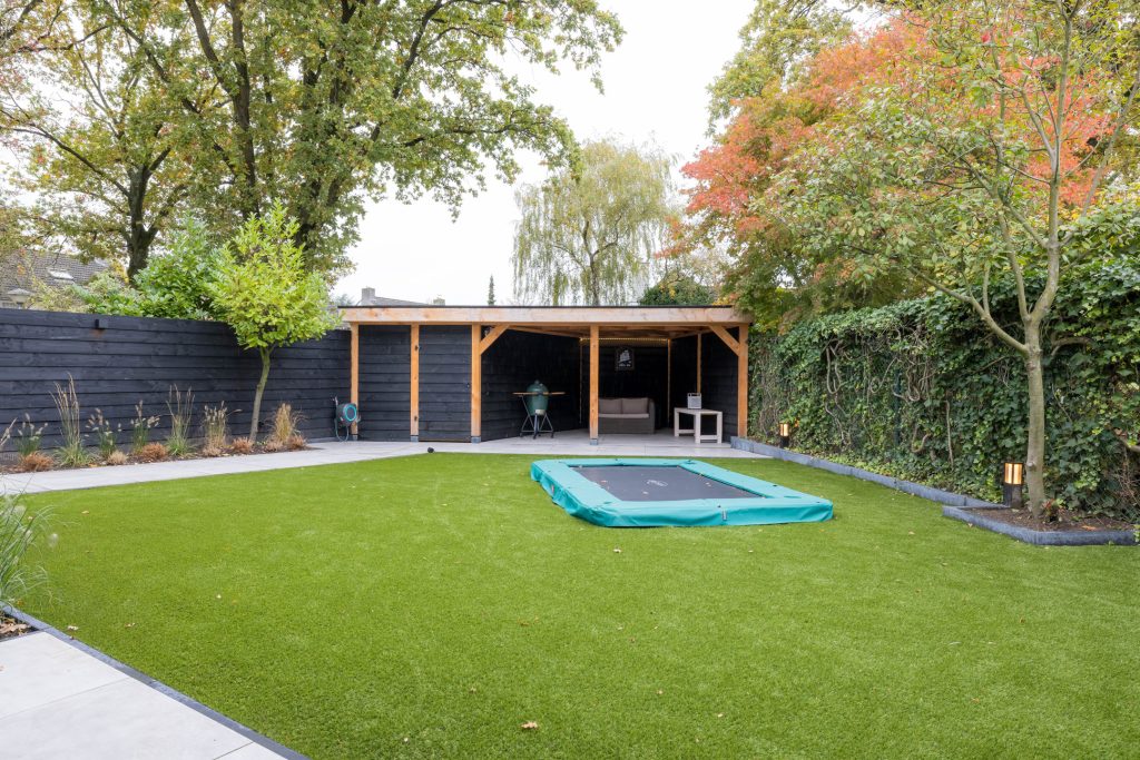 Vanuit de woonkamer en bijkeuken de diepe achtertuin te bereiken. Je hoeft geen gras te maaien en de terrassen bieden volop ruimte om van het buitenleven te genieten. Zwarte schuttingen, buitenverlichting, siergrassen en andere beplanting passen goed in het geheel. Kies je voor de veranda met lichtkoepels of het overdekte terras naast de berging?
