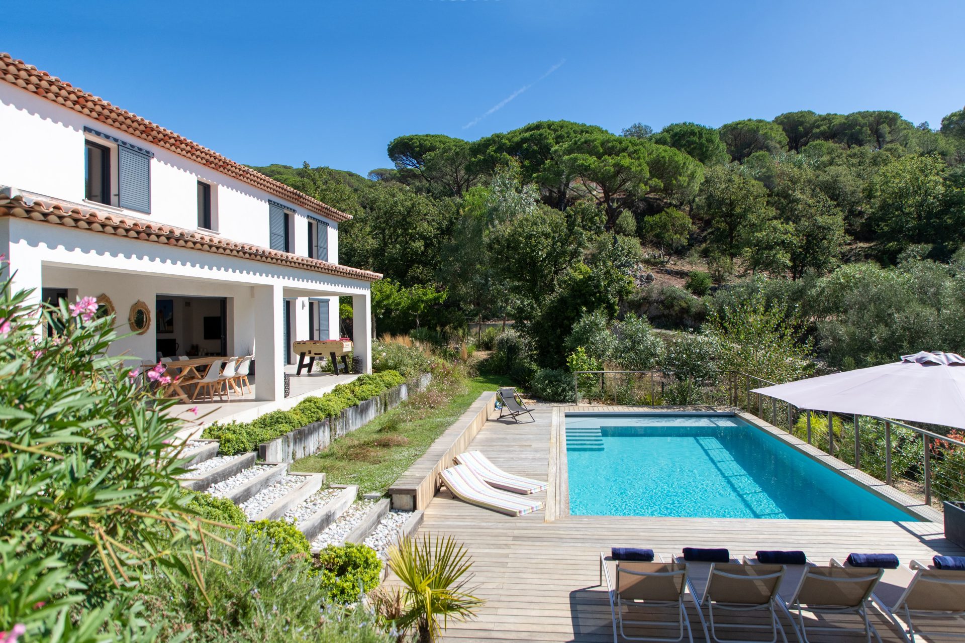 Ontdek deze prachtige moderne villa, ideaal gelegen in een rustige en exclusieve villawijk van Grimaud, op slechts 15 minuten van het levendige Saint Tropez en de zonnige stranden van de Côte d’Azur. Deze recent gebouwde villa (2018) van 195 m² is omgeven door een ruim, omheind terrein van 2500 m², rijkelijk beplant met bomen, wat zorgt voor ultieme privacy en rust.