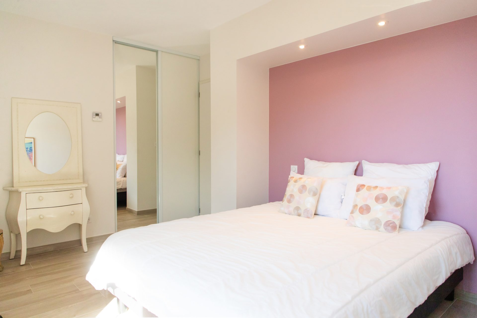 De begane grond herbergt de royale master bedroom, compleet met een luxe badkamer en een ruime kleedkamer. Op de eerste verdieping bevinden zich twee en suite slaapkamers, elk met een eigen doucheruimte en toilet, en twee extra slaapkamers die een moderne doucheruimte en toilet delen.