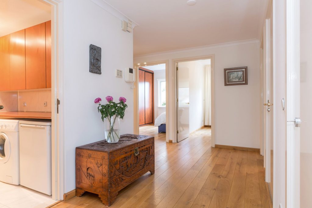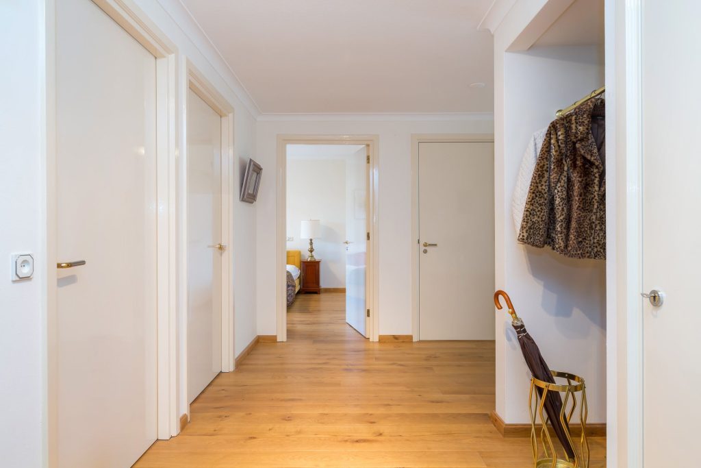 Bij binnenkomst in de lichte, luxe afgewerkte hal krijgt u een goede indruk van de sfeer die kenmerkend is voor het gehele appartement. De hal geeft u toegang tot nagenoeg alle vertrekken zoals de living, de hoofdslaapkamer met badkamer, de tweede en derde slaapkamer, de volledig betegelde toiletruimte met wandcloset en fonteintje, de praktische tweede badkamer met onder andere een extra douchegelegenheid en aansluitingen voor de wasapparatuur. De gehele verdieping is voorzien van een parketvloer.