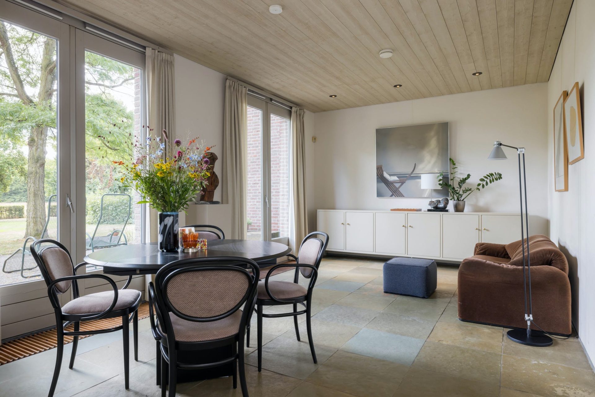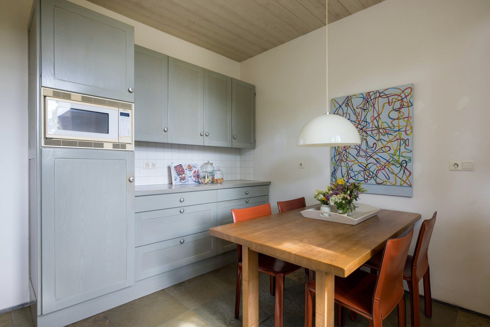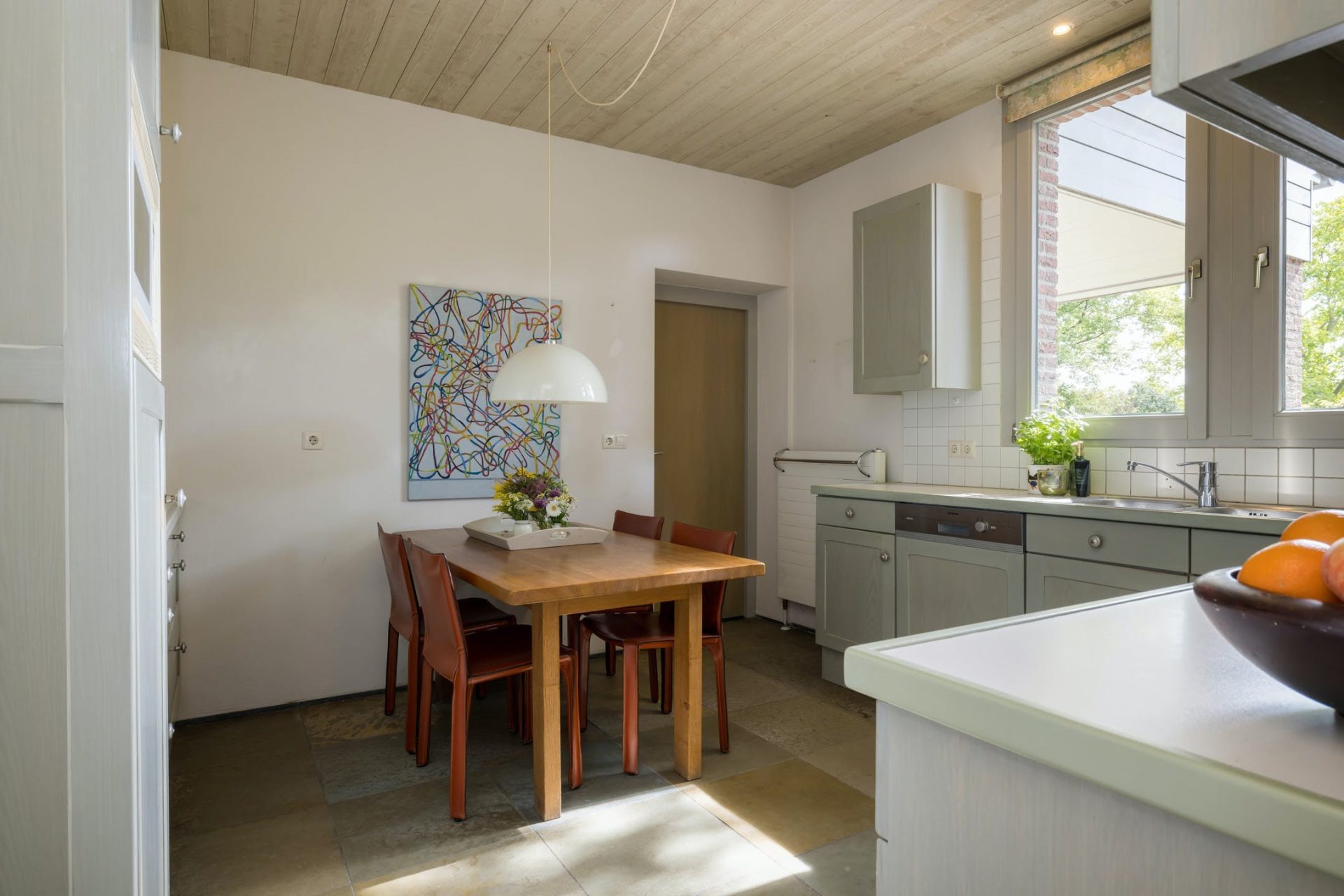 De naastgelegen eetkamer biedt eveneens een prachtig uitzicht op de tuin en de daarachter gelegen velden waar hazen graag spelen en roofvogels jagen. De eetkamer staat in directe verbinding met de woonkeuken en die is op haar beurt weer in verbonden met een praktische bijkeuken/wasruimte. Vanuit deze ruimte is het overdekte terras in de tuin en de dubbele inpandige garage te bereiken.