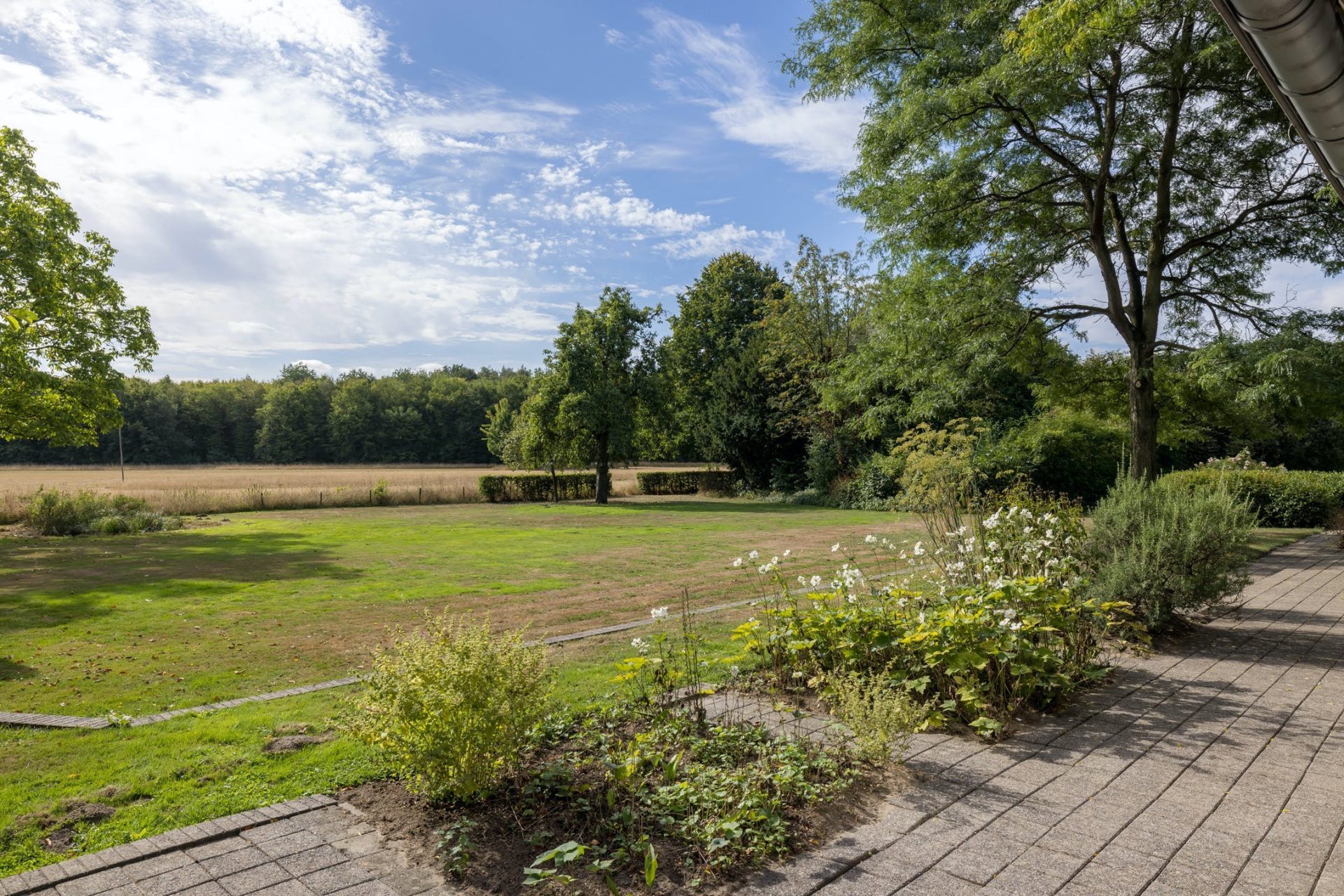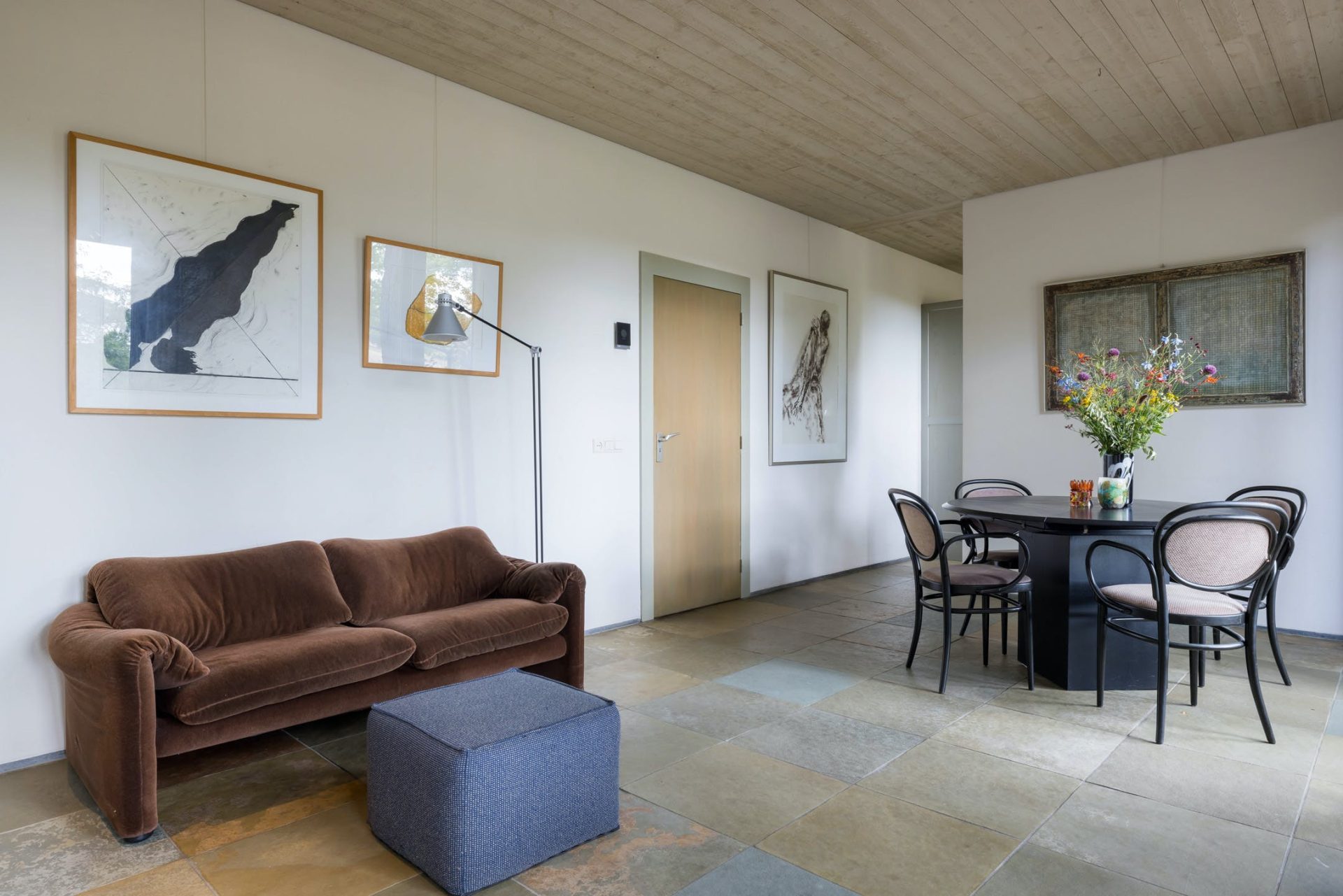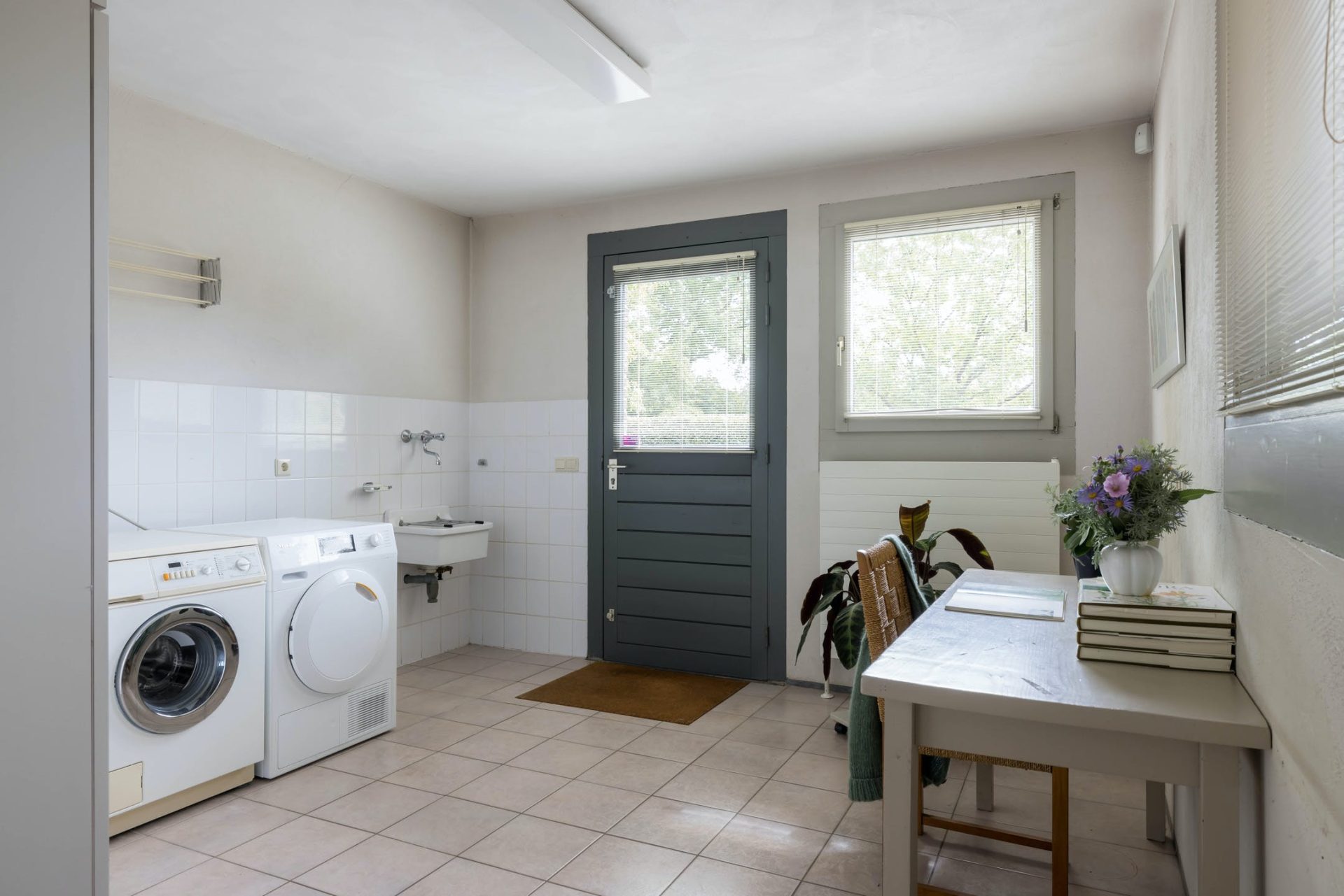 De naastgelegen eetkamer biedt eveneens een prachtig uitzicht op de tuin en de daarachter gelegen velden waar hazen graag spelen en roofvogels jagen. De eetkamer staat in directe verbinding met de woonkeuken en die is op haar beurt weer in verbonden met een praktische bijkeuken/wasruimte. Vanuit deze ruimte is het overdekte terras in de tuin en de dubbele inpandige garage te bereiken.