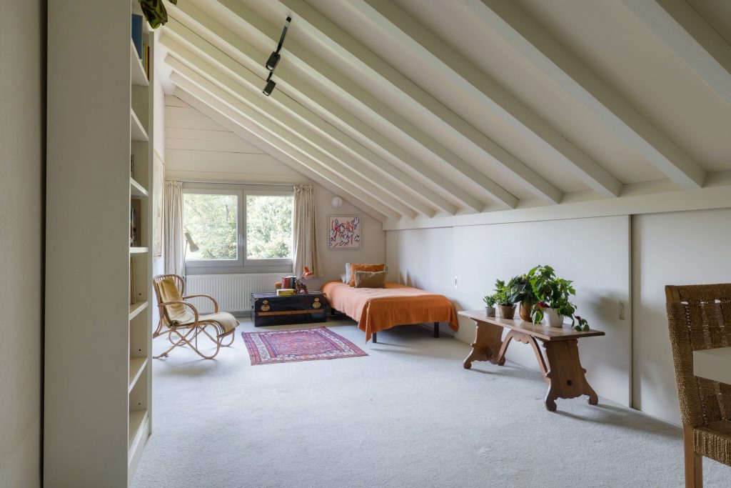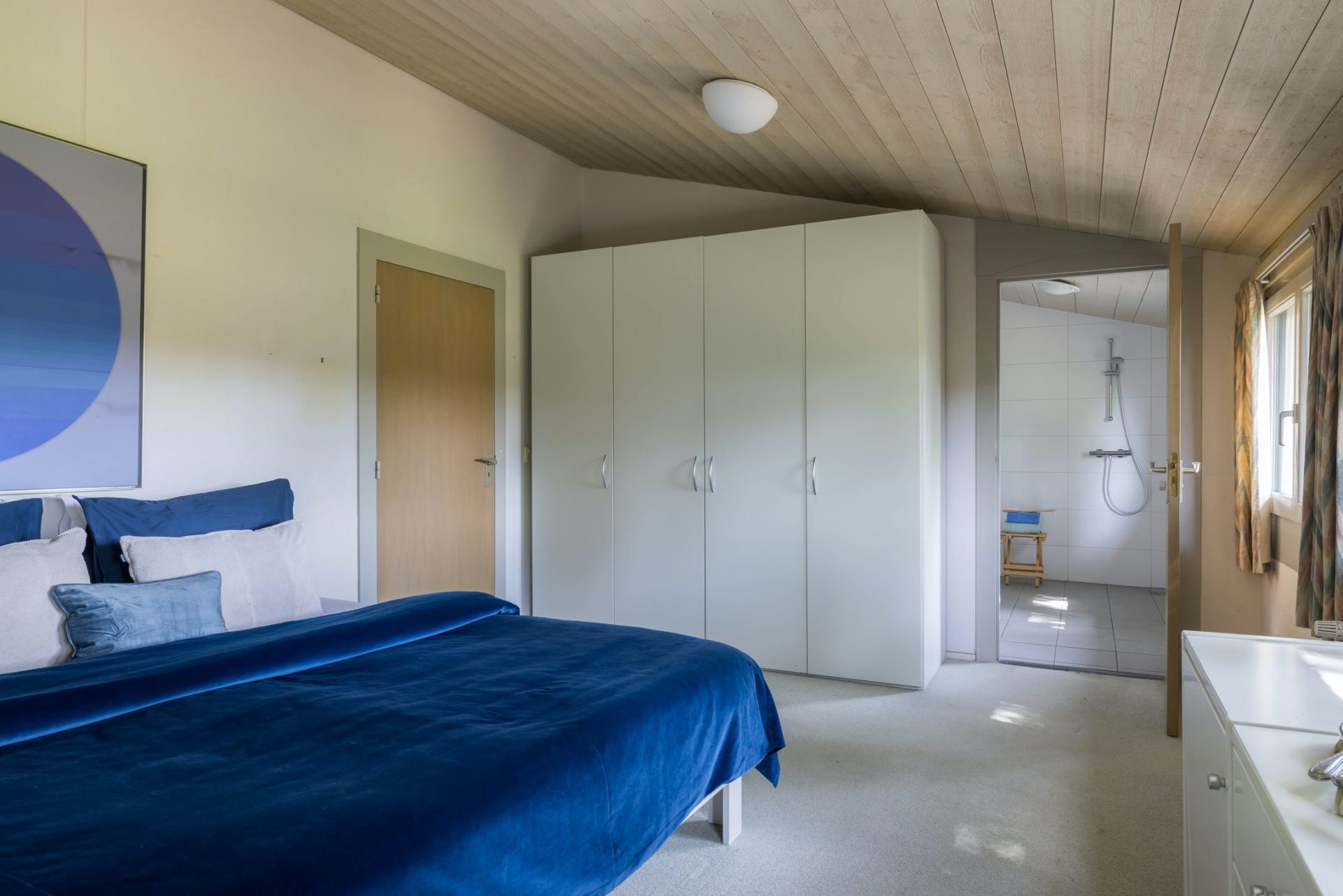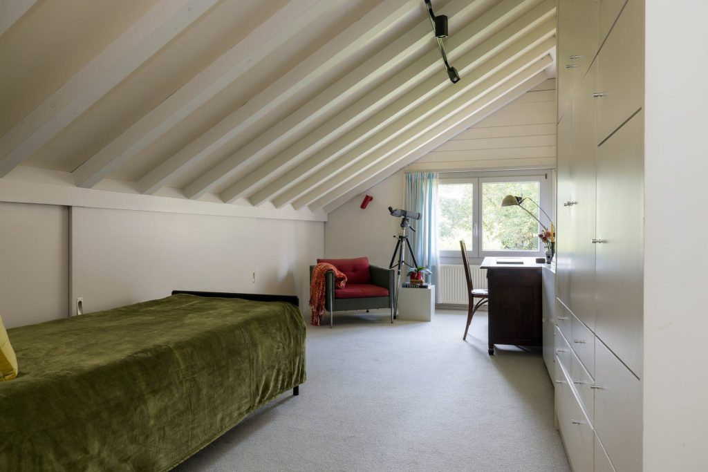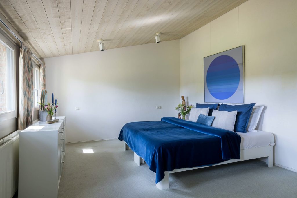 Vanuit deze slaapkamer hebt u, als u ’s ochtends de gordijnen opentrekt, meteen een prachtig uitzicht over de weiden waar u in de zomer over wuivend gras en in de winter over de berijpte velden kijkt.