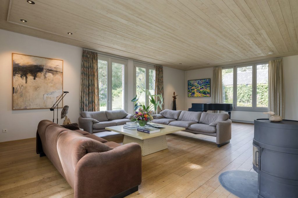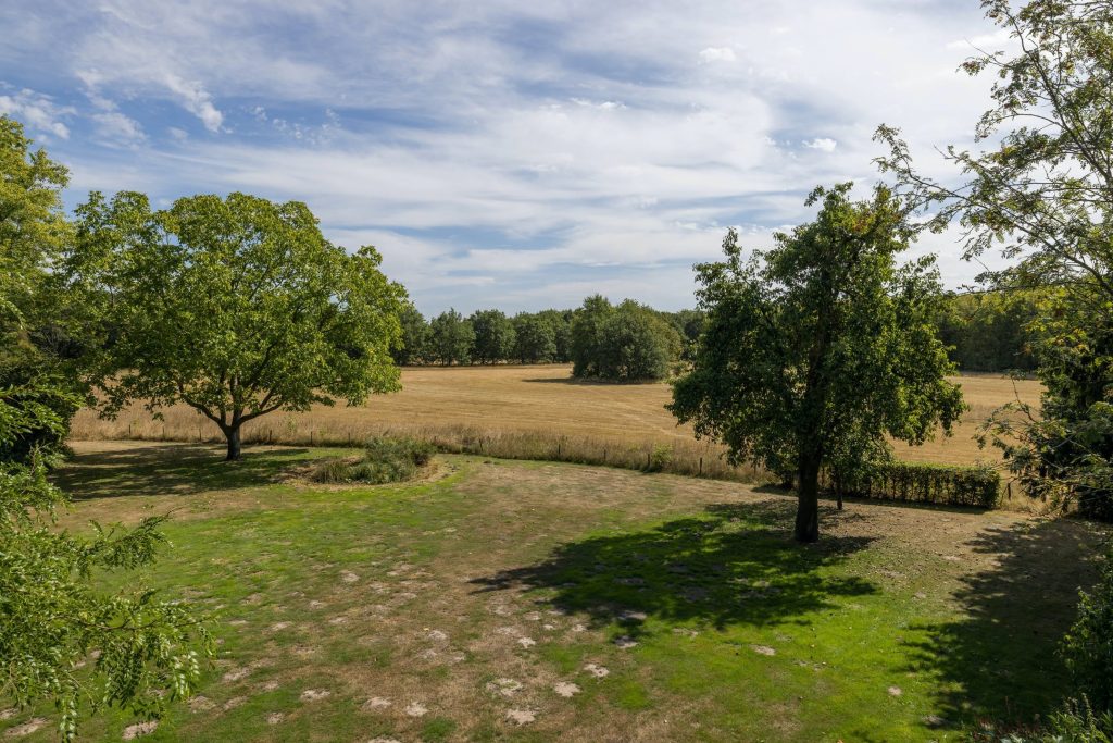 De woonkamer met haar grote ramen en openslaande tuindeuren is gesitueerd op de zuidkant van het landhuis. Dit zorgt niet alleen voor veel lichtinval maar ook voor een schitterend uitzicht op het landgoed, en aan de andere zijden op de rijk bloeiende binnentuin met haar grote borders en vijver. De centrale houtkachel (er is natuurlijk hout genoeg op het landgoed) en de robuuste houten vloer zijn hier de sfeermakers.