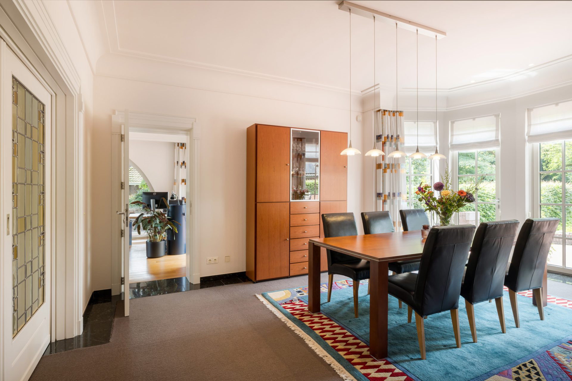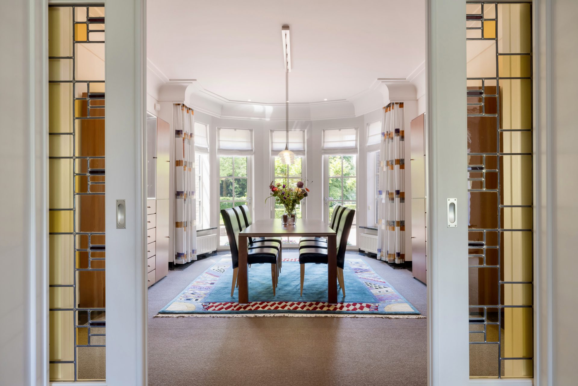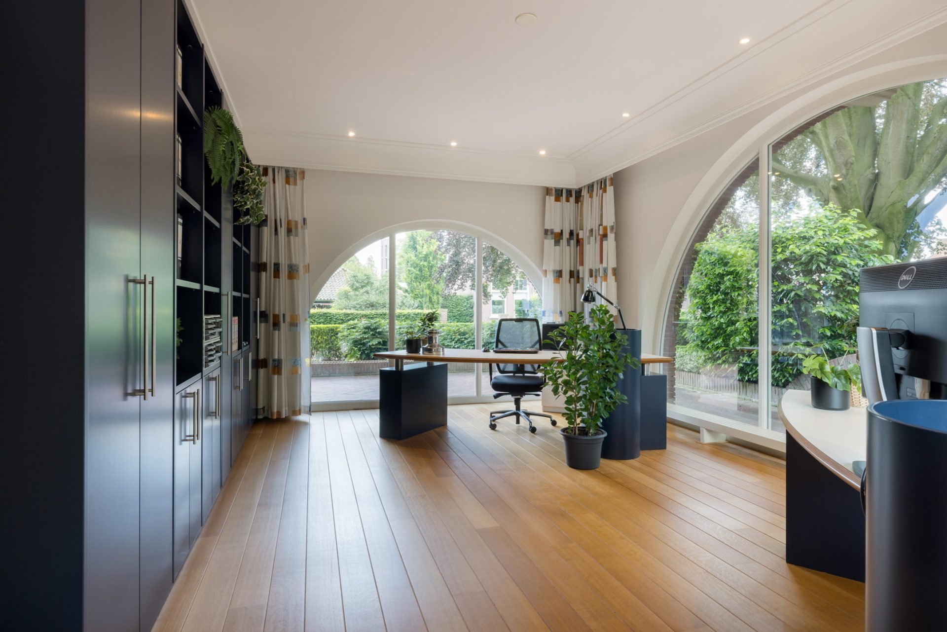 Twee klassieke schuifdeuren met glas in lood verbinden de woonkamer met de eetkamer, die genoeg ruimte biedt om te dineren met vrienden en familie. Door de grote ramen en deuren geniet u volop van het uitzicht naar de achtertuin. Fraaie elementen zijn de granieten plinten en het subtiele stijlplafond. Vanuit de eetkamer heeft u toegang tot een ruime werkkamer met drie grote, halfronde ramen, maatkasten en maatbureaus en een parketvloer. Door de grote raampartijen voelt het alsof u midden in de natuur werkt.
