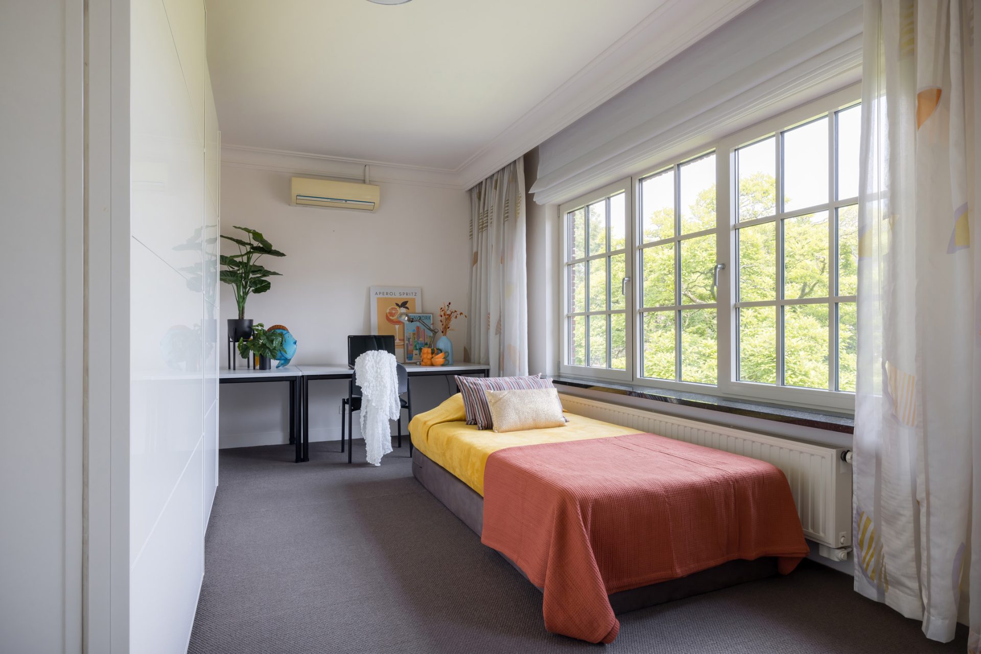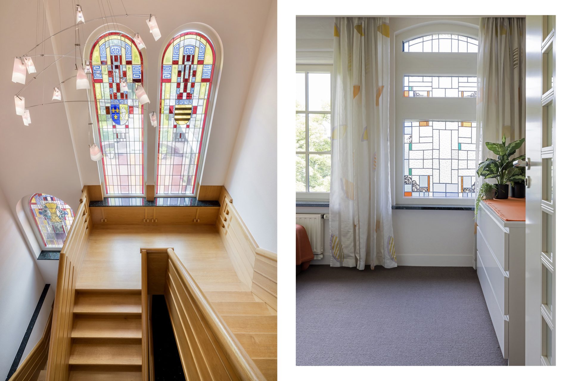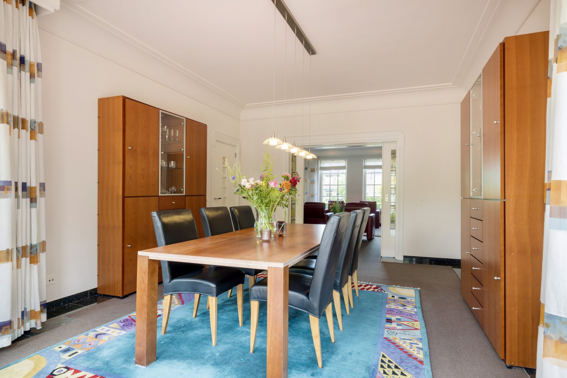 Twee klassieke schuifdeuren met glas in lood verbinden de woonkamer met de eetkamer, die genoeg ruimte biedt om te dineren met vrienden en familie. Door de grote ramen en deuren geniet u volop van het uitzicht naar de achtertuin. Fraaie elementen zijn de granieten plinten en het subtiele stijlplafond. Vanuit de eetkamer heeft u toegang tot een ruime werkkamer met drie grote, halfronde ramen, maatkasten en maatbureaus en een parketvloer. Door de grote raampartijen voelt het alsof u midden in de natuur werkt.