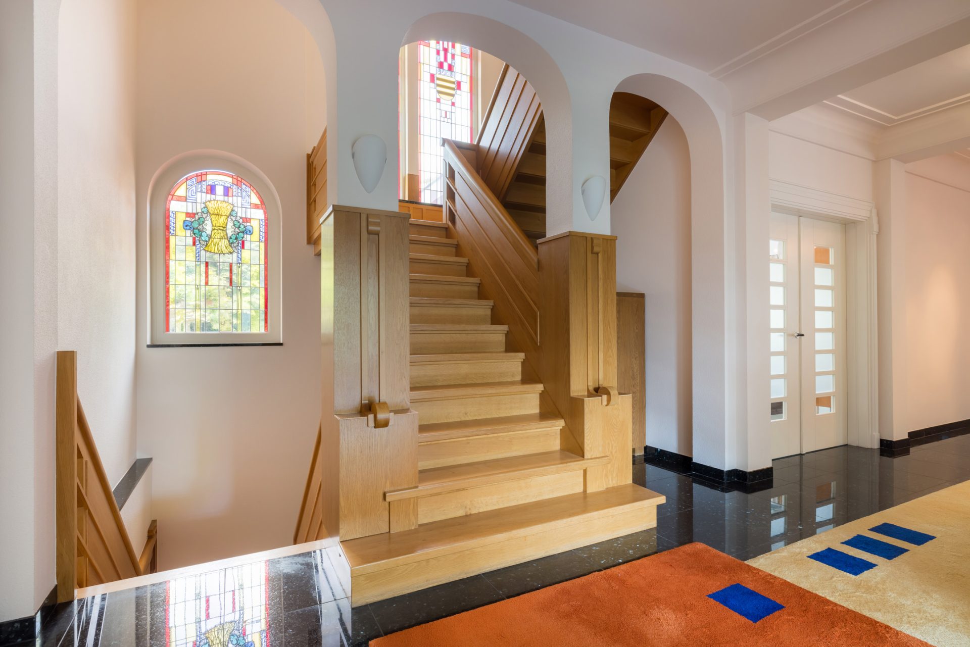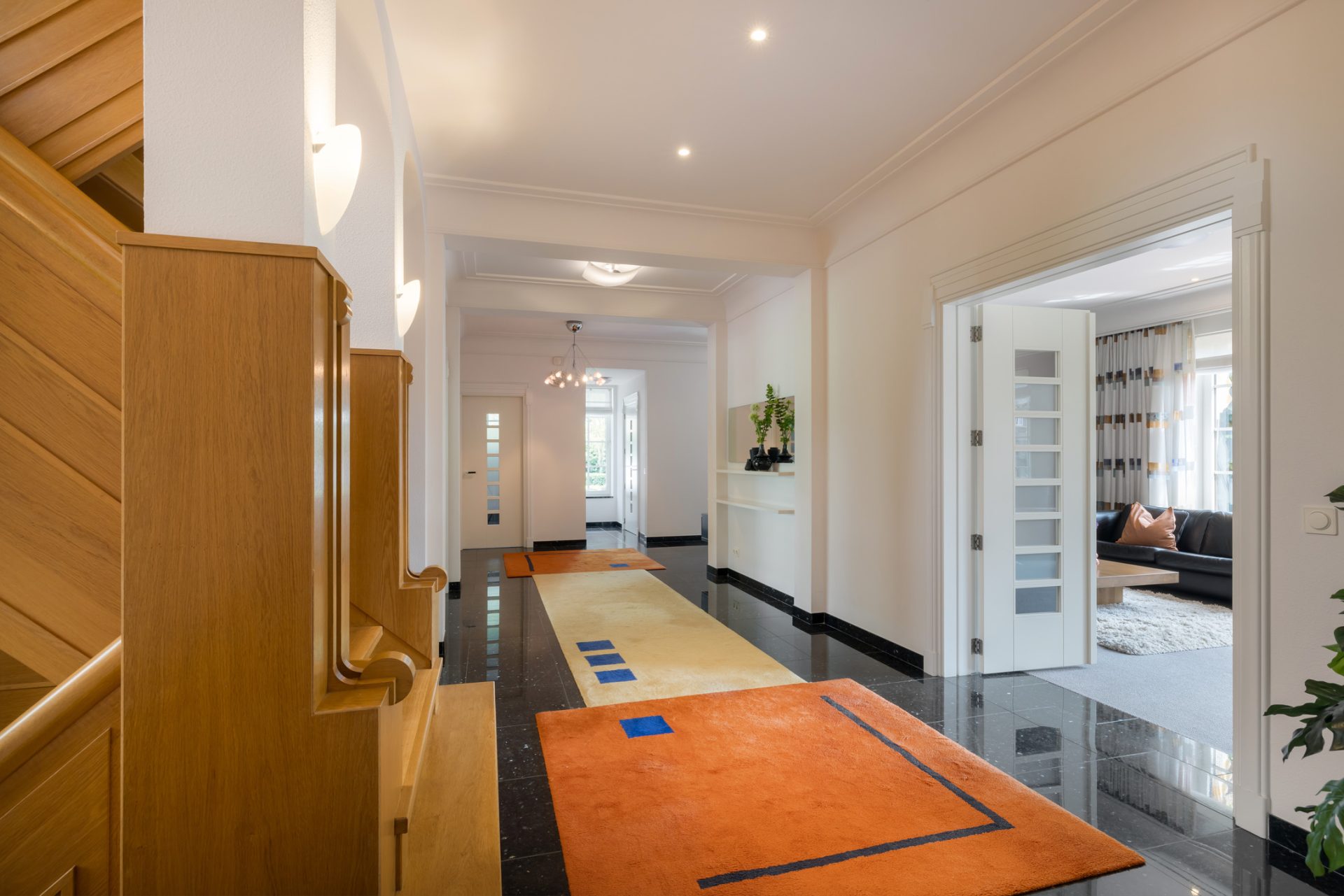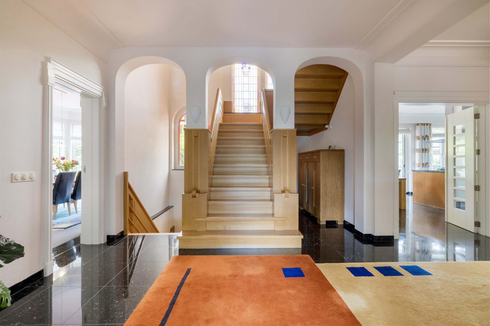 Vanaf de brede oprit is het een paar stappen naar het prachtige bordes van villa De Roskam. De enorme ontvangsthal met een Noors-granieten vloer, stijlplafonds en fraaie binnendeuren heeft een zeer royale maatvoering. Rechts in de hal zijn de garderobe en het ruime gastentoilet met luxe sanitair. In het achterste deel van de hal ziet u het imposante trappenhuis en meerdere kleurrijke glas in lood ramen.