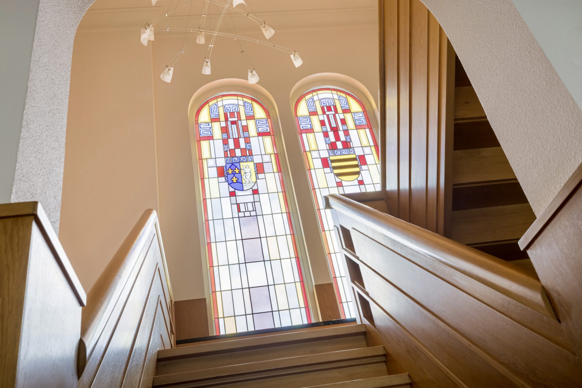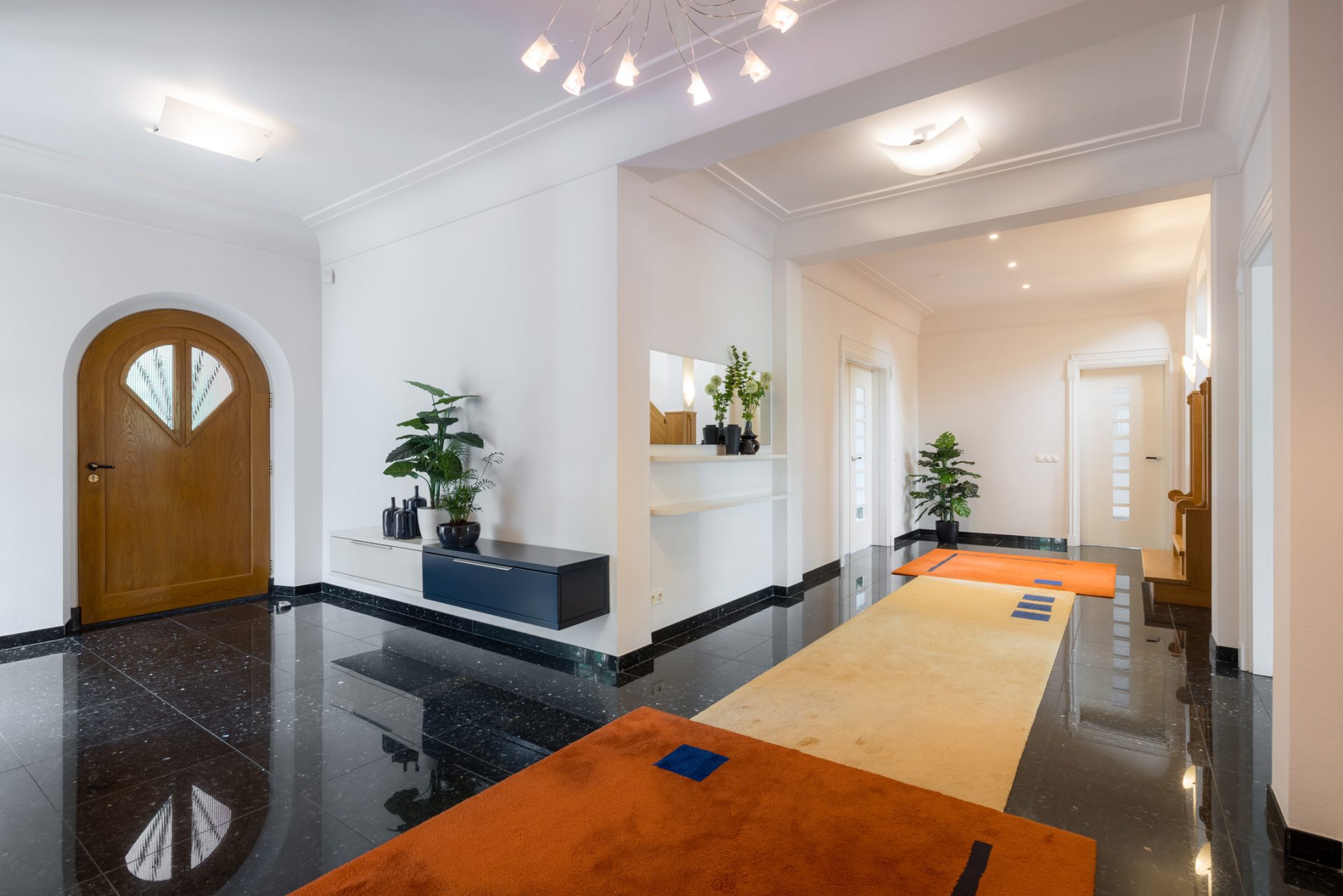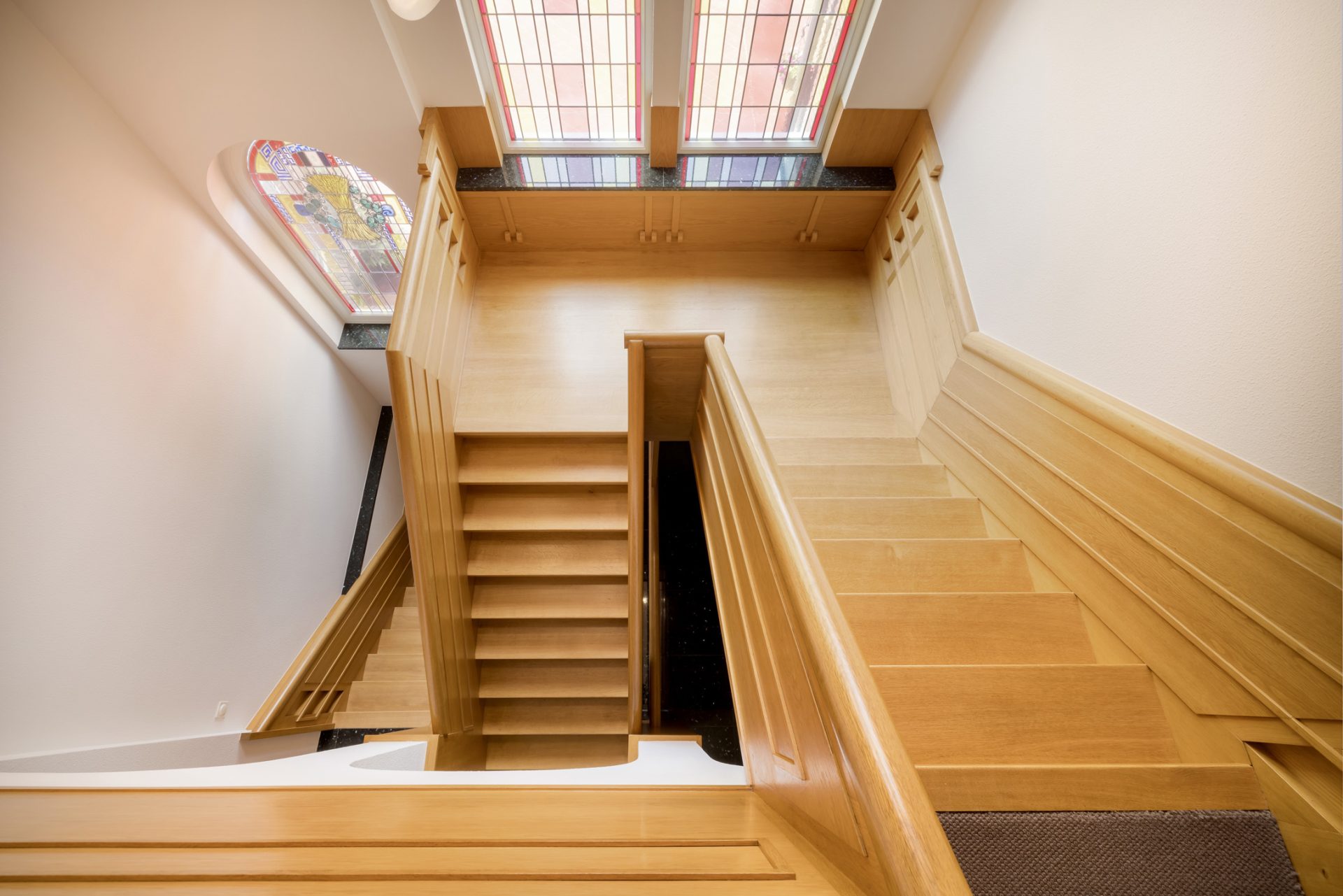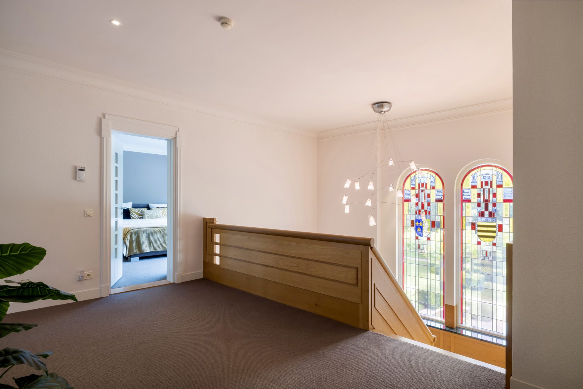 Vanaf de brede oprit is het een paar stappen naar het prachtige bordes van villa De Roskam. De enorme ontvangsthal met een Noors-granieten vloer, stijlplafonds en fraaie binnendeuren heeft een zeer royale maatvoering. Rechts in de hal zijn de garderobe en het ruime gastentoilet met luxe sanitair. In het achterste deel van de hal ziet u het imposante trappenhuis en meerdere kleurrijke glas in lood ramen.