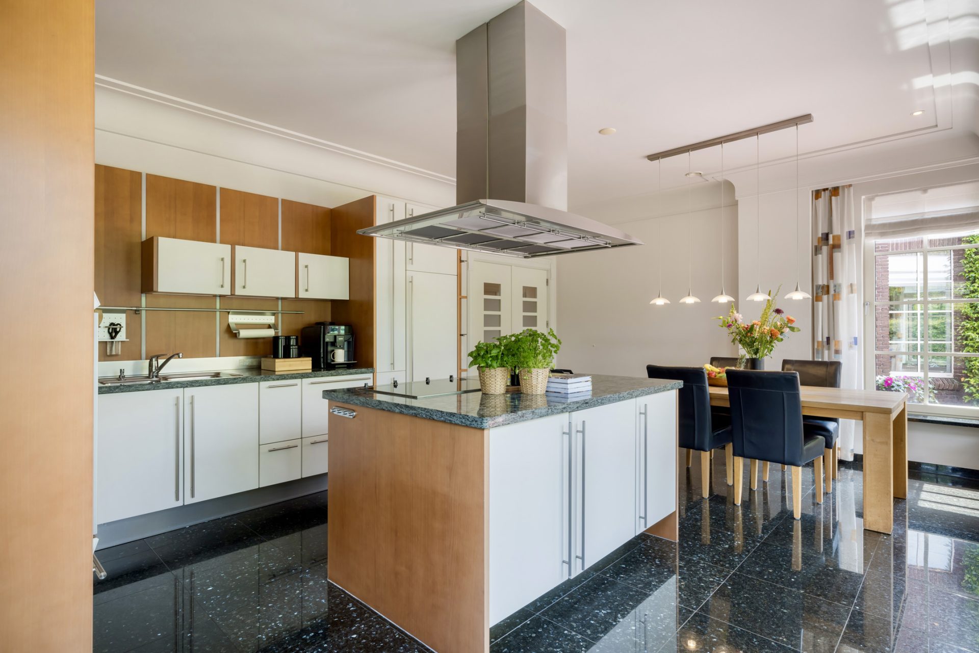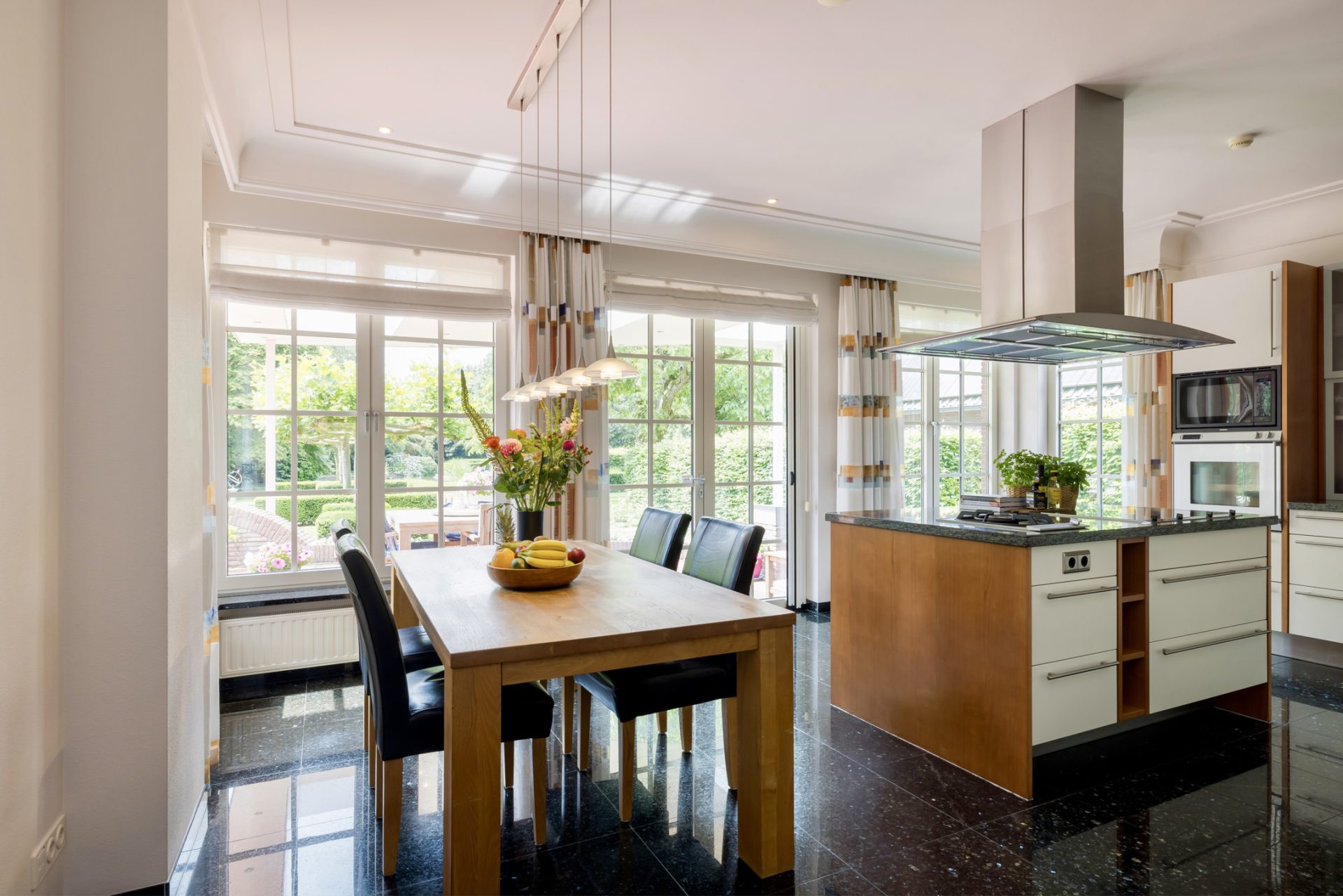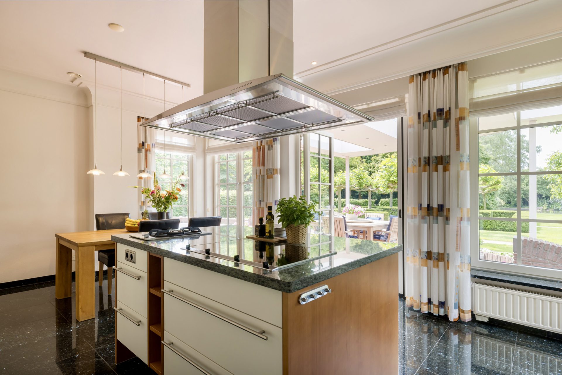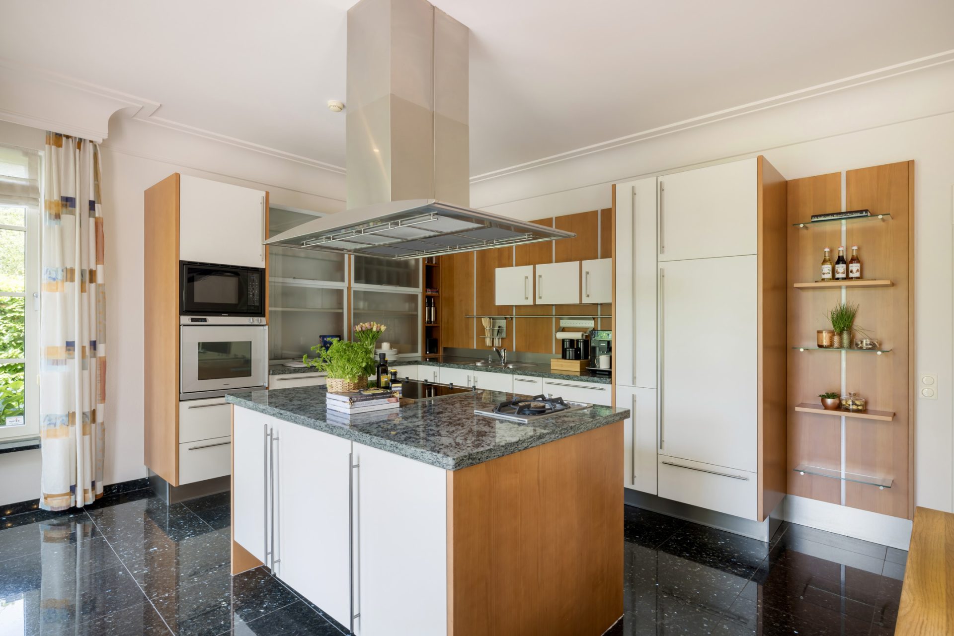 In het rechterdeel van de villa zijn de keuken met overdekt terras en de bijkeuken, voorzien van een eigen entree. Dubbele deuren verbinden de hal met de keuken en de keuken met het terras. In de keuken, met dezelfde Noors-granieten vloer als de hal, staat een zeer royale keukenopstelling met een kookeiland en aanrechtbladen van graniet. Alle benodigde apparatuur van topkwaliteit is ingebouwd, dus u kunt al snel beginnen met koken.