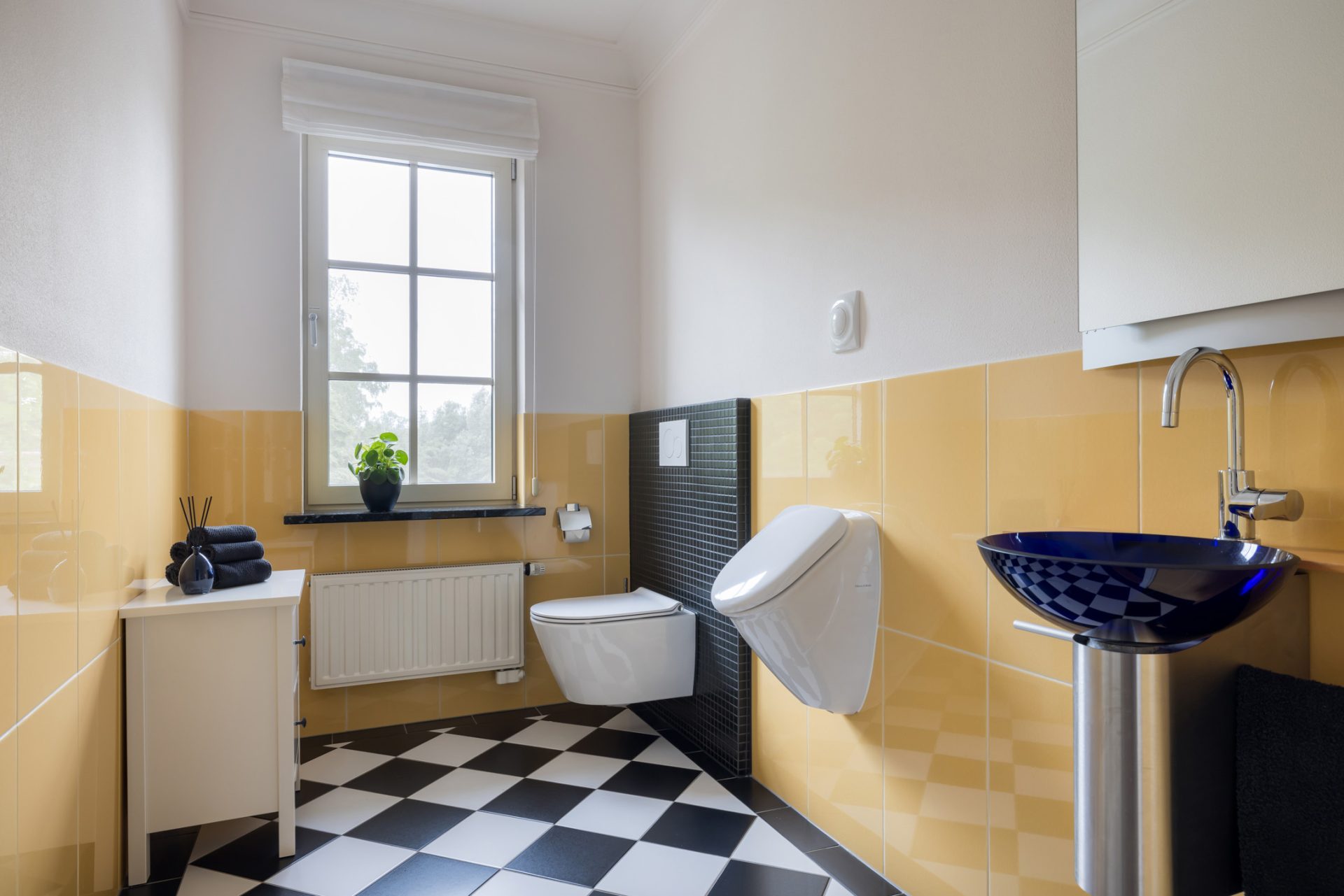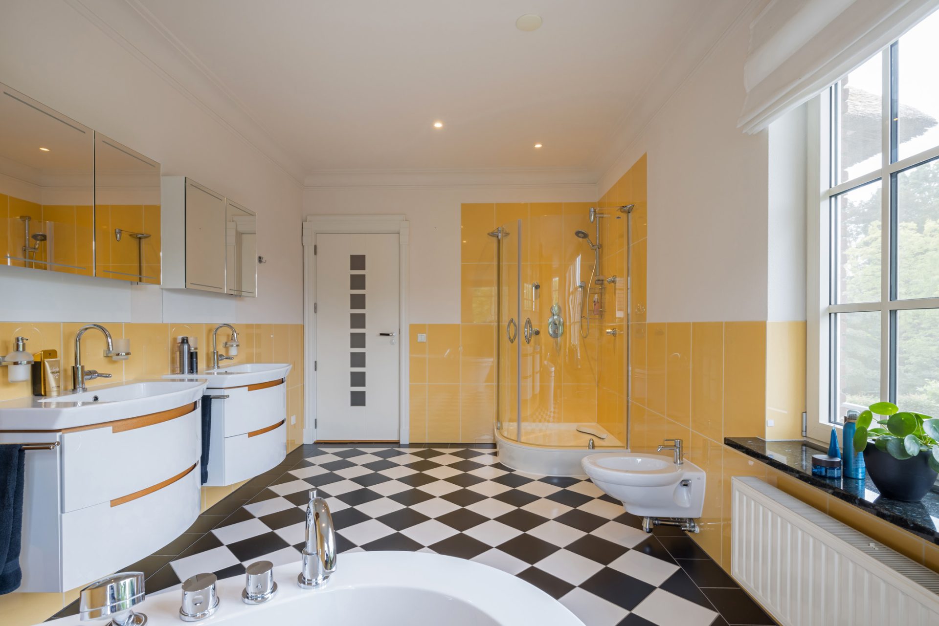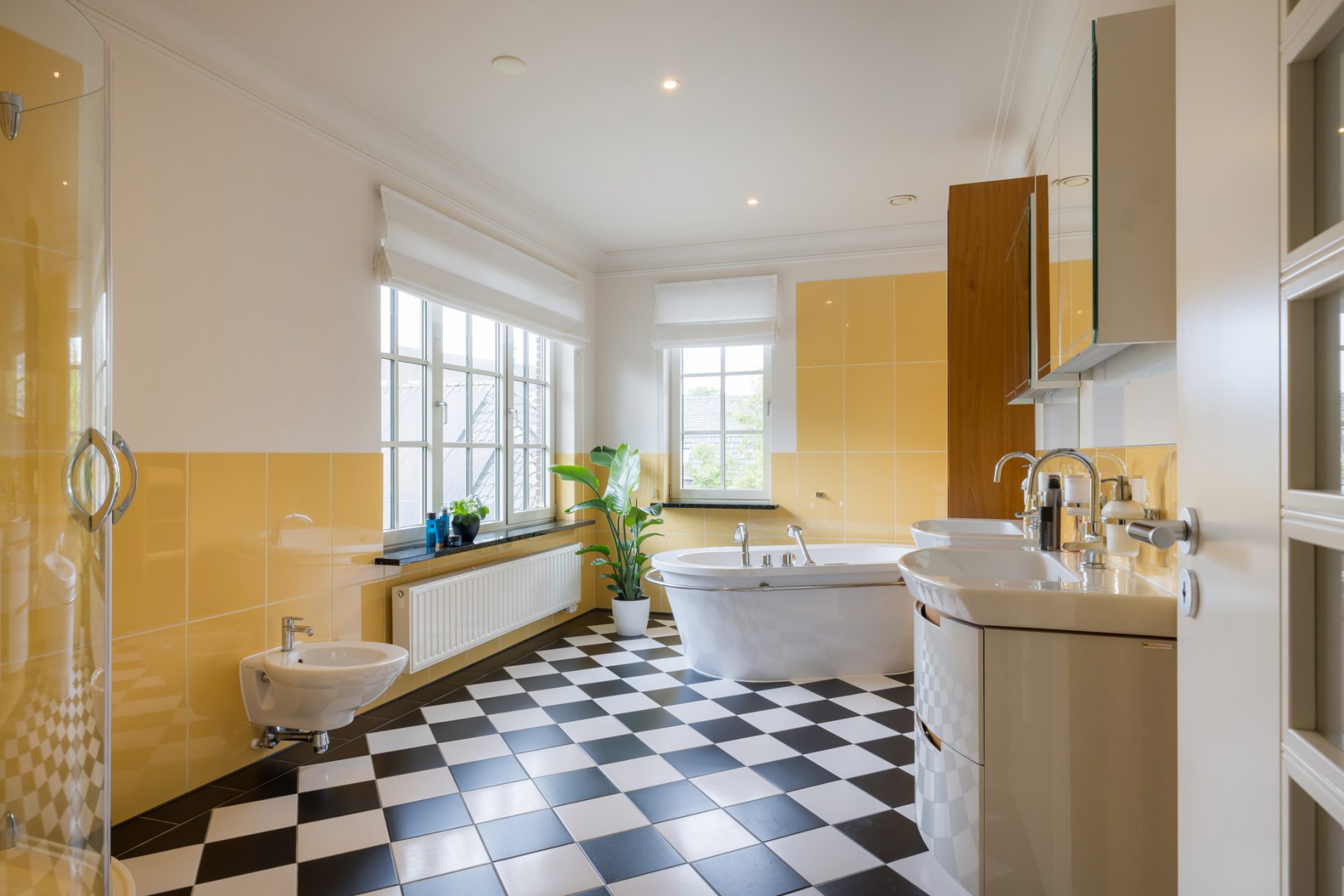 Aan de achterzijde, naast de vide, zijn het separate royale toilet en een stijlvolle badkamer met een vrijstaande whirlpool, aparte douche, bidet en twee wastafelmeubels. Wit-zwart geblokte vloertegels vormen een fraai geheel met de gele wandtegels en het moderne sanitair. Het uitzicht naar de diepe achtertuin is van ongekende schoonheid.
