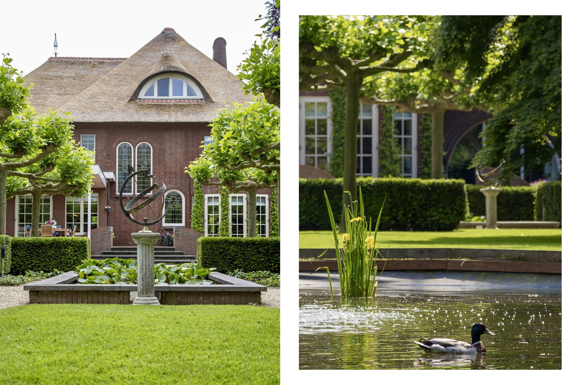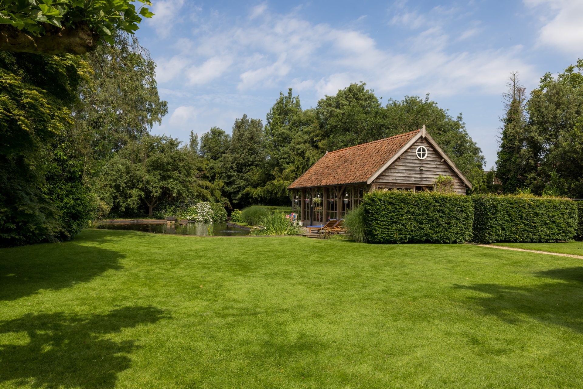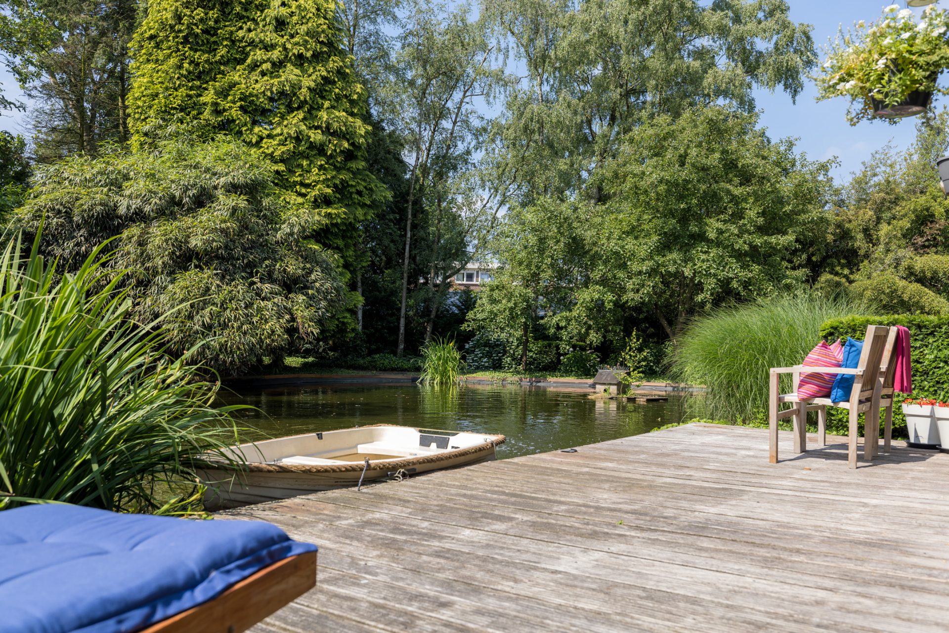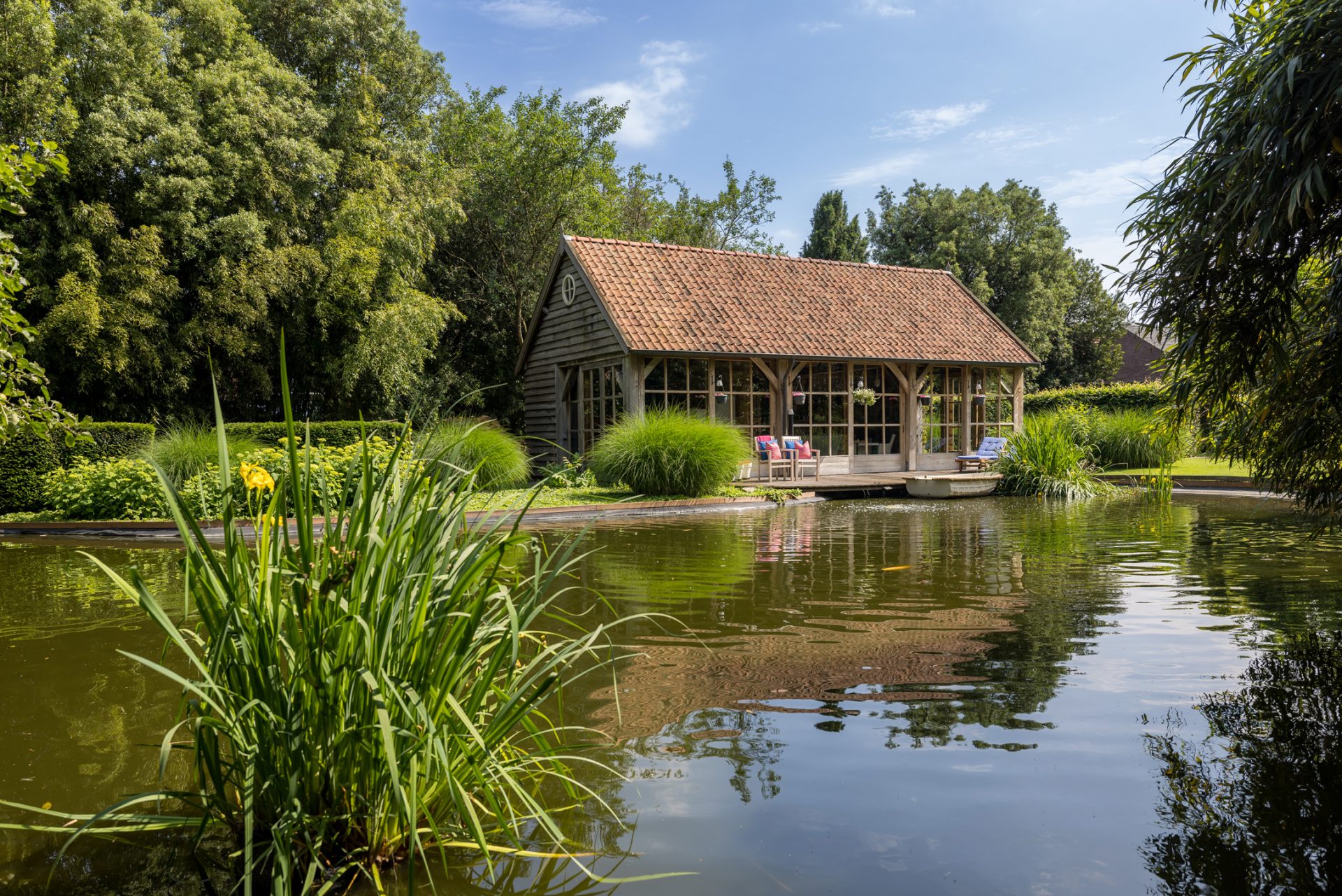 Blikvanger in de achtertuin is de grote vijver, waar eendjes regelmatig zwemmen. Het grote tuinhuis is door eiken schuifdeuren deelbaar in 2 compartimenten. Een houtkachel zorgt voor comfort en door het openen van alle deuren is er via een grote vlonder direct contact met de vijver en de tuin. Naast de tweede, strak vormgegeven vijver met waterplanten staat een klassieke zonnewijzer.
