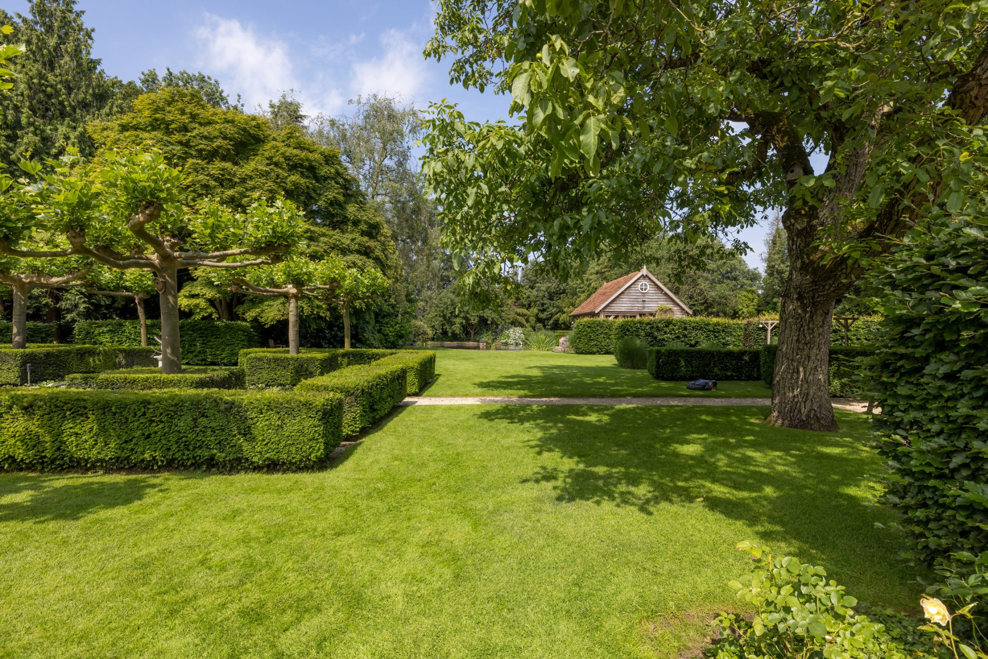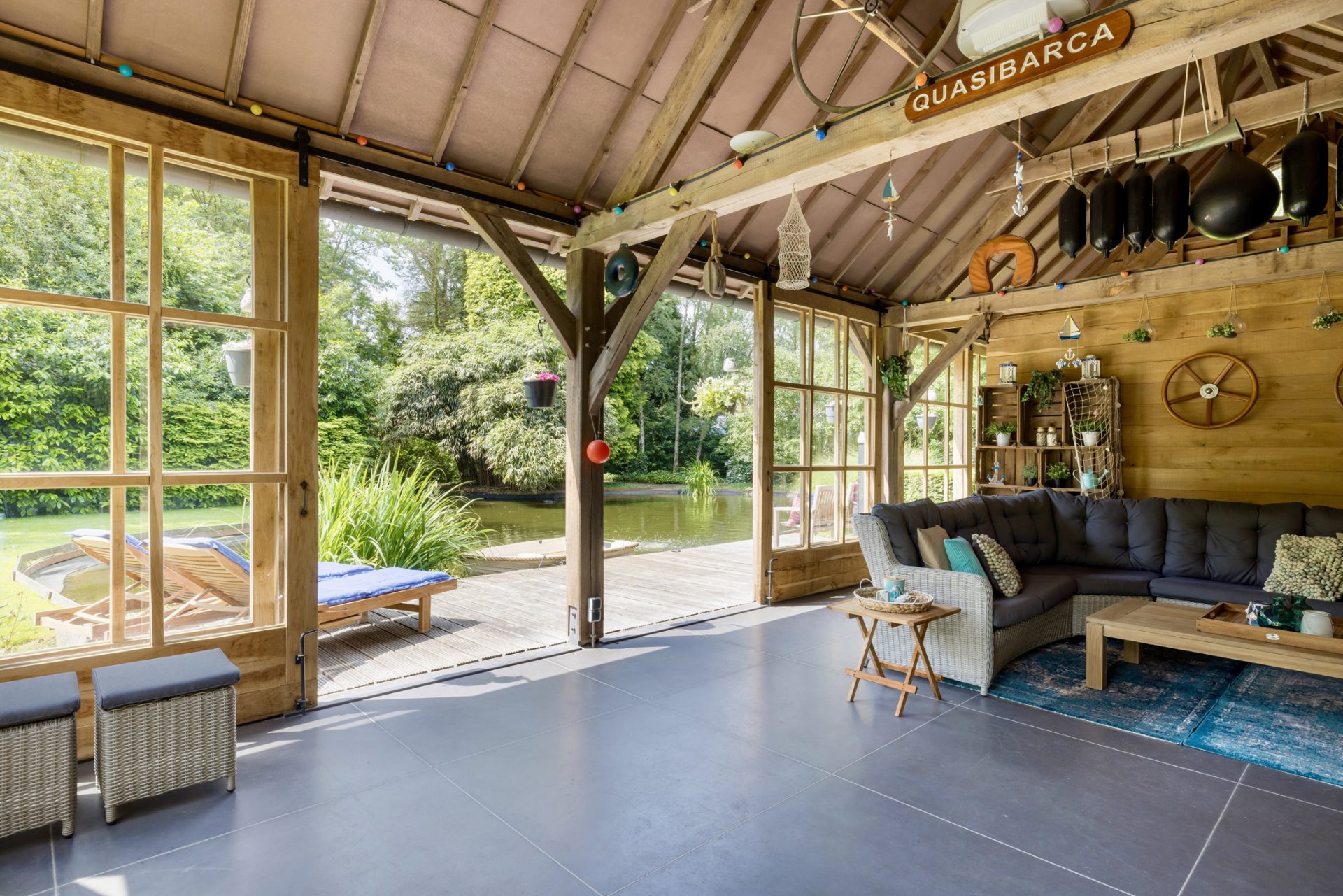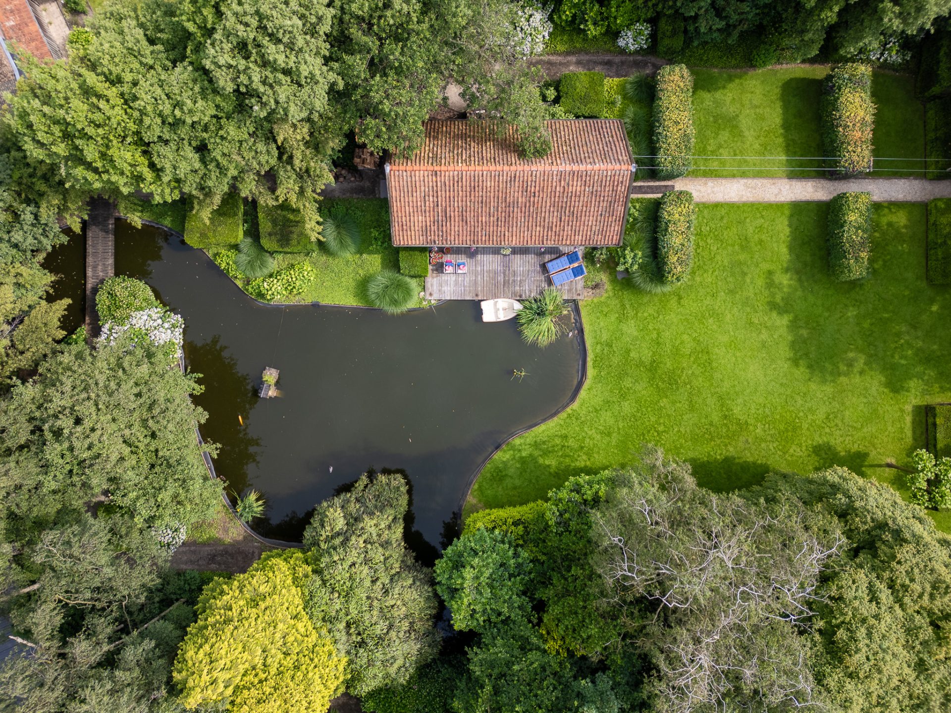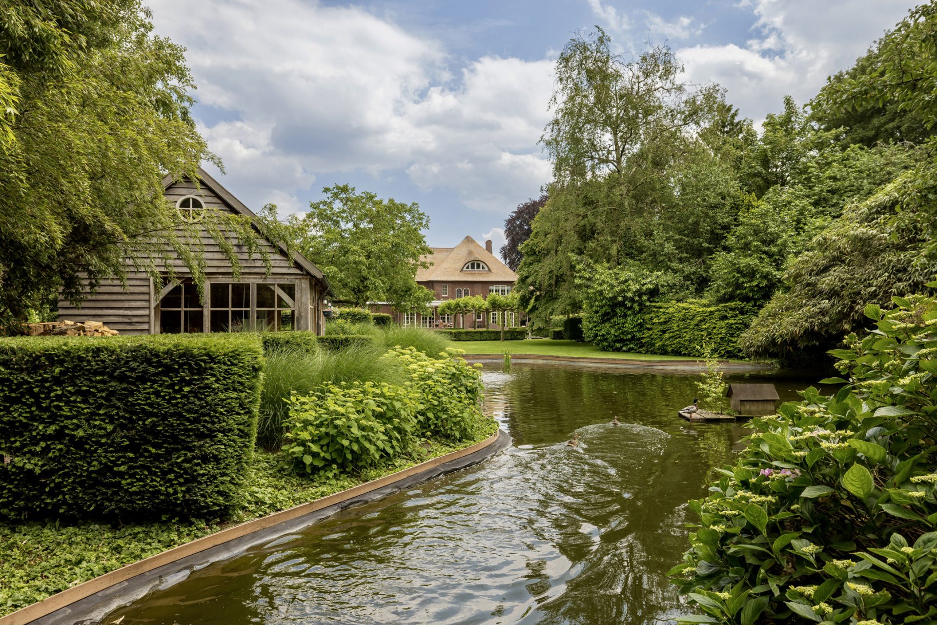 Blikvanger in de achtertuin is de grote vijver, waar eendjes regelmatig zwemmen. Het grote tuinhuis is door eiken schuifdeuren deelbaar in 2 compartimenten. Een houtkachel zorgt voor comfort en door het openen van alle deuren is er via een grote vlonder direct contact met de vijver en de tuin. Naast de tweede, strak vormgegeven vijver met waterplanten staat een klassieke zonnewijzer.