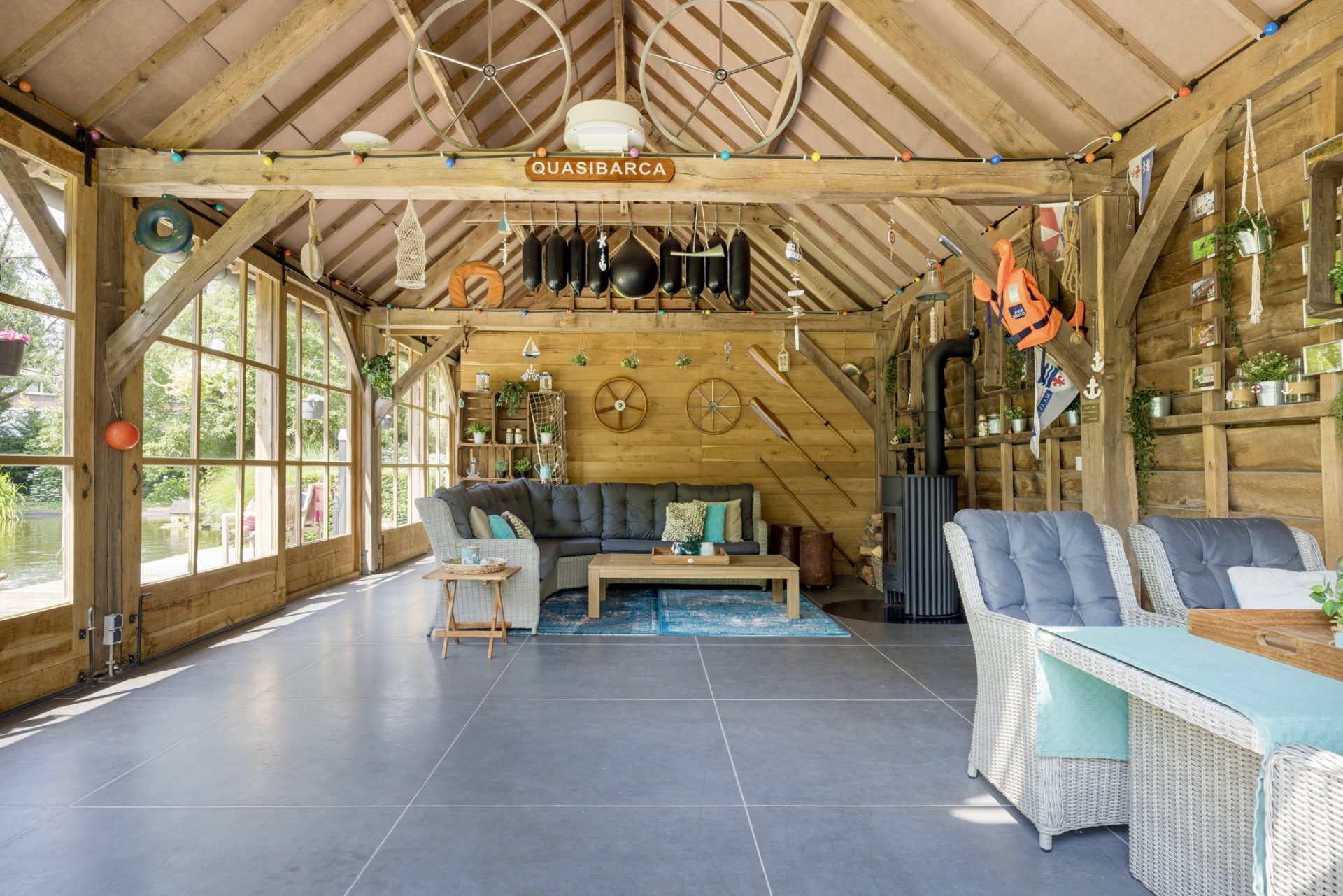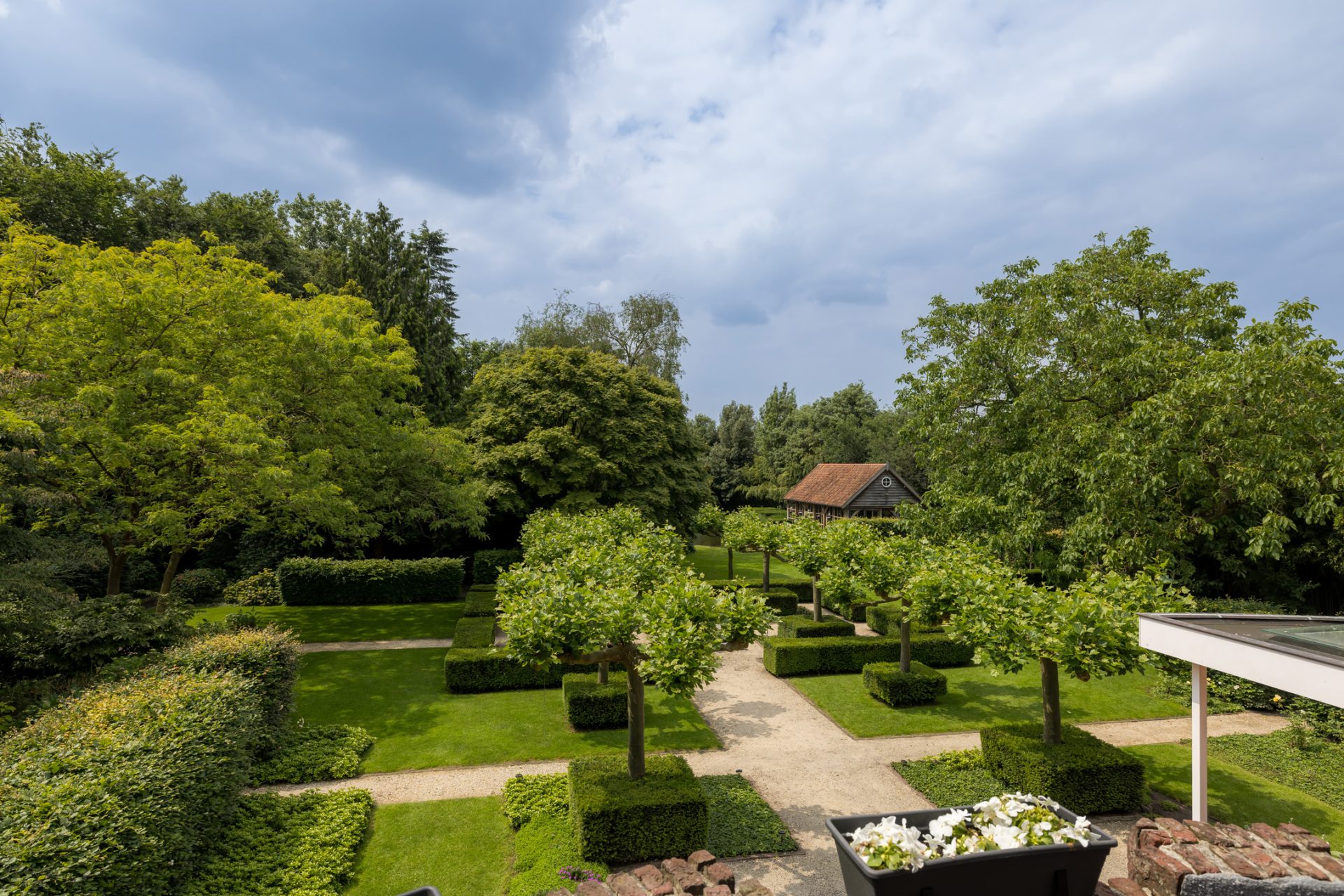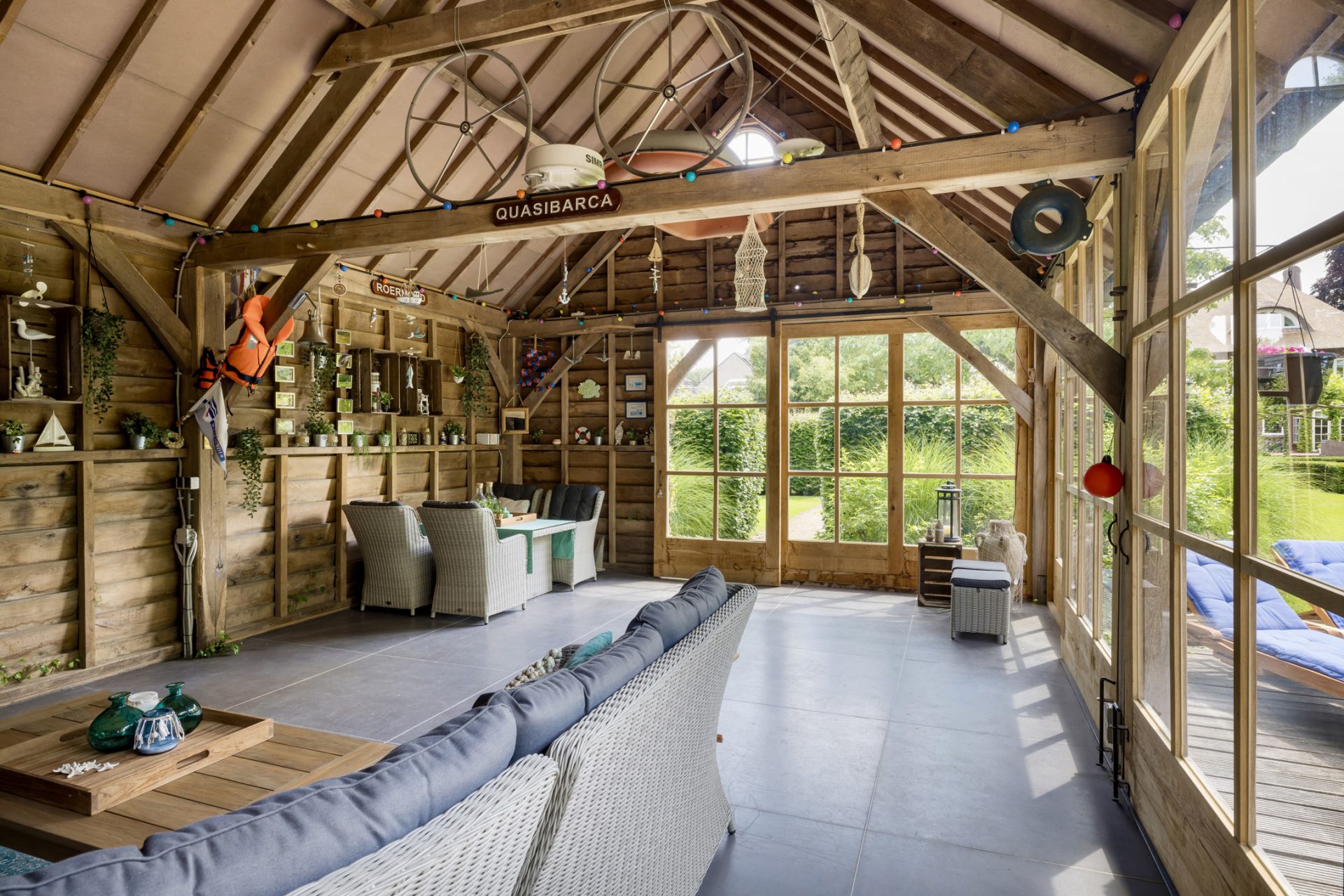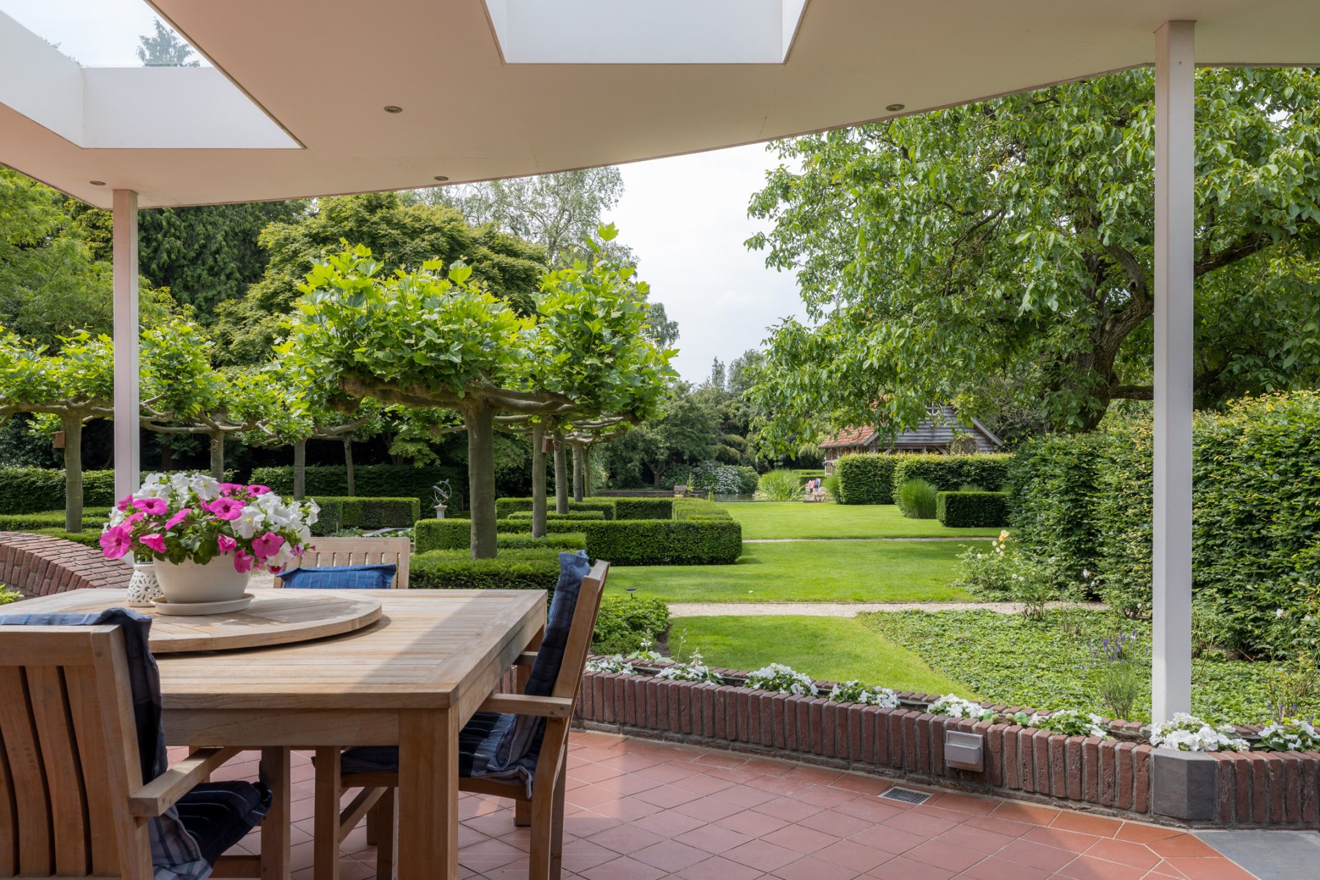 Blikvanger in de achtertuin is de grote vijver, waar eendjes regelmatig zwemmen. Het grote tuinhuis is door eiken schuifdeuren deelbaar in 2 compartimenten. Een houtkachel zorgt voor comfort en door het openen van alle deuren is er via een grote vlonder direct contact met de vijver en de tuin. Naast de tweede, strak vormgegeven vijver met waterplanten staat een klassieke zonnewijzer.
