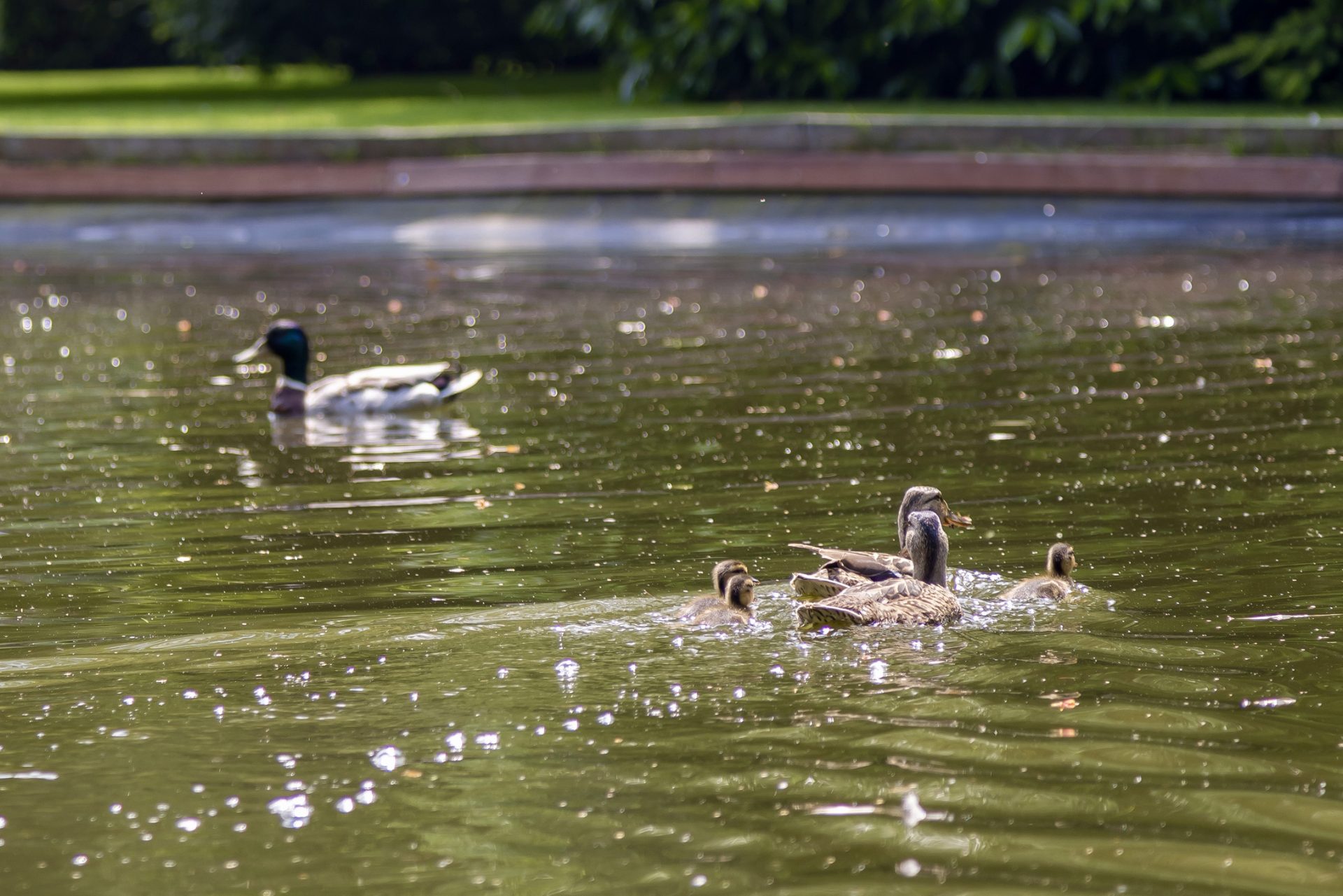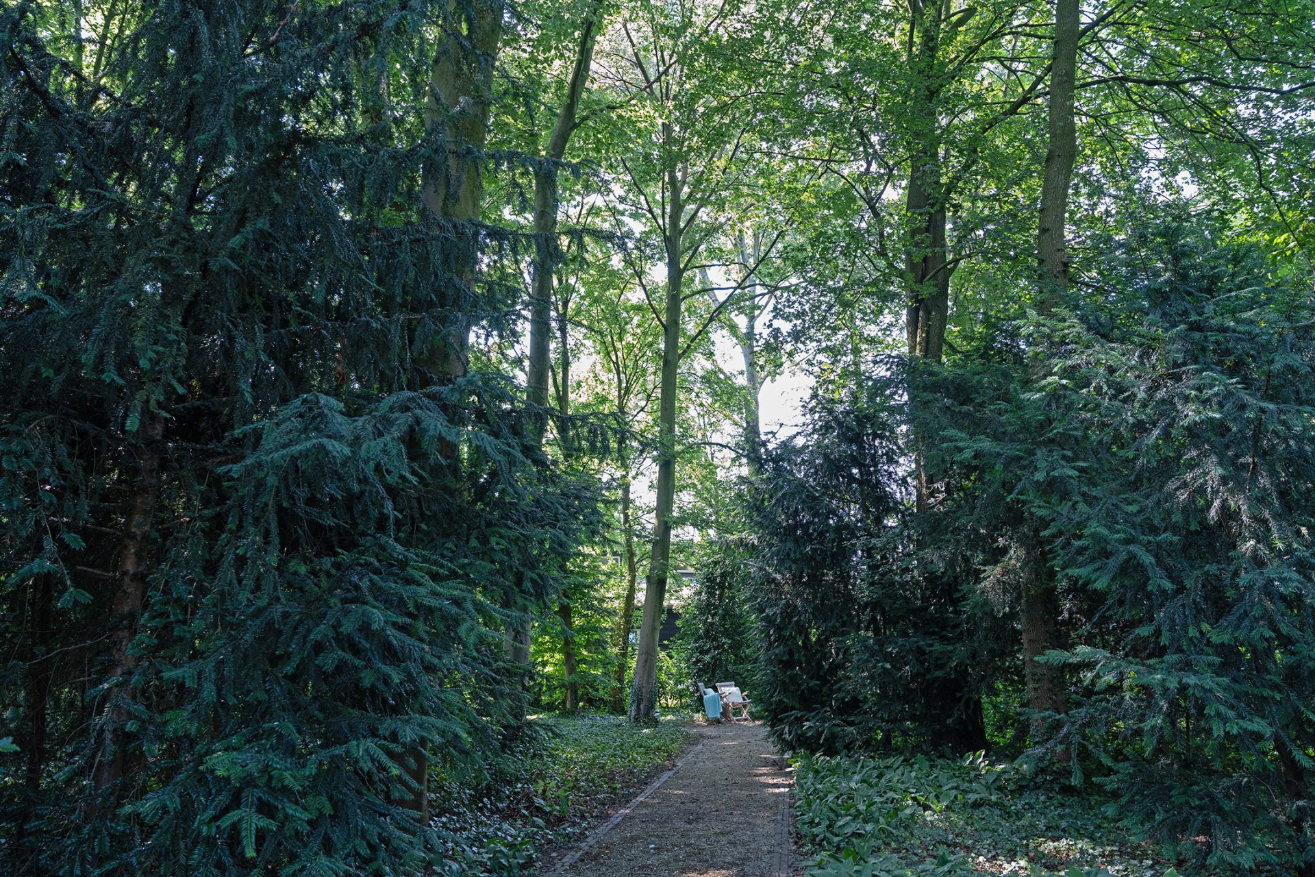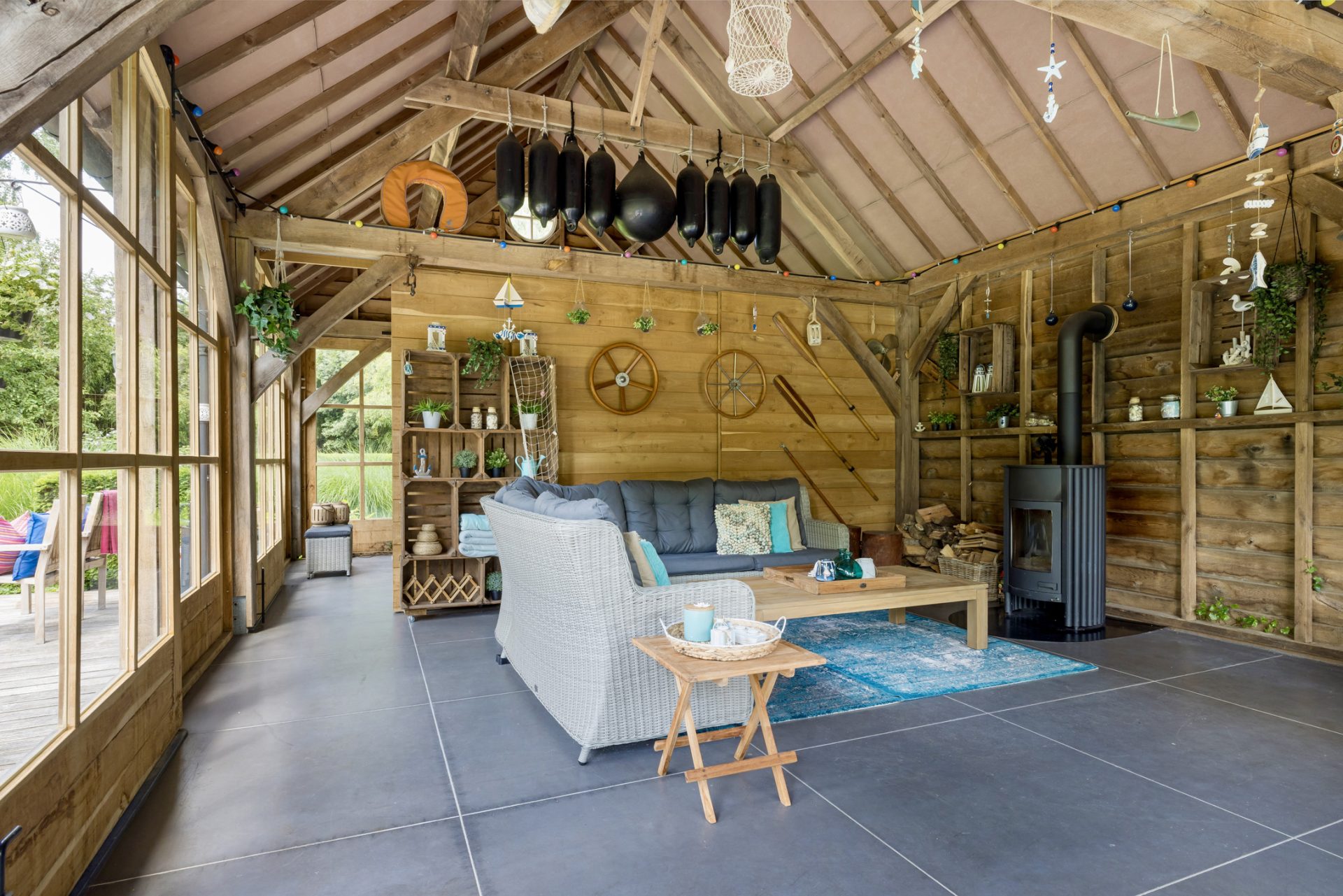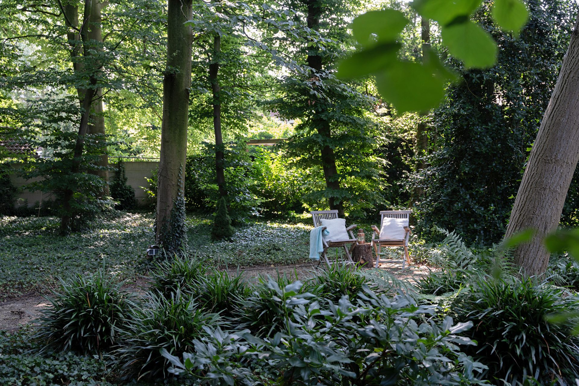 Blikvanger in de achtertuin is de grote vijver, waar eendjes regelmatig zwemmen. Het grote tuinhuis is door eiken schuifdeuren deelbaar in 2 compartimenten. Een houtkachel zorgt voor comfort en door het openen van alle deuren is er via een grote vlonder direct contact met de vijver en de tuin. Naast de tweede, strak vormgegeven vijver met waterplanten staat een klassieke zonnewijzer.