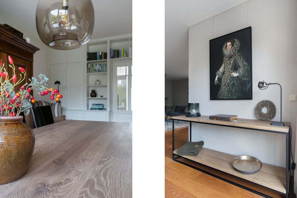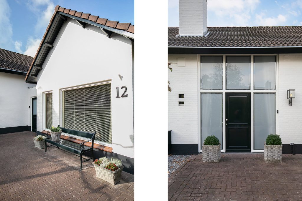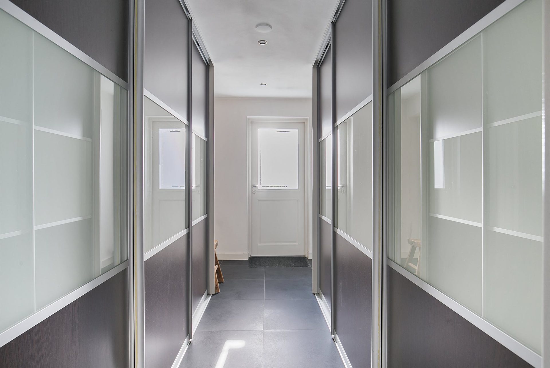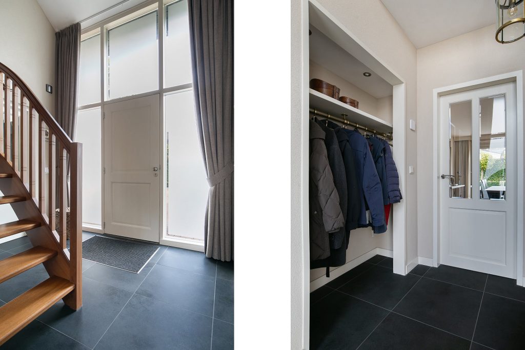 Vanaf de oprit zie je twee deuren. De deur aan de rechterzijde geeft toegang tot de bijkeuken en met ramen omringde deur leidt naar de hal. In de hal zie je dat deze woning met gebruik van hoogwaardige materialen is verbouwd. Onder de keramische tegelvloer ligt vloerverwarming en de hardhouten trap met vide heeft een fantastische uitstraling. Links in de hal, naast de garderobenis, is een moderne toiletruimte.