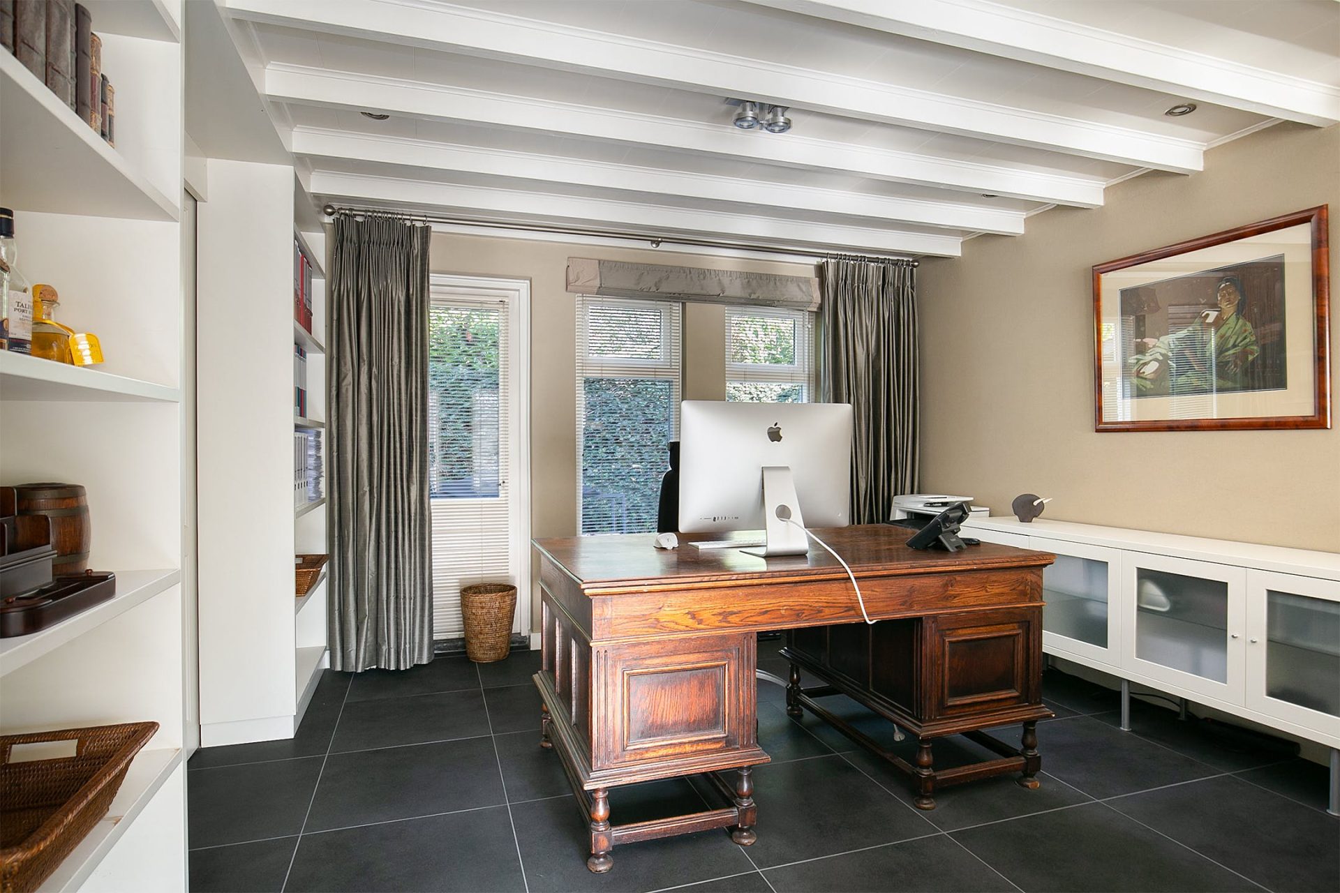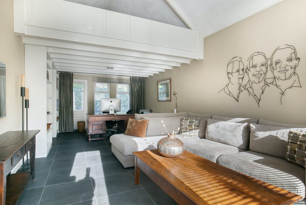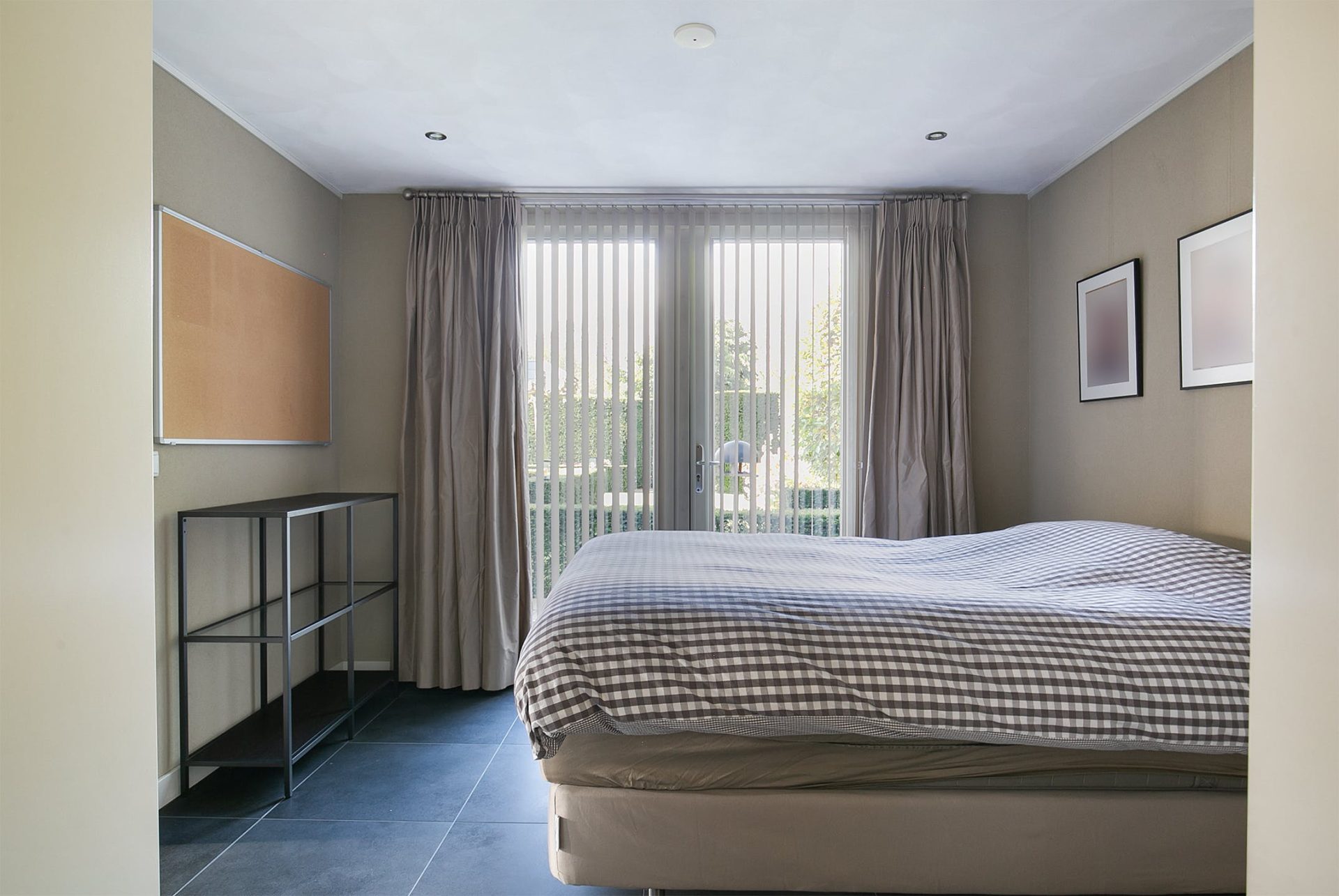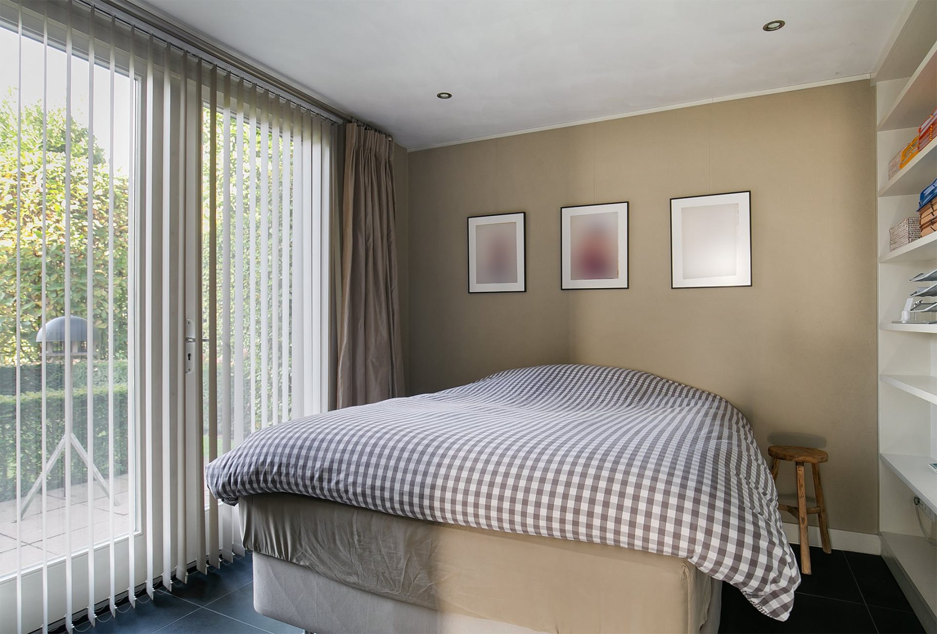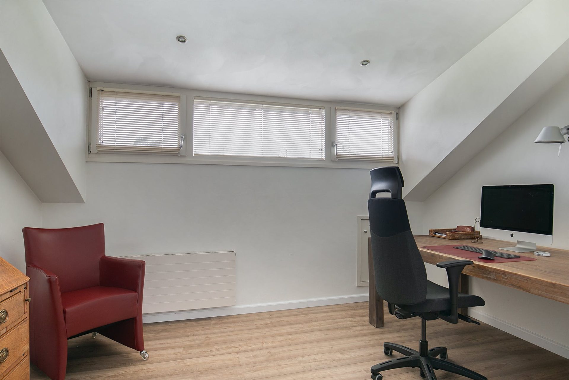 Vanuit deze praktische ruimte loop je naar de vierde slaapkamer met openslaande deuren naar de tuin. Aan de andere zijde zie je en-suite deuren naar het kantoor, voorzien van ramen aan twee zijden en een open zolder. In de slaapkamer en het kantoor ligt een dezelfde mooie tegelvloer met vloerverwarming. Mooi detail: de gehele benedenverdieping is drempelloos.