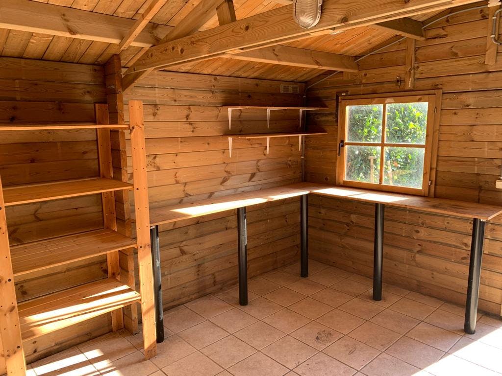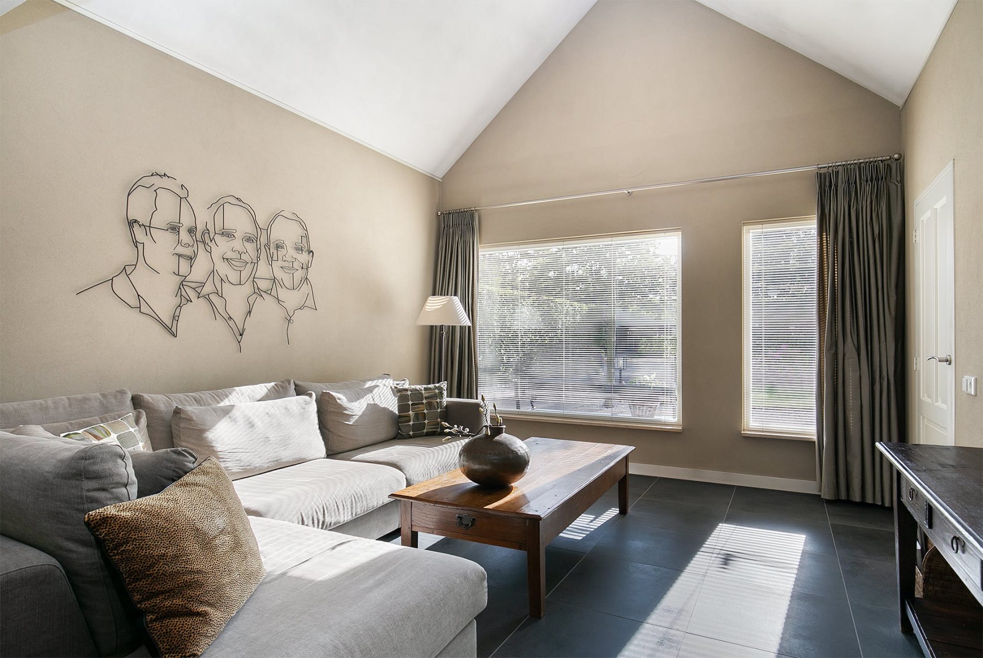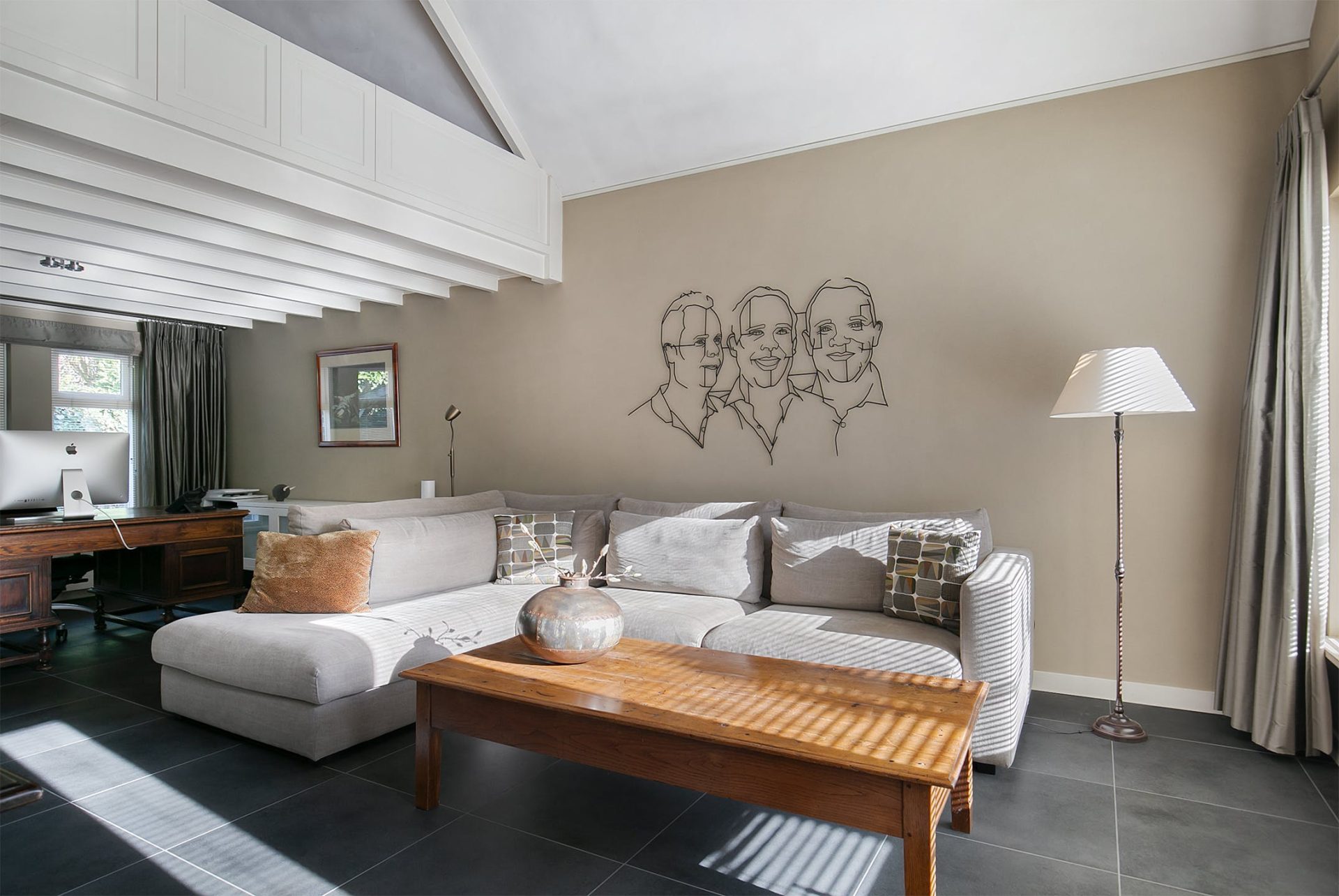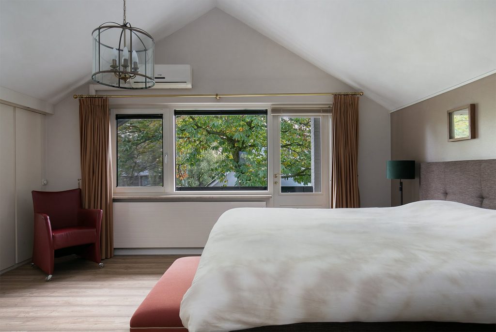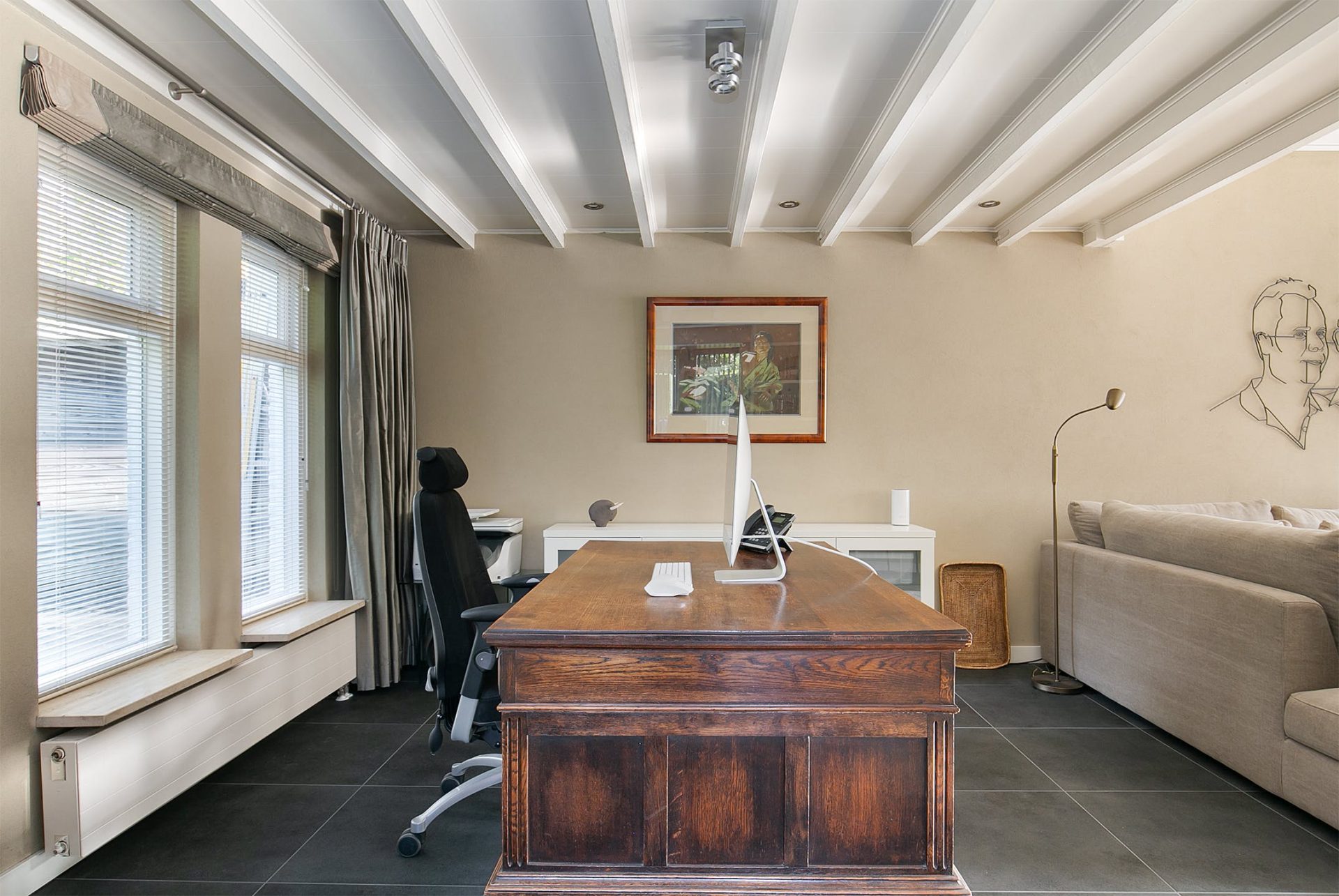 Vanuit deze praktische ruimte loop je naar de vierde slaapkamer met openslaande deuren naar de tuin. Aan de andere zijde zie je en-suite deuren naar het kantoor, voorzien van ramen aan twee zijden en een open zolder. In de slaapkamer en het kantoor ligt een dezelfde mooie tegelvloer met vloerverwarming. Mooi detail: de gehele benedenverdieping is drempelloos.