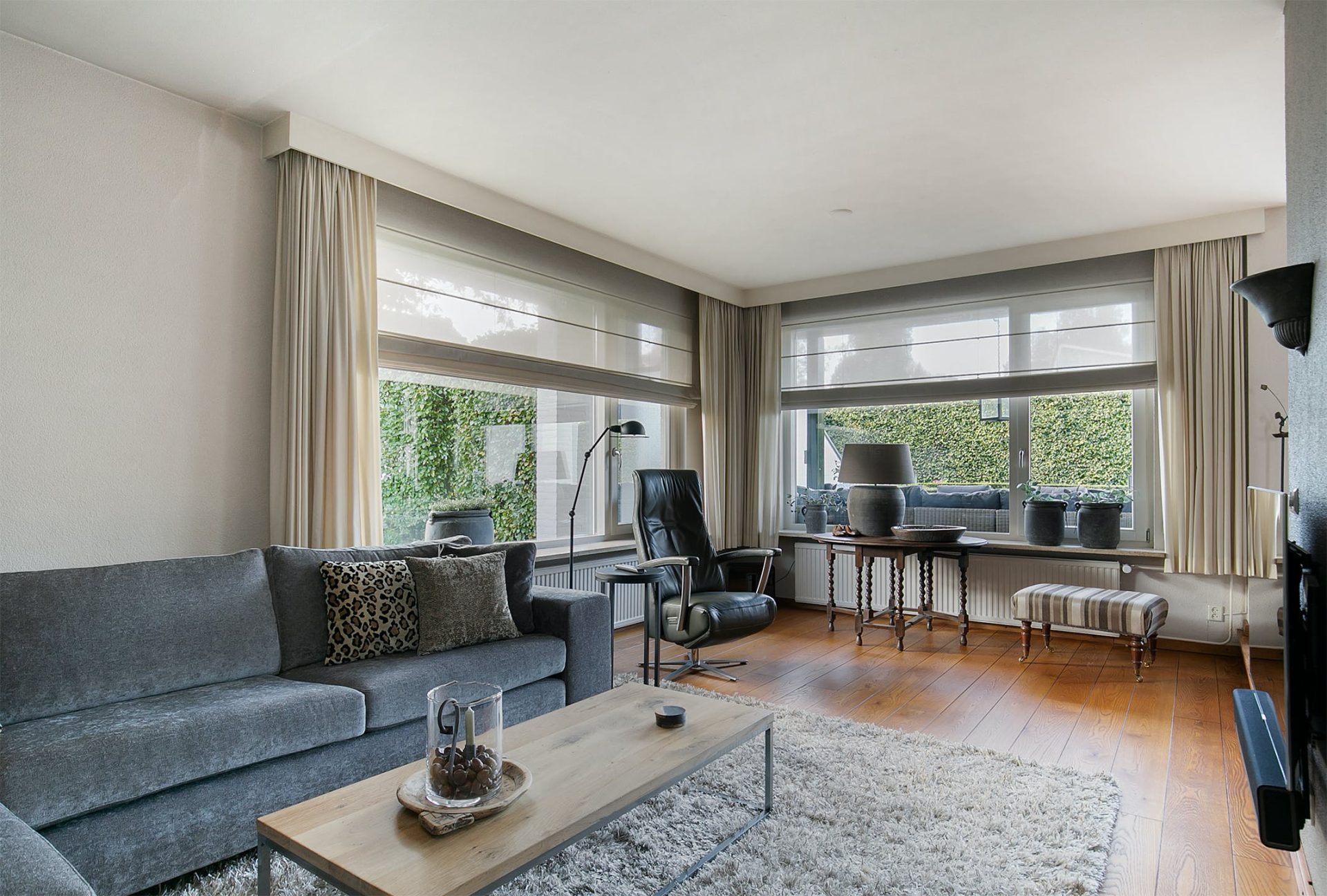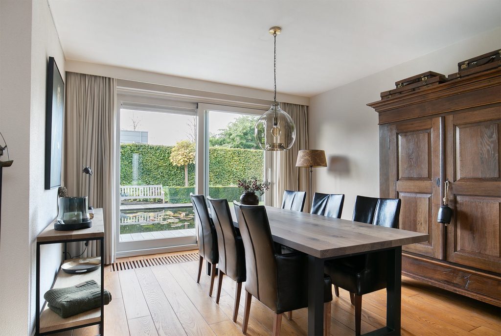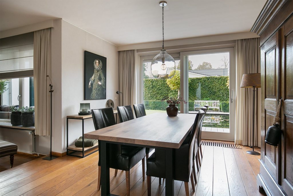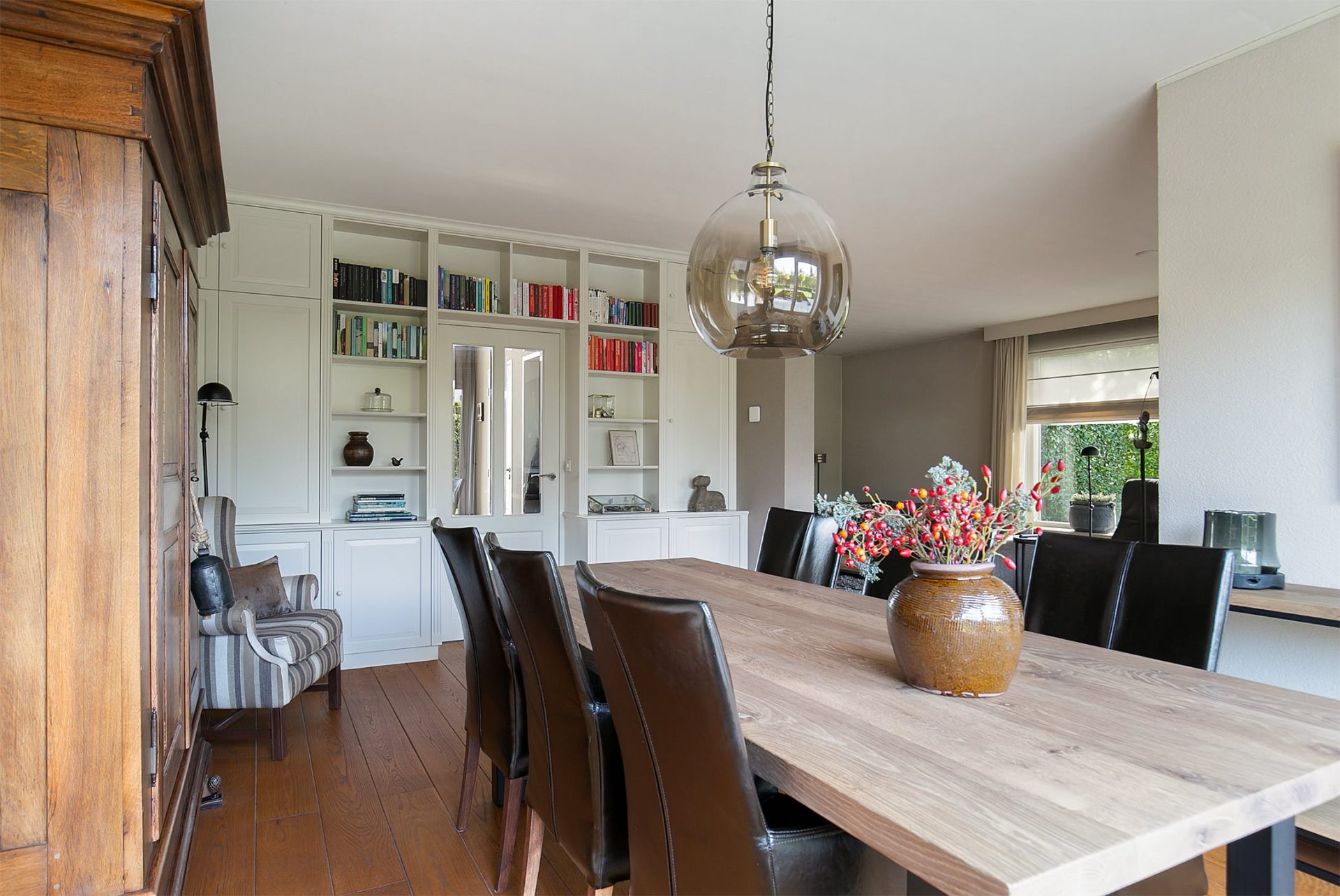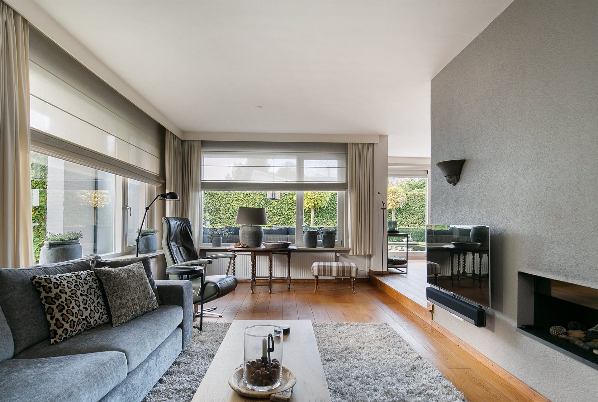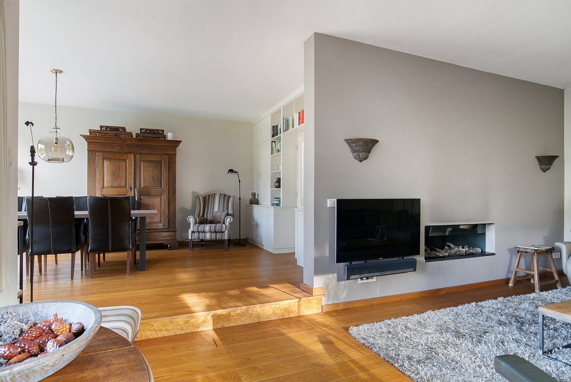 De woonkamer heeft een subtiel niveauverschil tussen het zit- en het eetgedeelte. Grote ramen bij het zitgedeelte en de brede schuifpui bij het eetgedeelte zorgen voor optimaal tuincontact en veel lichtinval. De zitkuil heeft een moderne gashaard en bij het eetgedeelte zie je een kamerhoge kastenwand met zowel open als gesloten delen.
