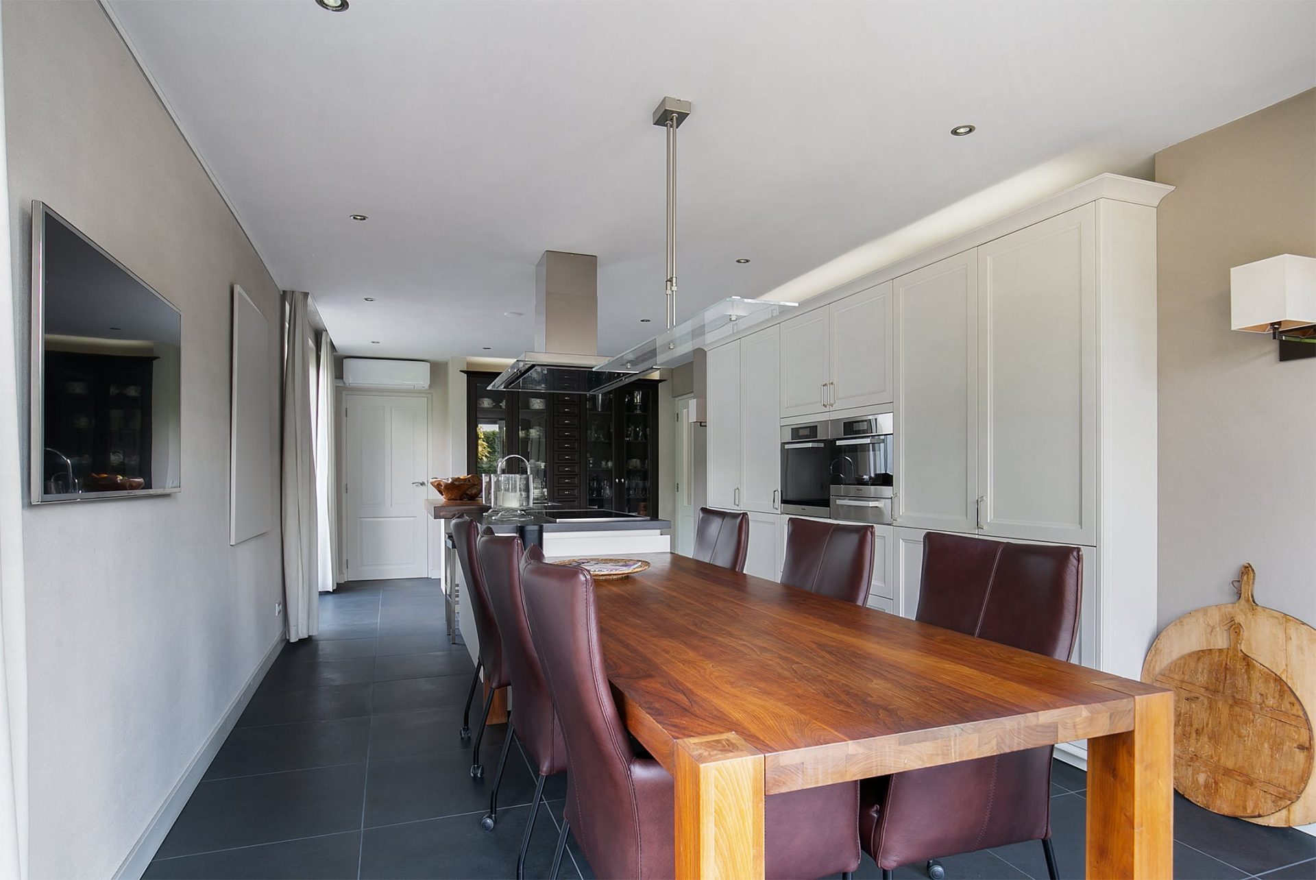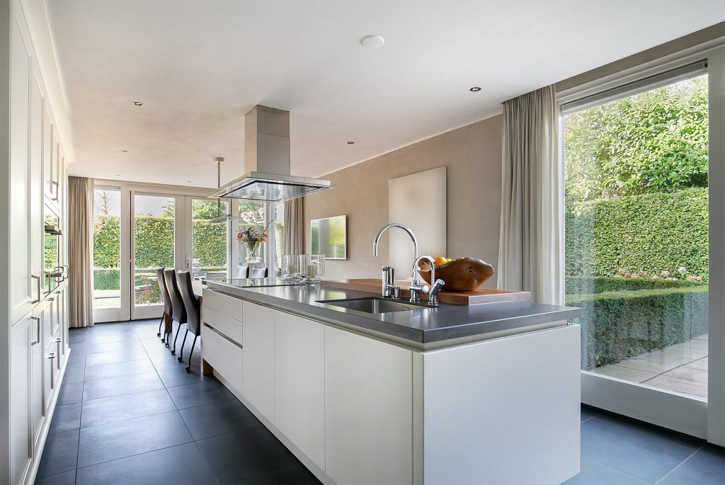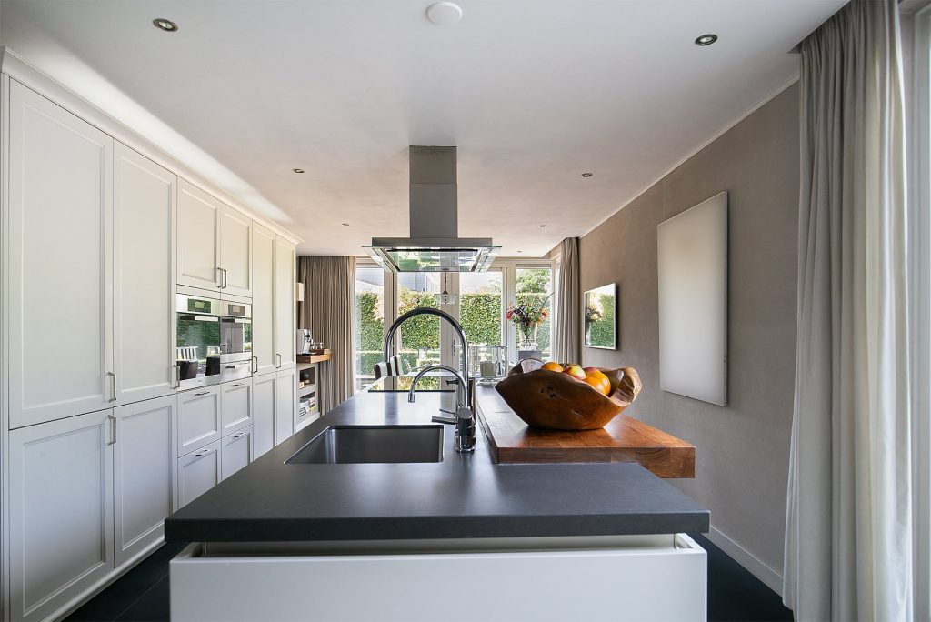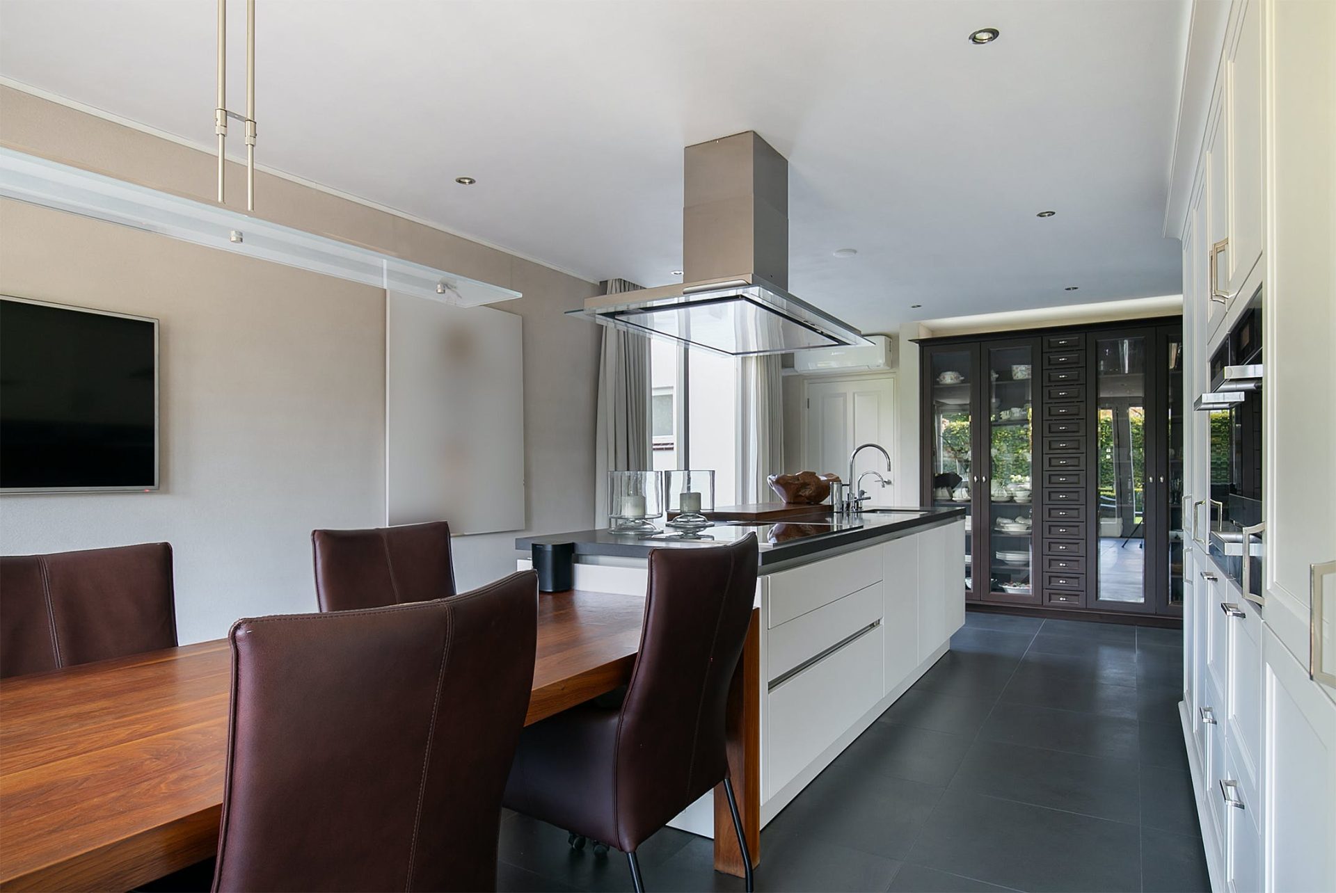Vanuit de hal is de bijna 9 meter lange eetkeuken te bereiken met openslaande deuren naar de tuin. De BeauxArts keuken van SieMatic (2008) heeft een lange kastenwand, een kook-/spoeleiland met notenhouten eetbar en een koffie nis. In de keuken is ruimte voor een grote eettafel. De keukenopstelling is voorzien van alle moderne inbouwapparatuur (Miele) waaronder een inductiekookplaat, quooker, oven, combi-oven/magnetron en een warmhoudlade. Vanuit de keuken is de bijkeuken bereikbaar met aan weerszijden een kastenwand met schuifdeuren.