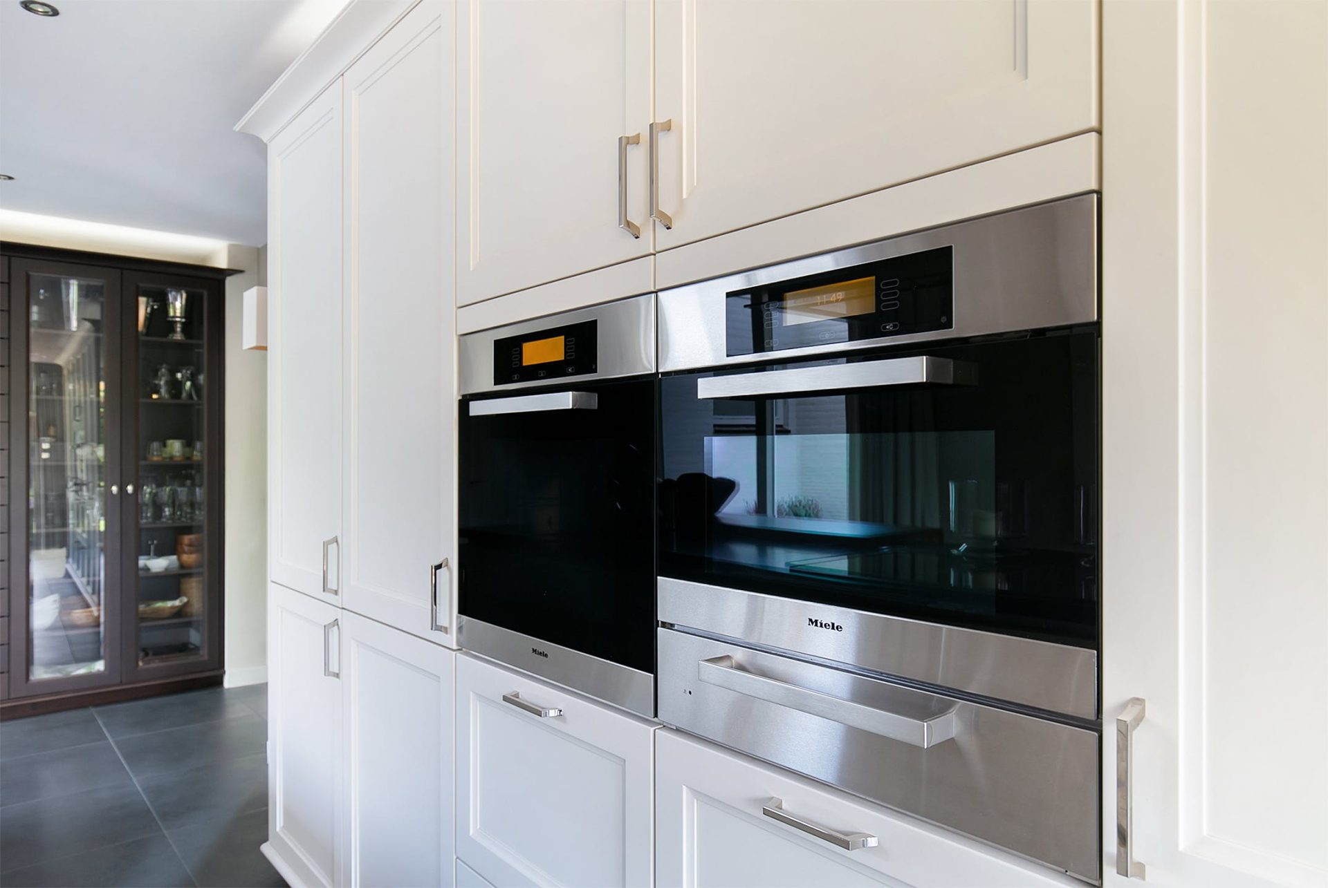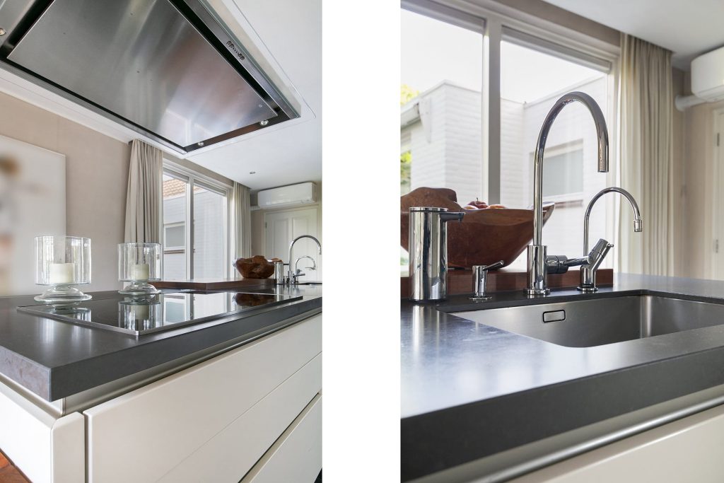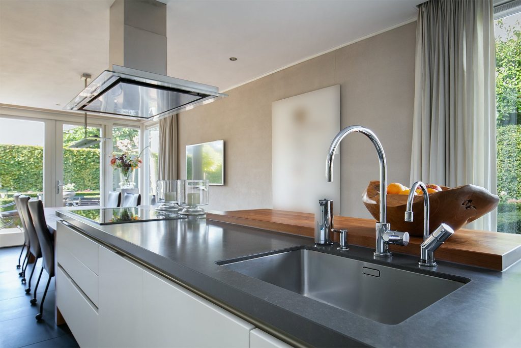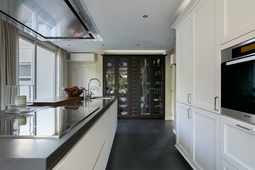 Vanuit de hal is de bijna 9 meter lange eetkeuken te bereiken met openslaande deuren naar de tuin. De BeauxArts keuken van SieMatic (2008) heeft een lange kastenwand, een kook-/spoeleiland met notenhouten eetbar en een koffie nis. In de keuken is ruimte voor een grote eettafel. De keukenopstelling is voorzien van alle moderne inbouwapparatuur (Miele) waaronder een inductiekookplaat, quooker, oven, combi-oven/magnetron en een warmhoudlade. Vanuit de keuken is de bijkeuken bereikbaar met aan weerszijden een kastenwand met schuifdeuren.