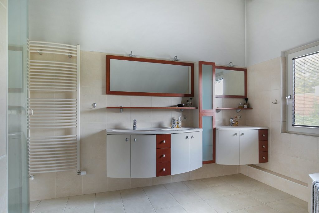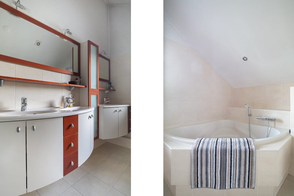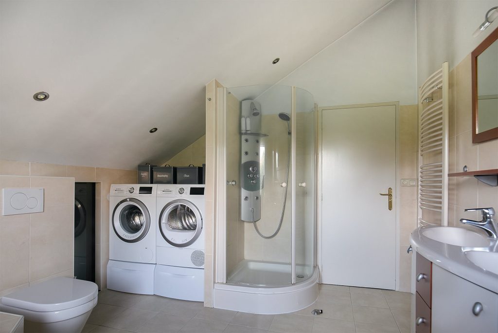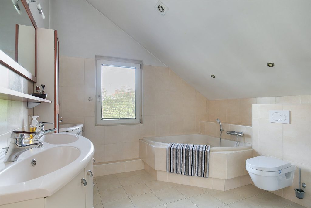 De badkamer is ingedeeld met een hoekbad, tweede toilet, twee wastafelmeubels met drie wastafels, een luxe douche, een hoge designradiator, inbouwverlichting en een nis voor de wasapparatuur. De wanden zijn deels betegeld en deels gestuct.