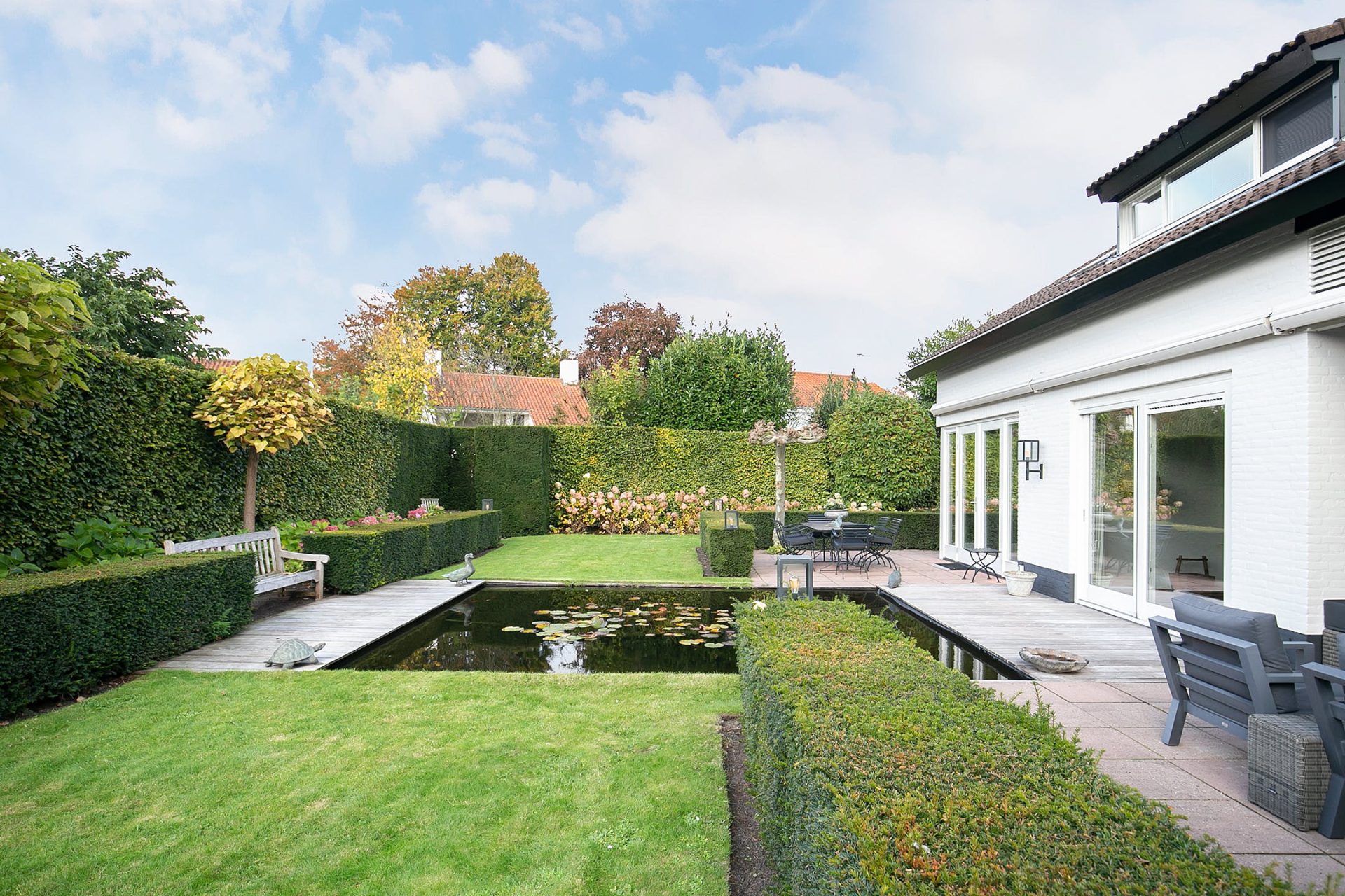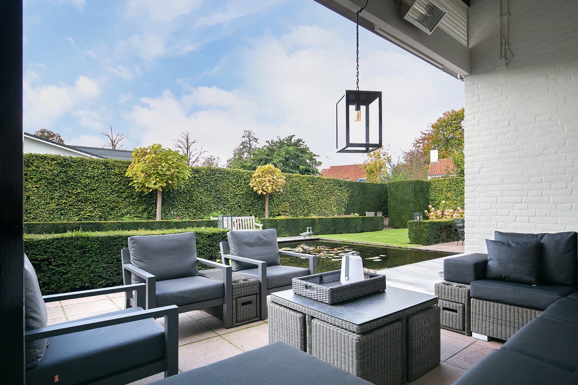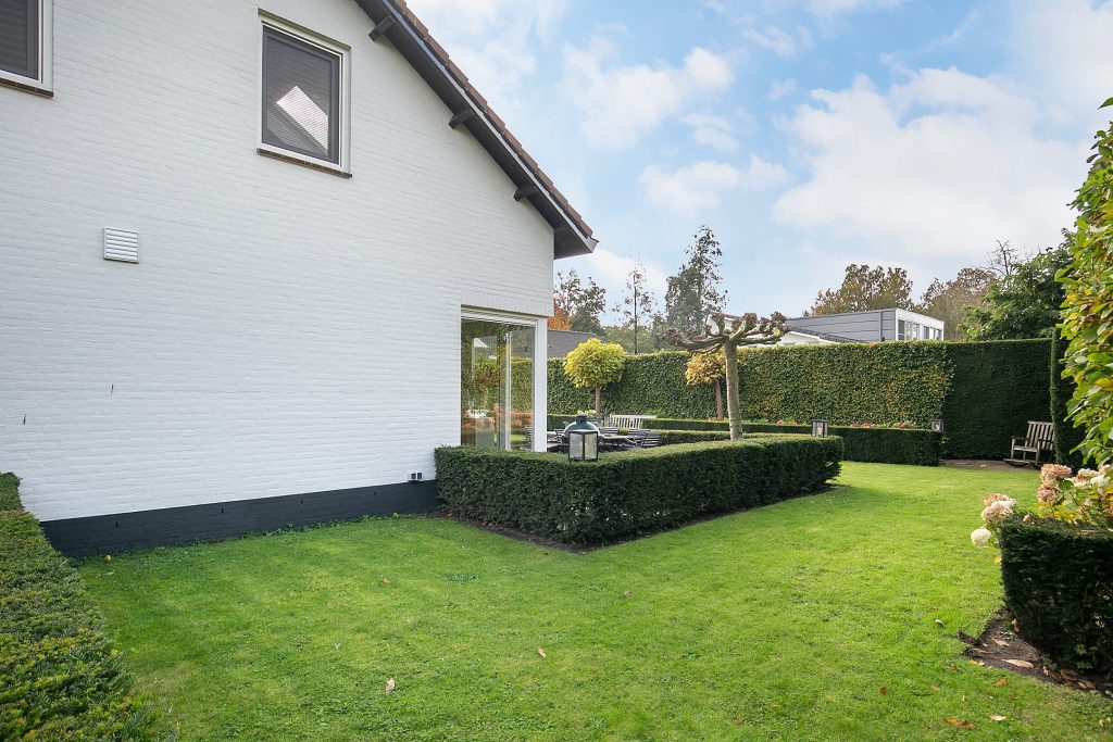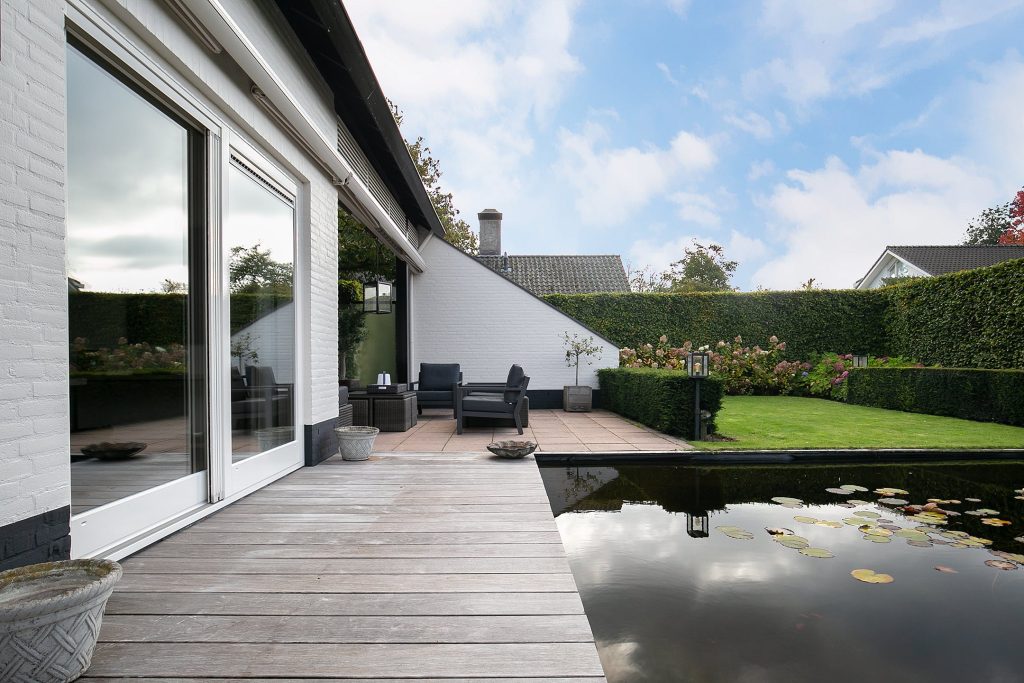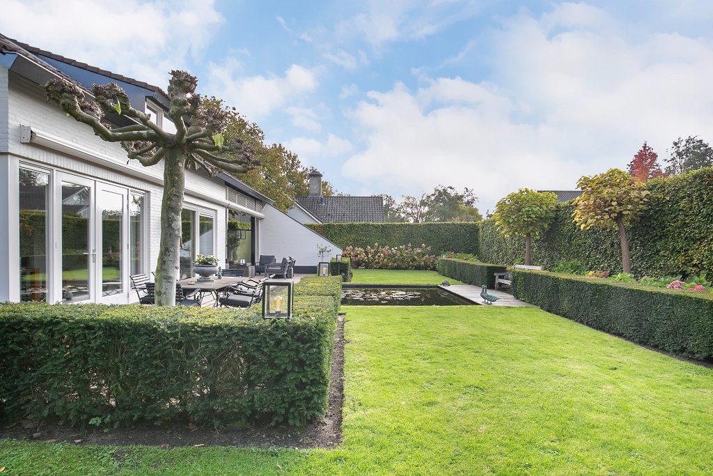 De beukenhaag aan vier zijden zorgt voor veel privacy. De achter- en zijtuin zijn ingedeeld met een groot gazon, diverse beplanting en een vierkante vijver met waterlelies. Er zijn twee terrassen aan de zuidwest kant waarvan één deels overdekt is en voorzien van terrasverwarming. Over de hele breedte zijn er elektrisch bedienbare zonneschermen waardoor u naar wens in de schaduw kunt zitten.