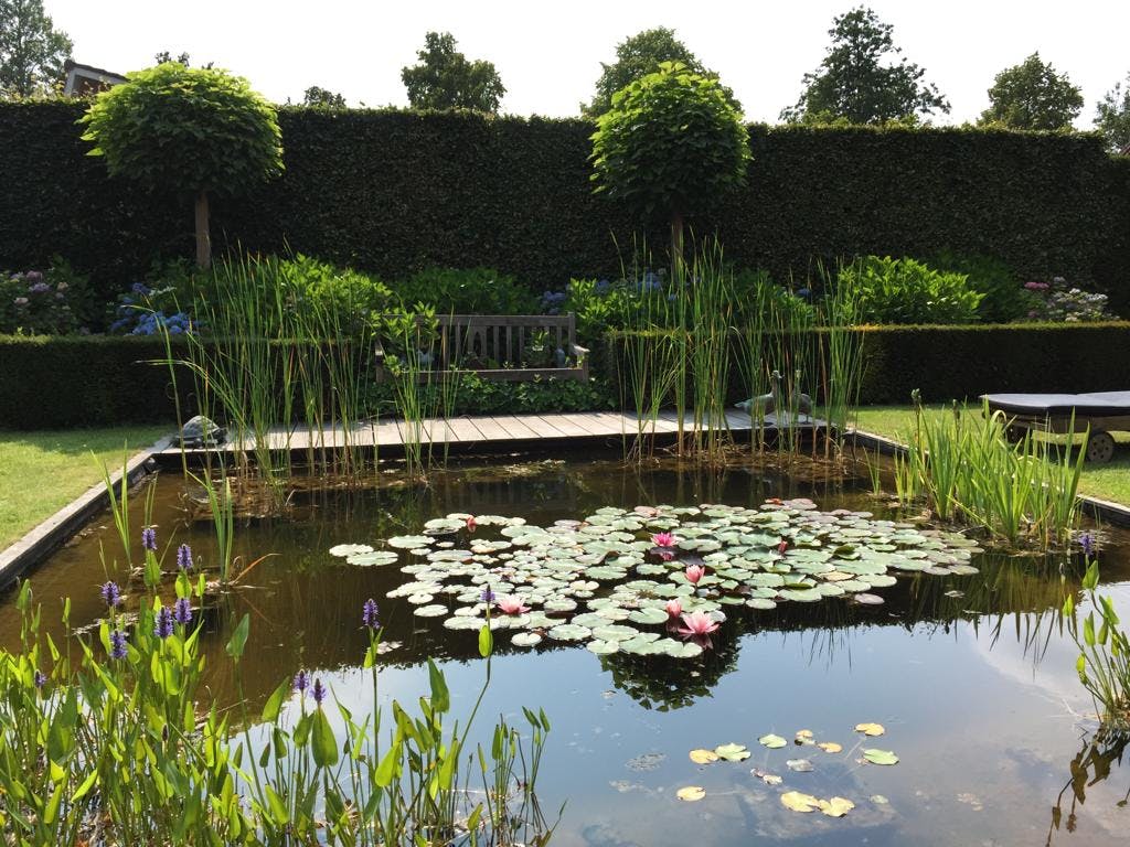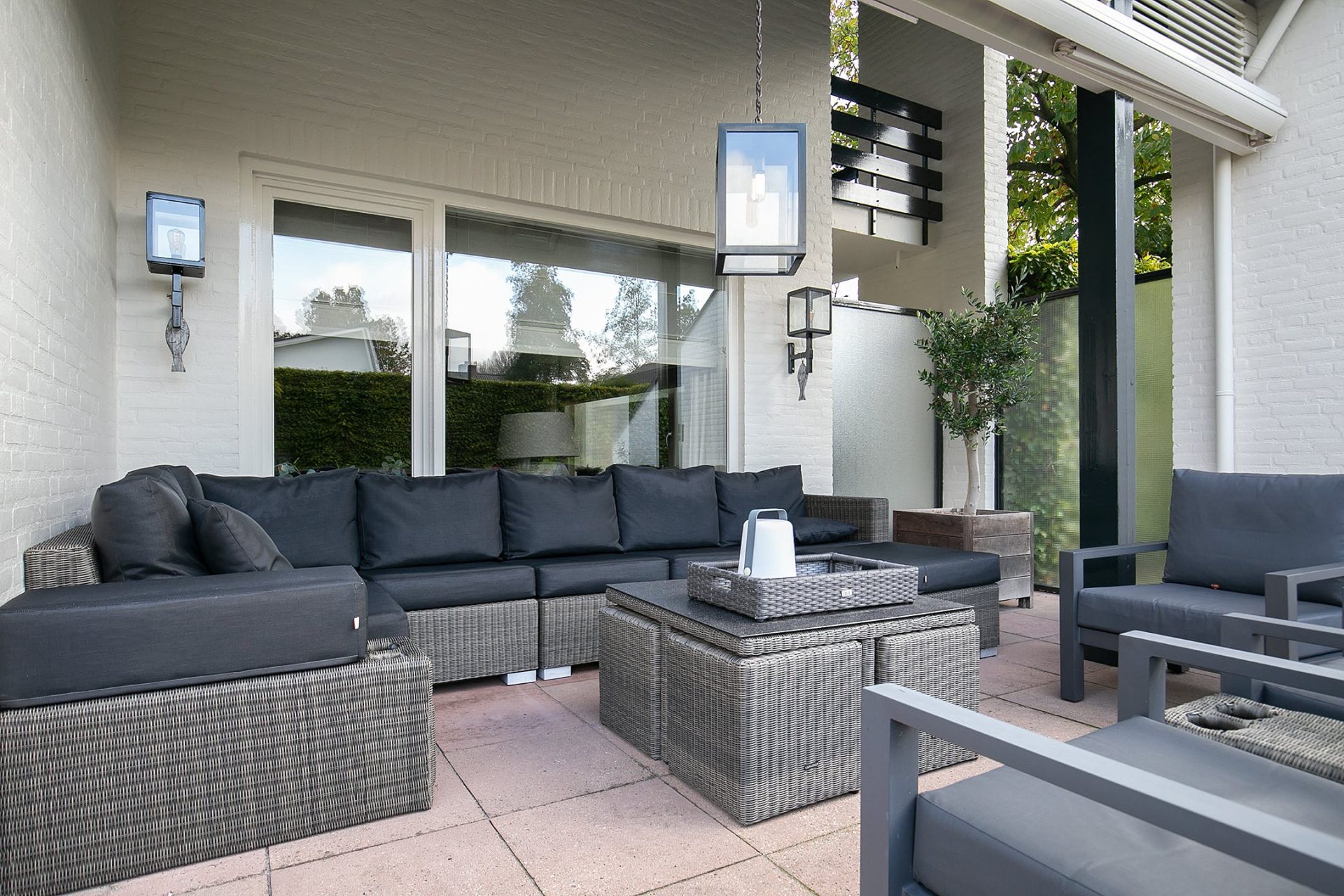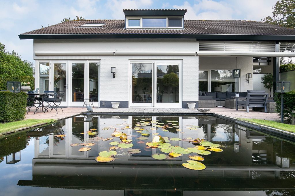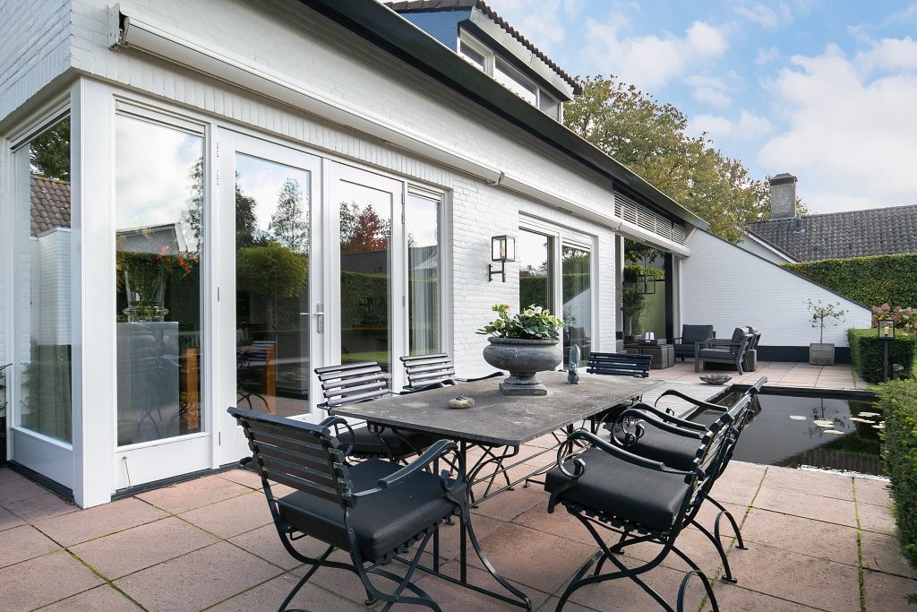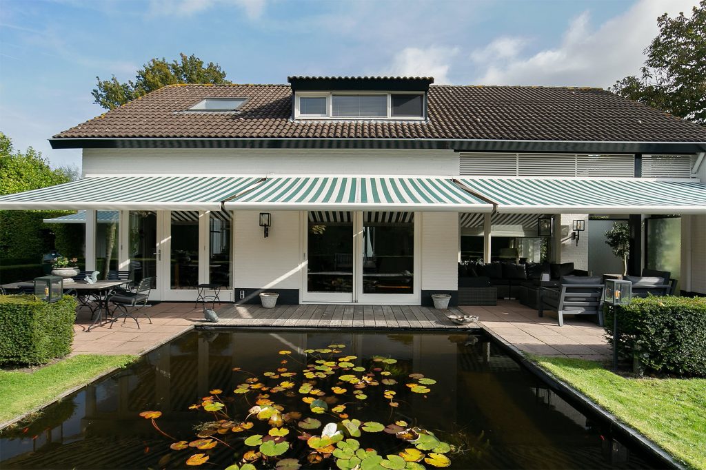 De beukenhaag aan vier zijden zorgt voor veel privacy. De achter- en zijtuin zijn ingedeeld met een groot gazon, diverse beplanting en een vierkante vijver met waterlelies. Er zijn twee terrassen aan de zuidwest kant waarvan één deels overdekt is en voorzien van terrasverwarming. Over de hele breedte zijn er elektrisch bedienbare zonneschermen waardoor u naar wens in de schaduw kunt zitten.