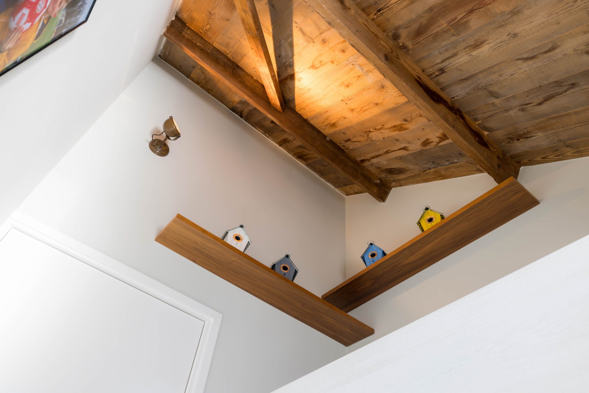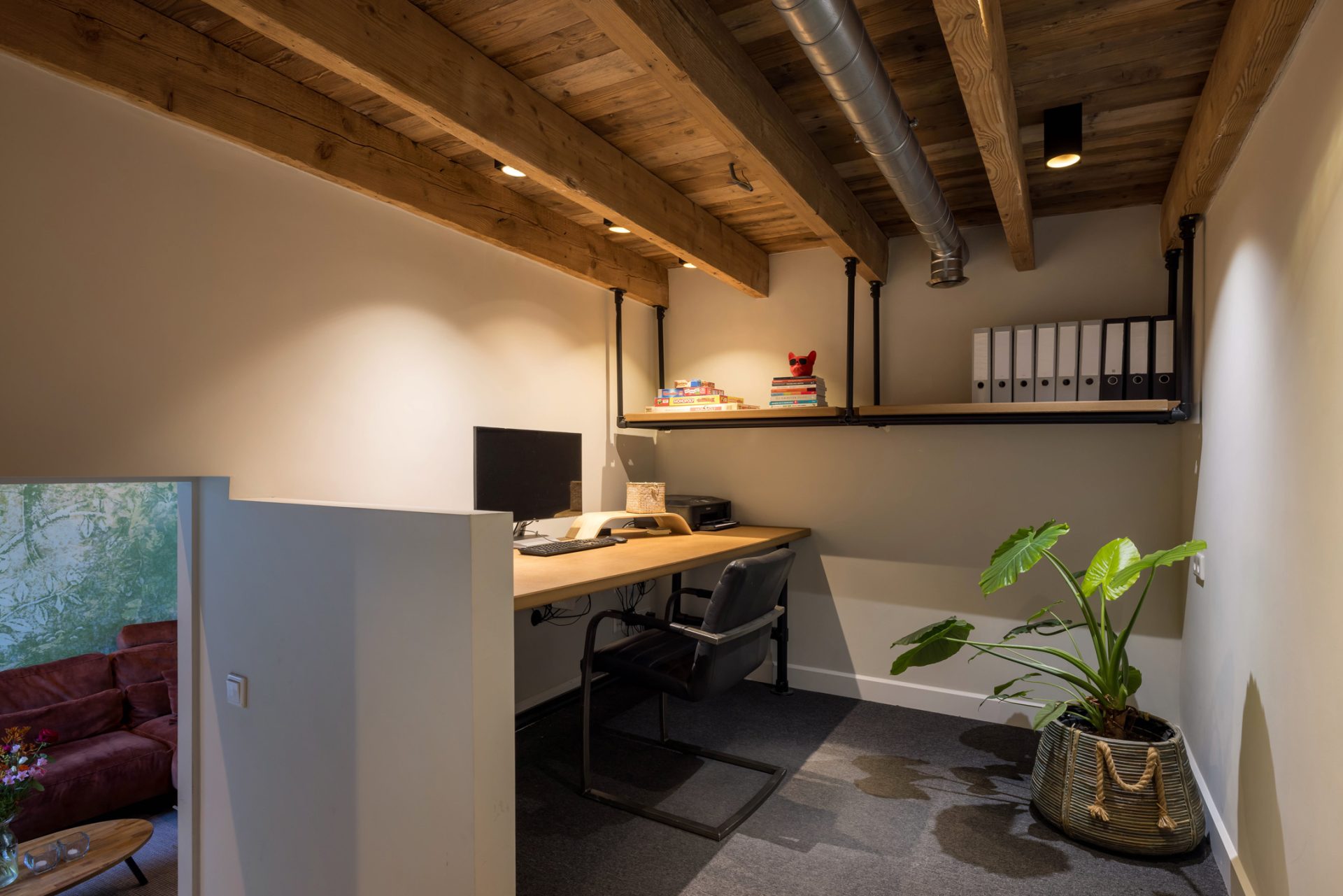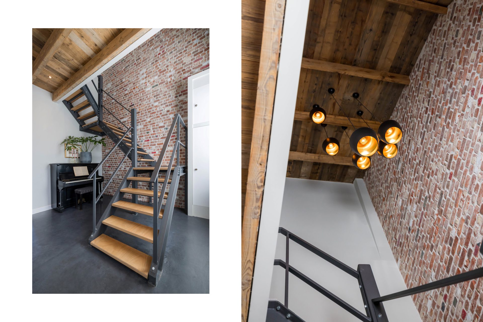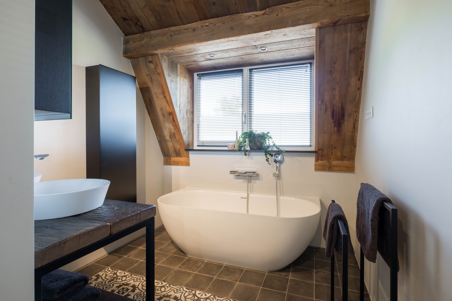 De pure schoonheid en klasse is ook zichtbaar op de eerste verdieping. Onder de vloer ligt vloerverwarming, de wanden zijn afgewerkt met stucwerk en de houten dakconstructie met oude spanten toont al haar schoonheid.