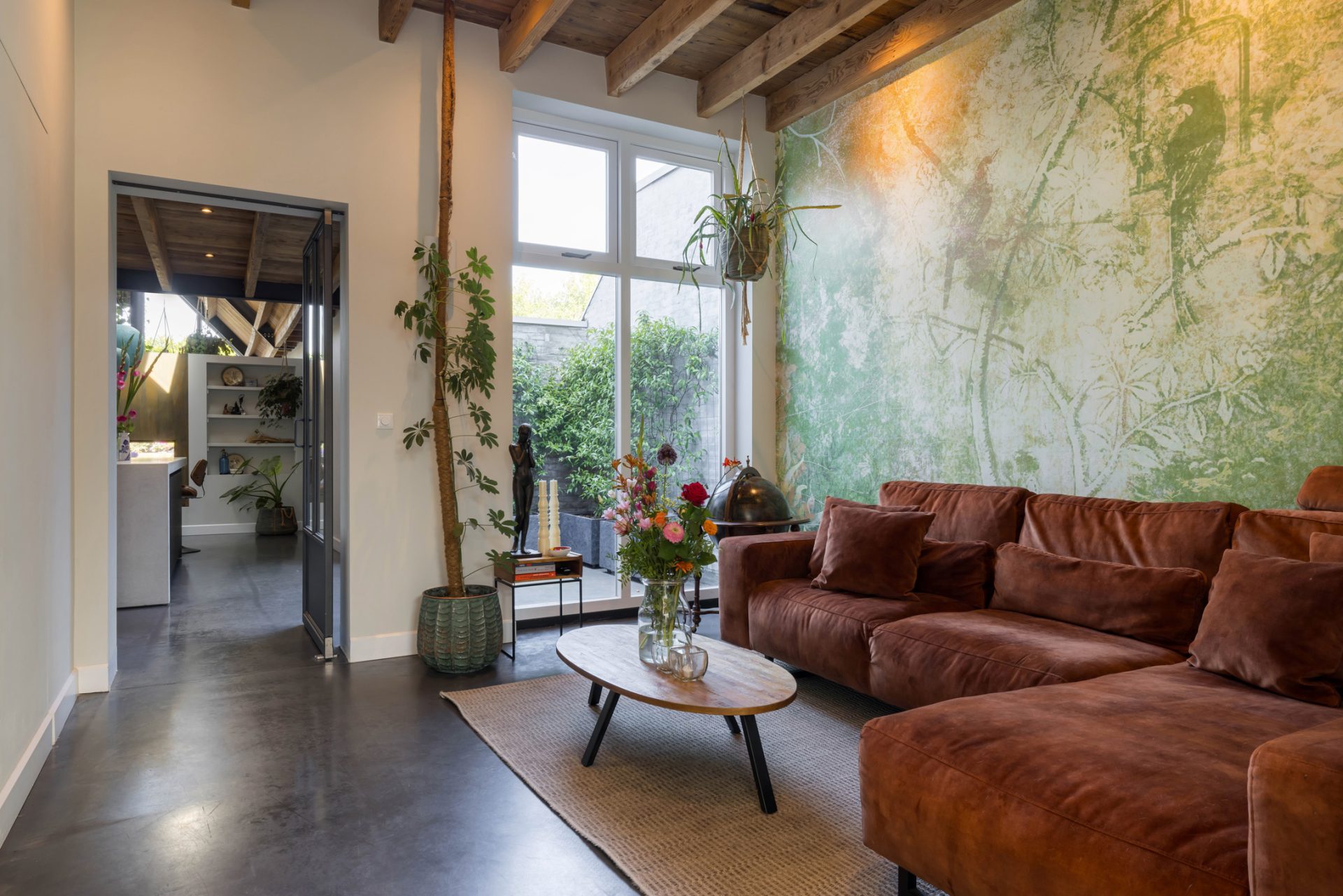 Een stalen deur verbindt de hal met de tv-kamer. Grote ramen verbinden de tv-kamer met de patio en de wand achter de bank is ontworpen door de Engelse grafisch vormgever Sophy Renou, die woont en werkt in Eindhoven. Het 3.35 meter hoge balkenplafond versterkt het ruimtelijke gevoel en rechts van de tv is een deur naar de opkamer, die als werkruimte in gebruik is.