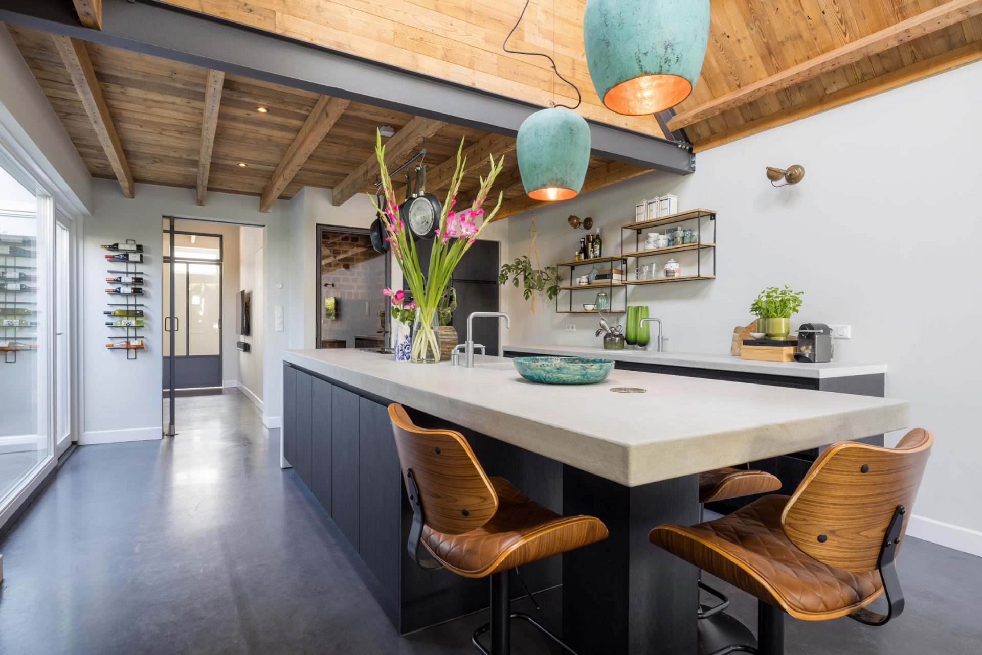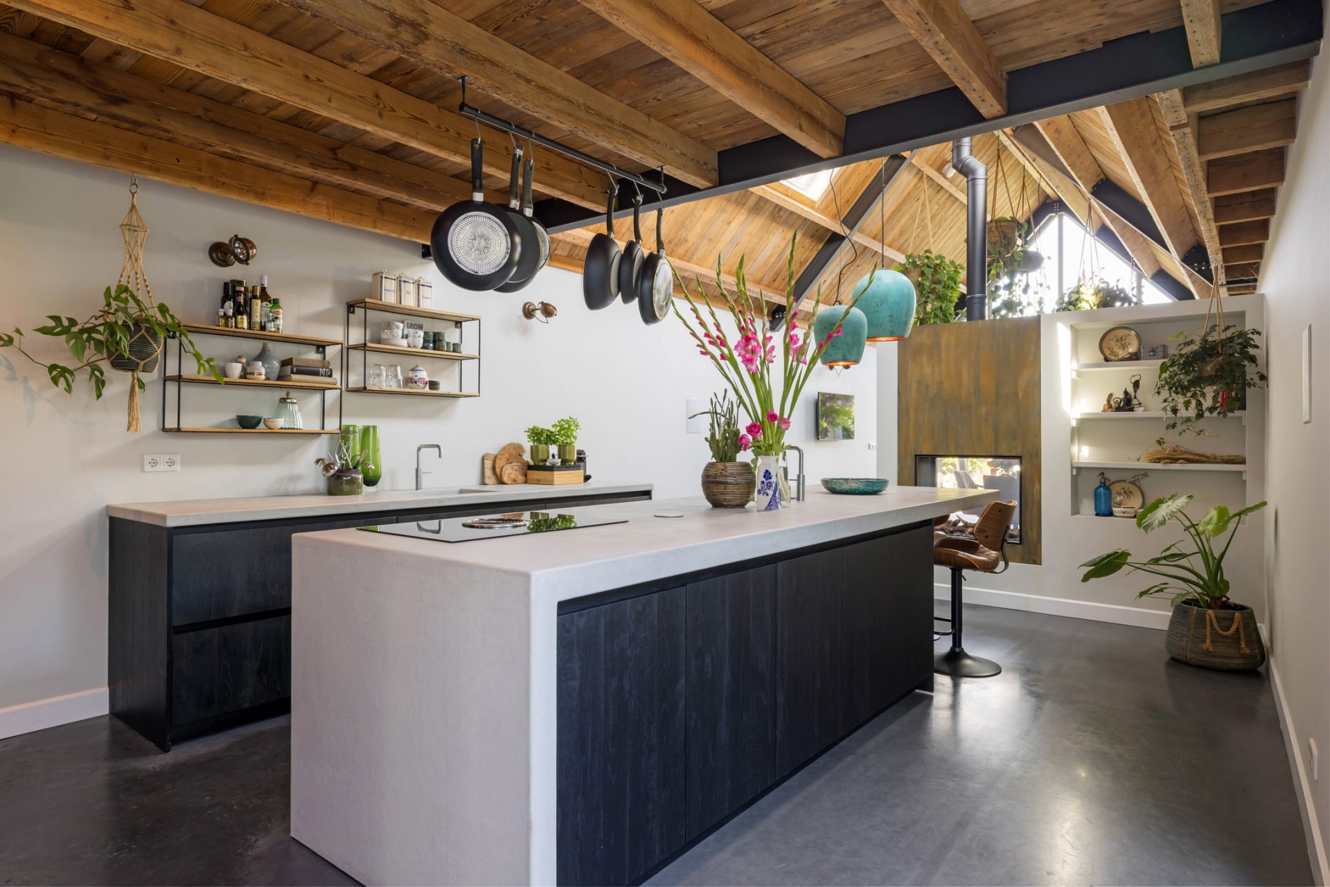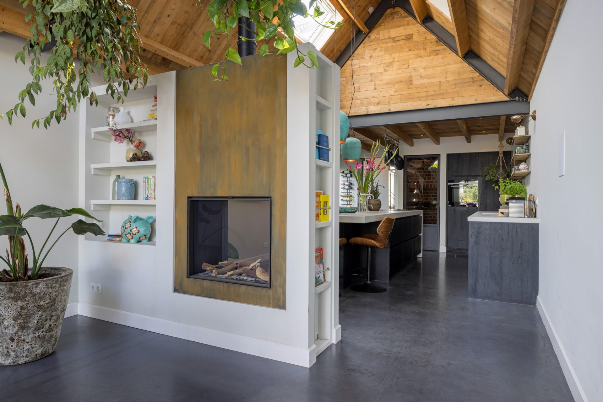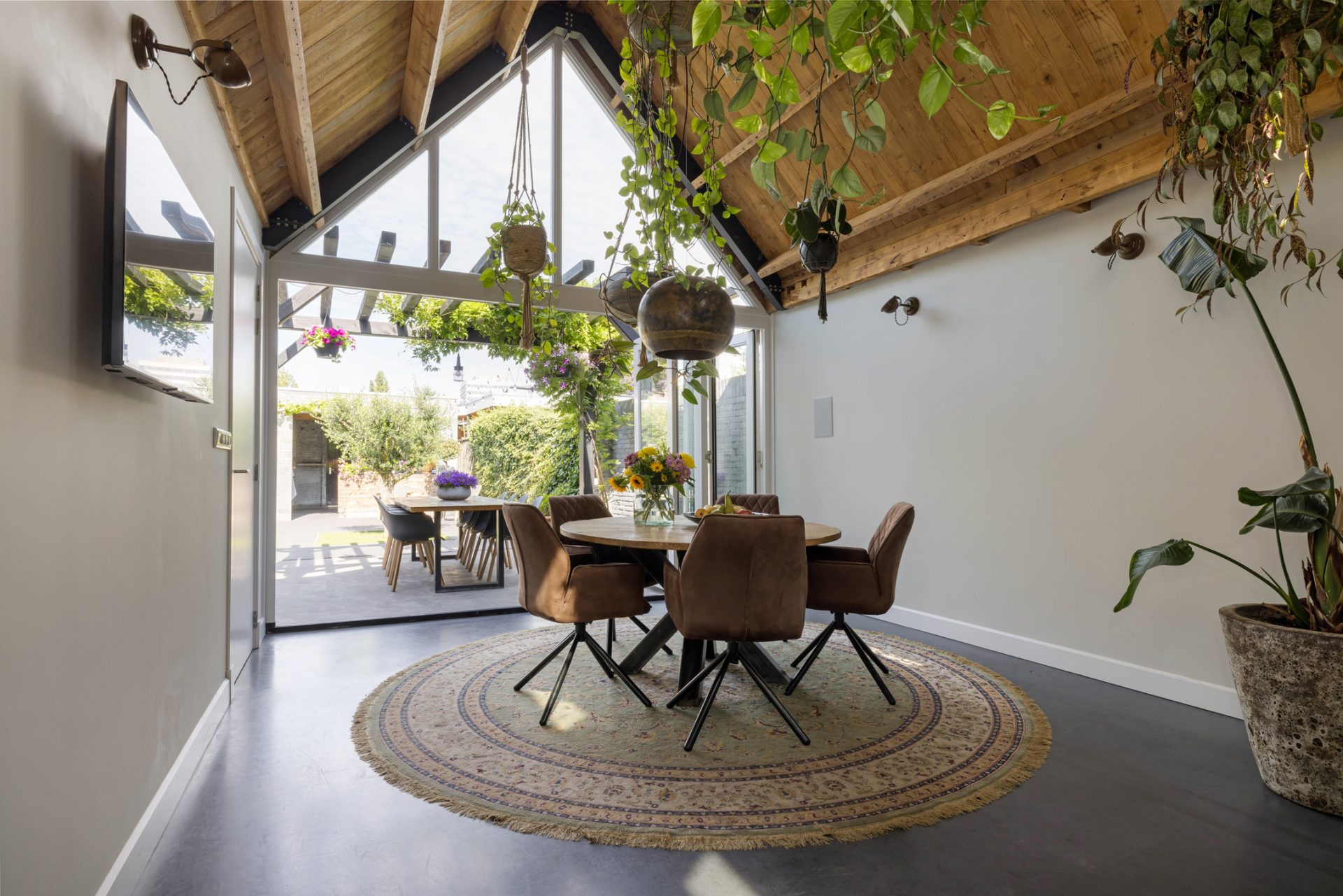 In de woonkeuken en eetkamer vormt het vele hout een mooie combinatie met de zwarte, stalen spanten en de gepolijste betonvloer met vloerverwarming. De gashaard met ontspiegeld glas is niet alleen vanuit de keuken, maar ook vanuit de eetkamer te bewonderen. Als je de harmonicadeuren in de grote achterpui opent, stap je de achtertuin in. Het luxe toilet met portaal is gesitueerd in de hoek van de eetkamer.